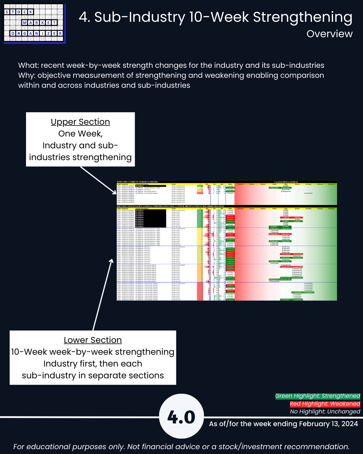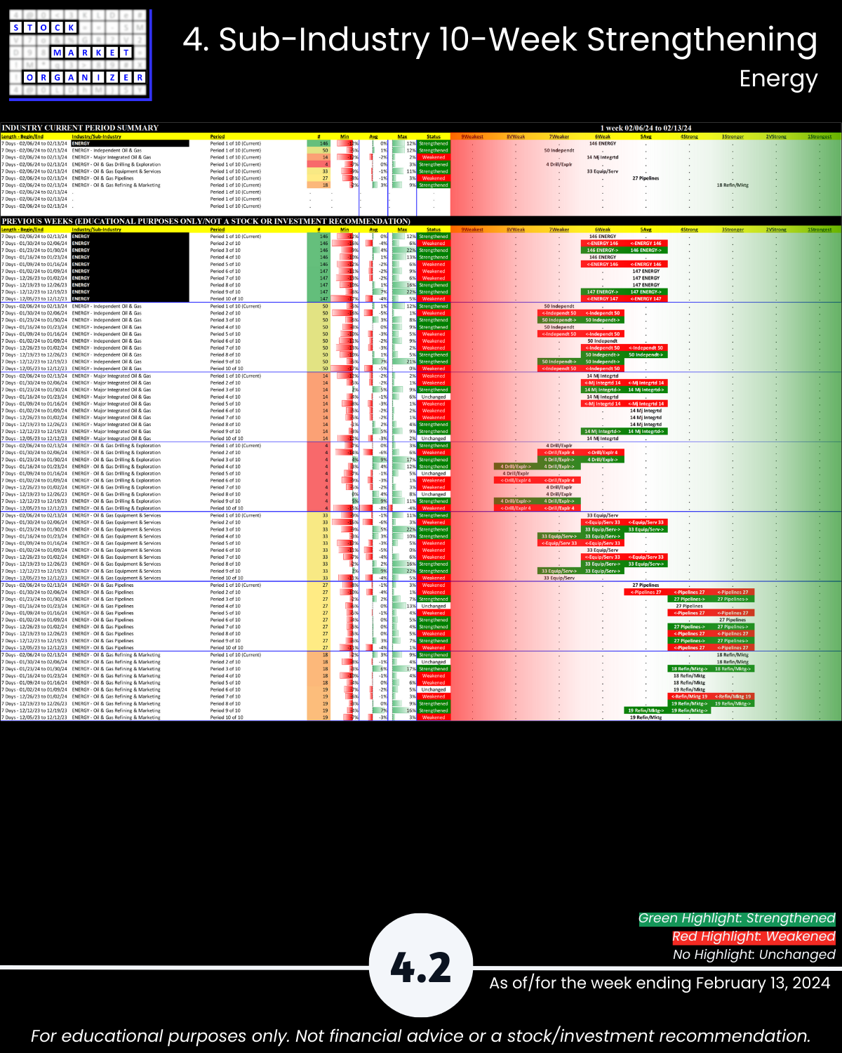 🔹 How all stocks in each sub-industry and industry stack up against each other in terms of current strengthening and weakening. These relationships may not continue, but it’s hard to meaningfully discern where you could go if you don’t know where you currently are. This analysis enables you to quickly see the best and worst stocks and ignore the rest.