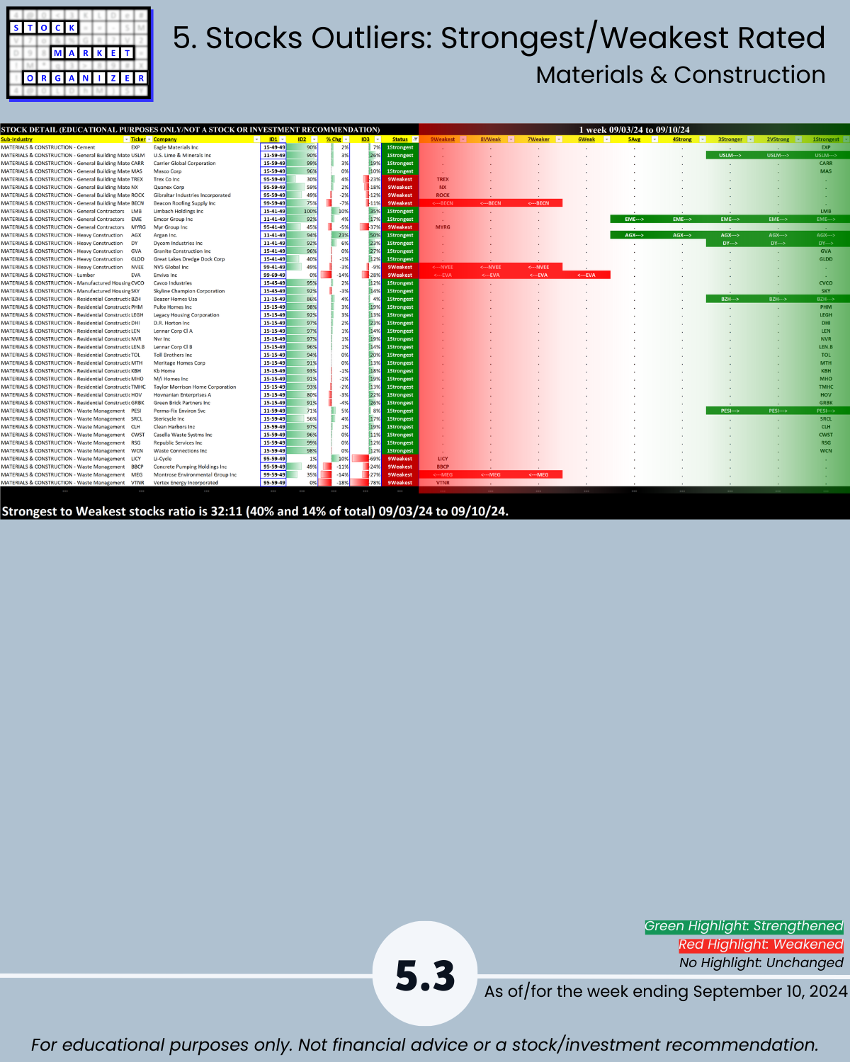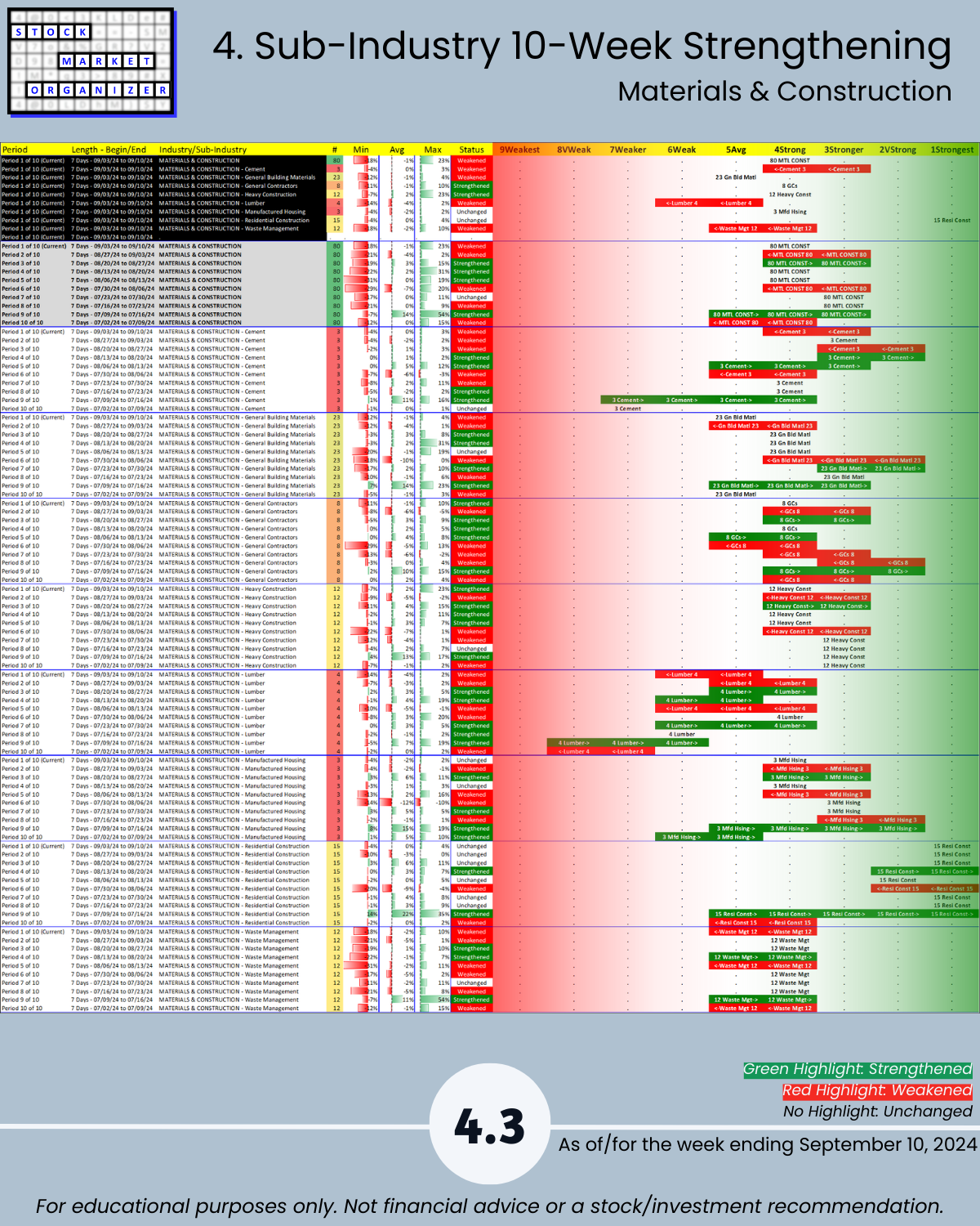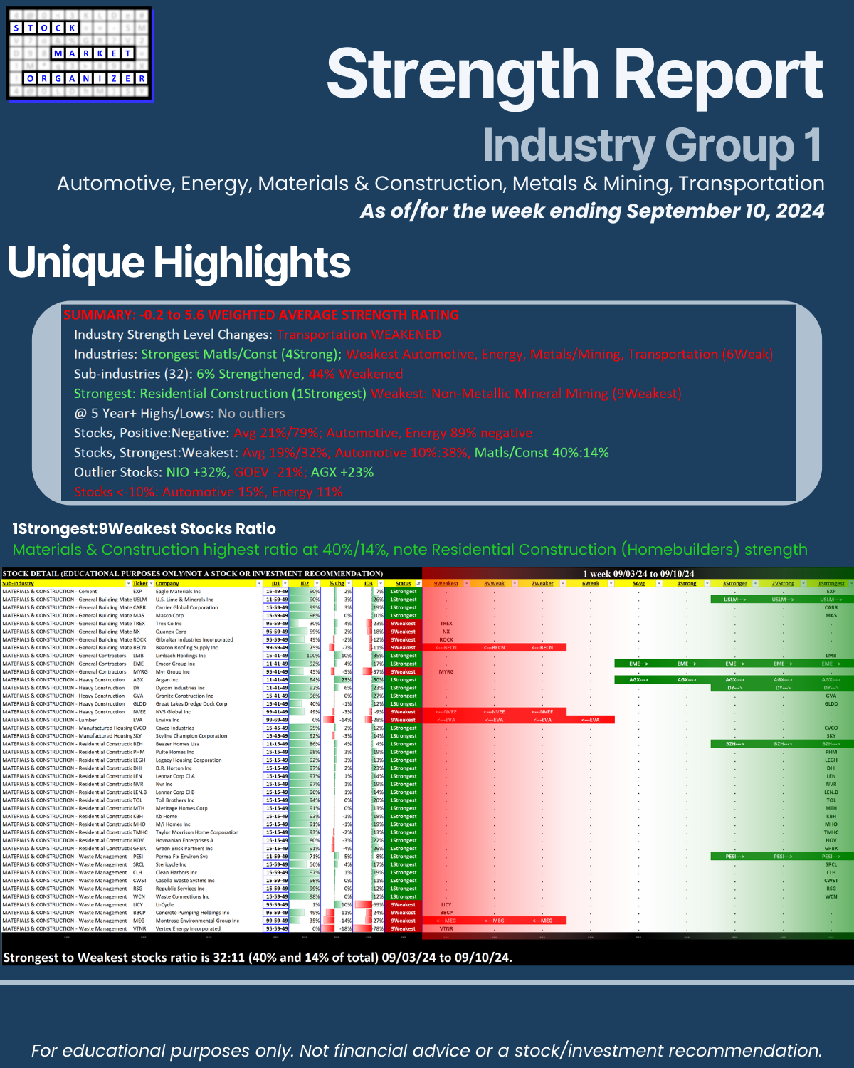 Got U.S. stock market context? Here's a unique report covering and directly comparing strengthening and weakening in the Automotive, Energy, Materials & Construction, Metals & Mining, and Transportation industries. Cover highlight: the strongest and weakest individual stocks within the Materials & Construction industry. Hopefully your portfolio has been filled with Homebuilders stocks - Residential Construction in Materials & Construction is the strongest sub-industry, ranked 1Strongest (highest of 9 levels).
