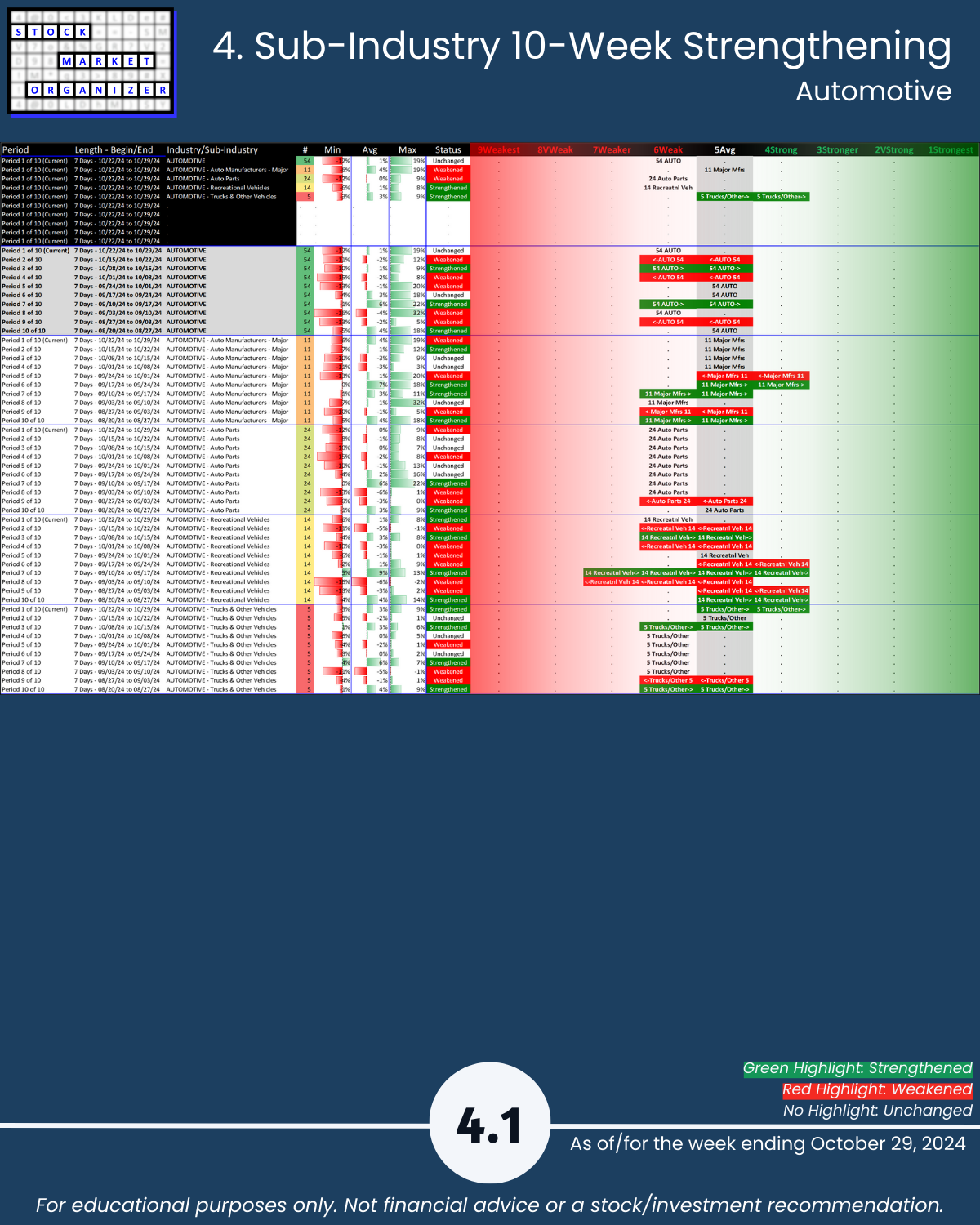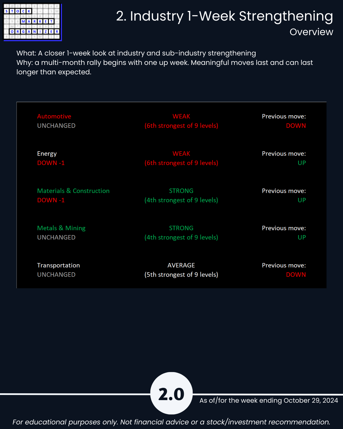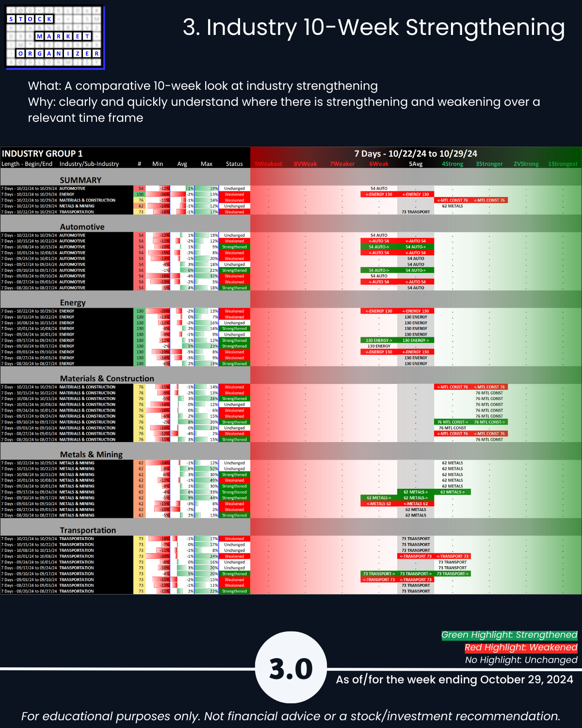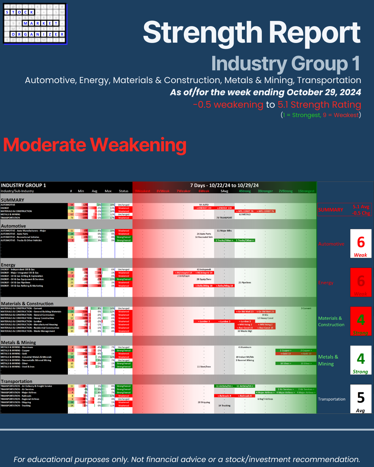 If you are interested in stacking strength as much as possible at the stock, sub-industry, industry, sector, and market levels, this report is for you. Below: the as of/for the week ending 10/29/24 Stock Market Organizer Industry Group 1 Strength Report, which covers the Automotive, Energy, Materials & Construction, Metals & Mining, and Transportation industries.