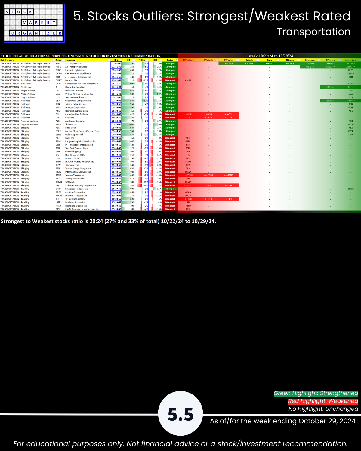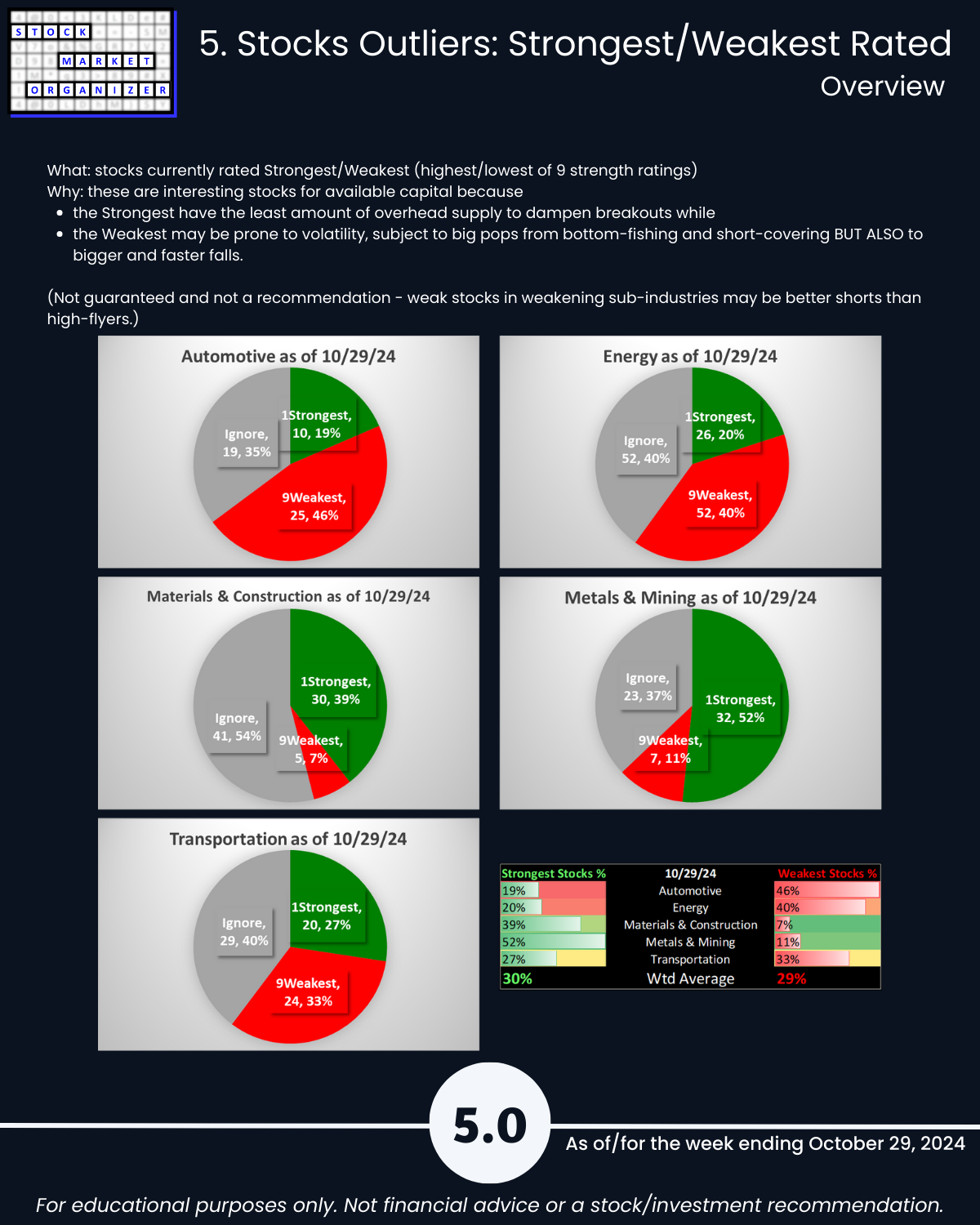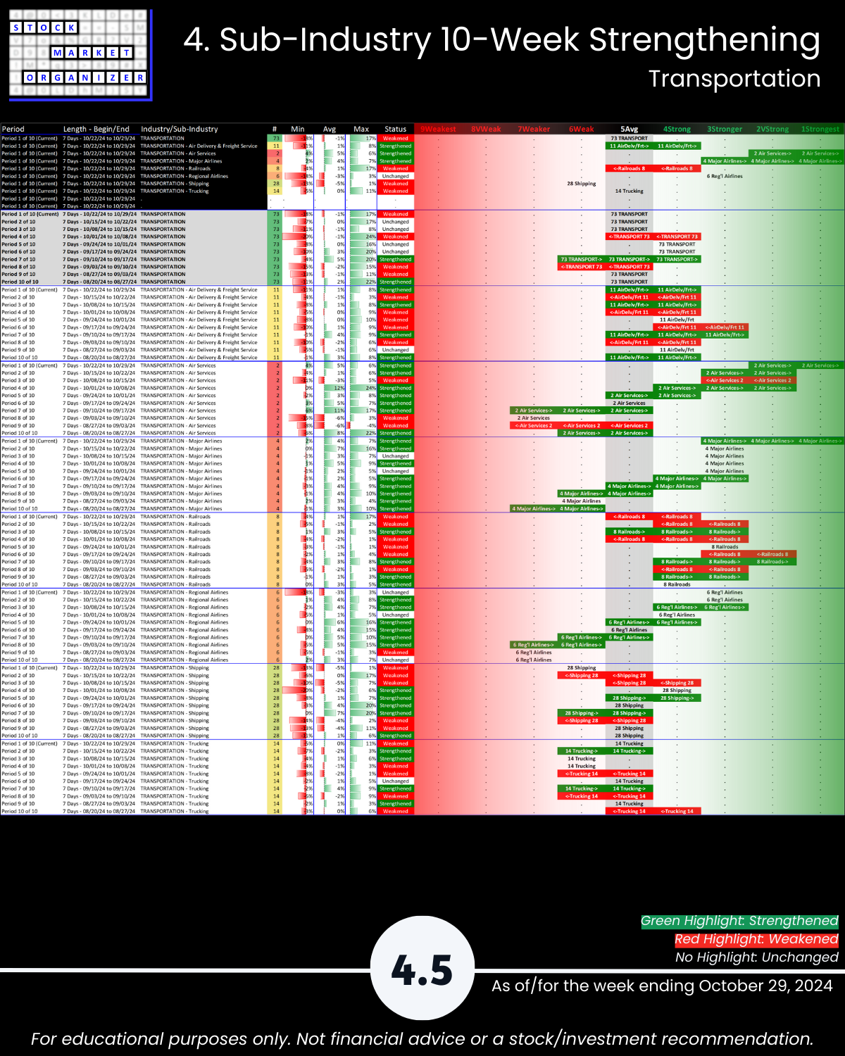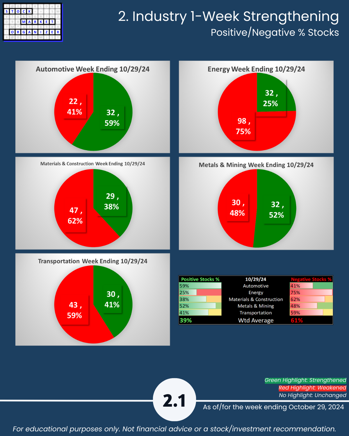If you are interested in stacking strength as much as possible at the stock, sub-industry, industry, sector, and market levels, this report is for you. Below: the as of/for the week ending 10/29/24 Stock Market Organizer Industry Group 1 Strength Report, which covers the Automotive, Energy, Materials & Construction, Metals & Mining, and Transportation industries.