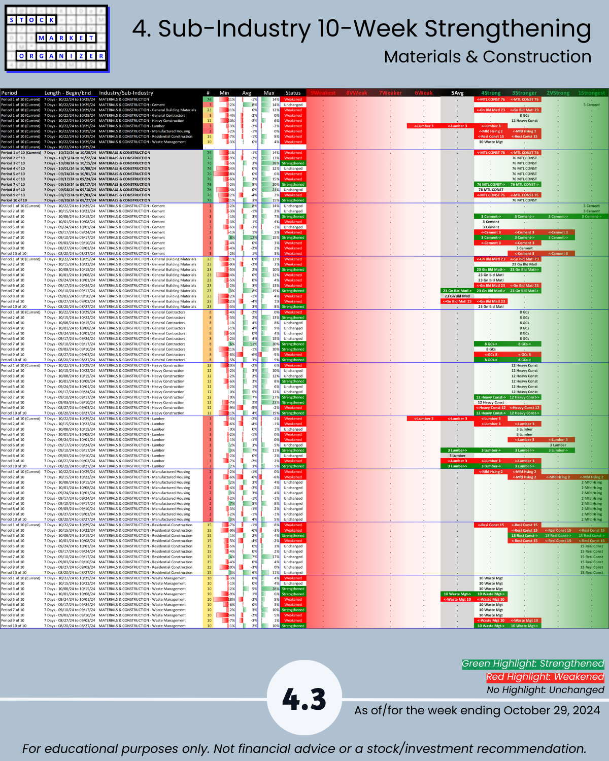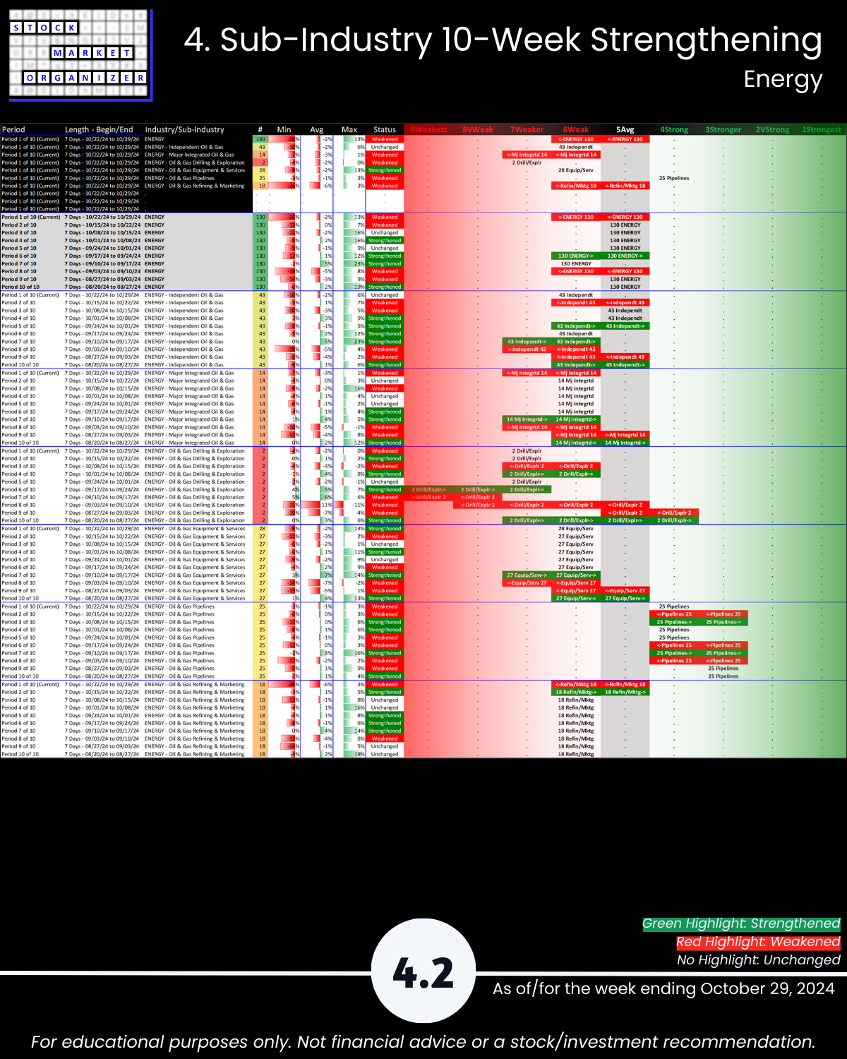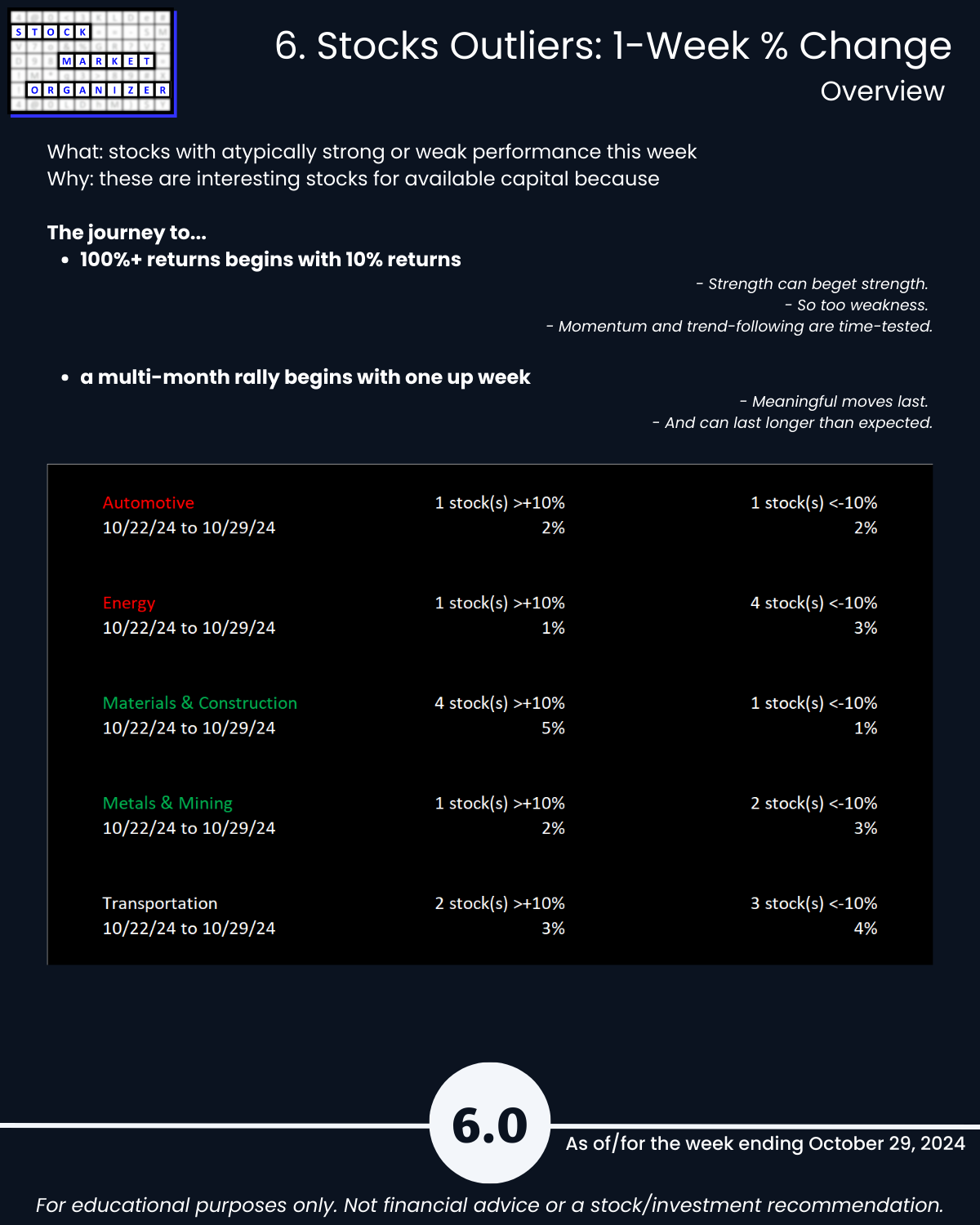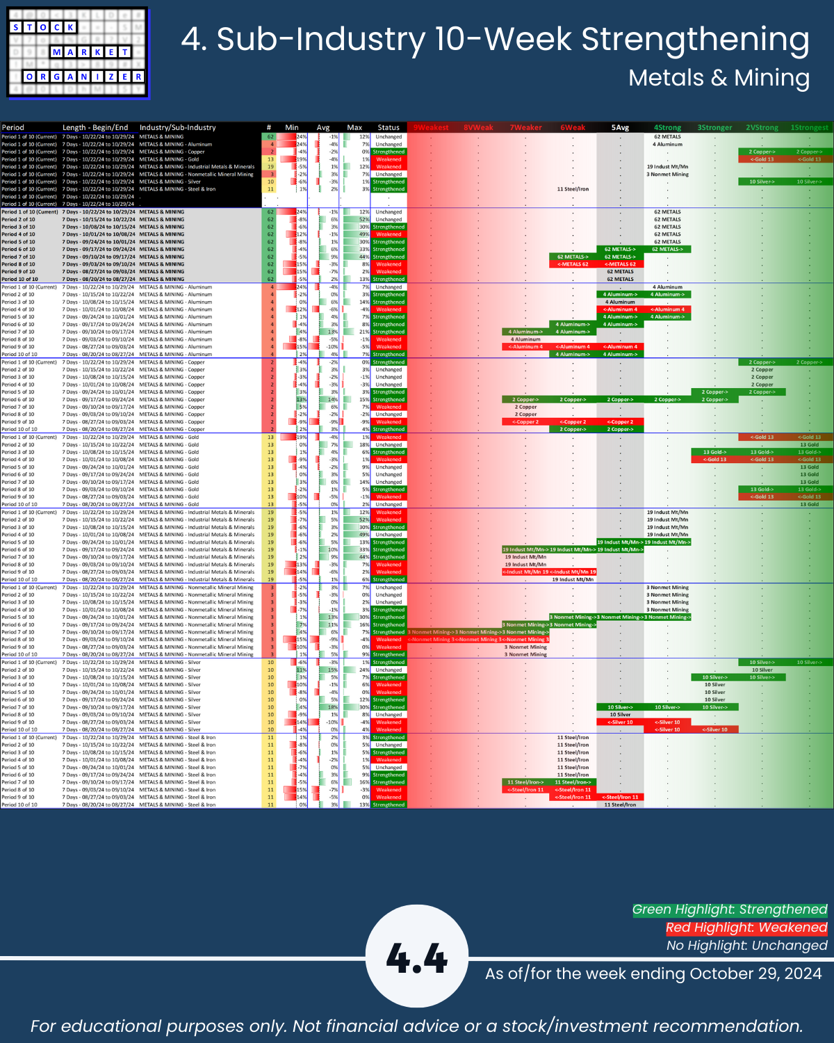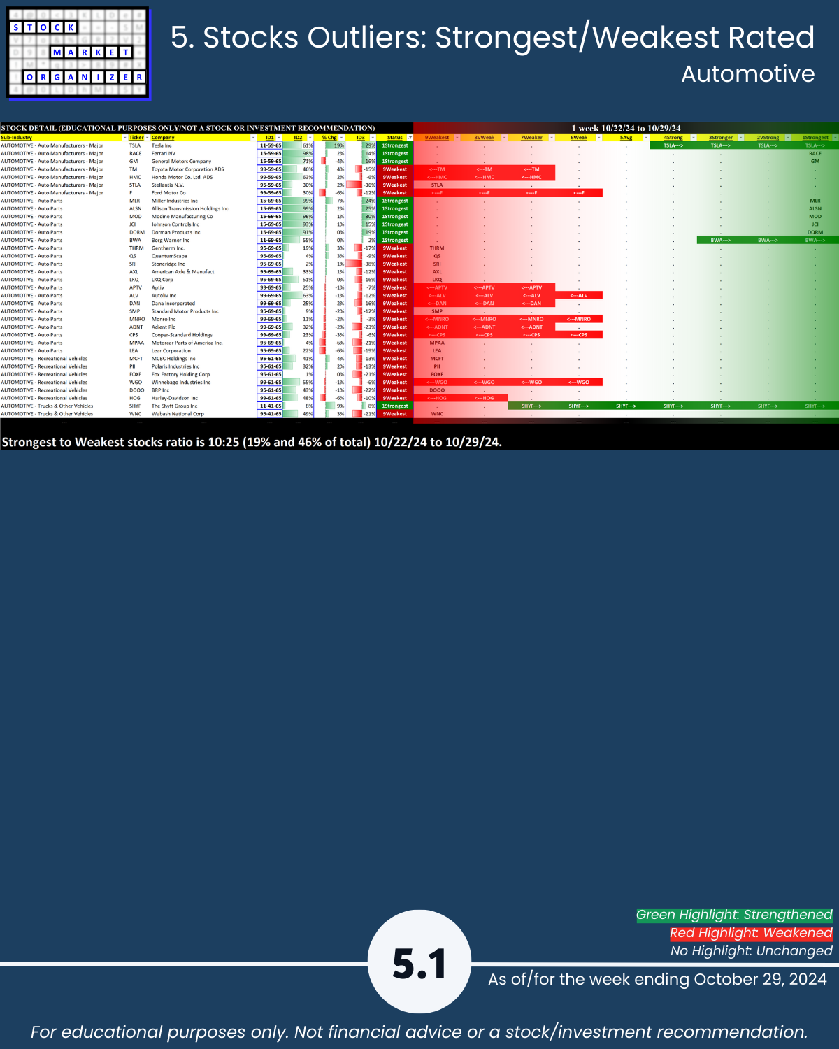 If you are interested in stacking strength as much as possible at the stock, sub-industry, industry, sector, and market levels, this report is for you. Below: the as of/for the week ending 10/29/24 Stock Market Organizer Industry Group 1 Strength Report, which covers the Automotive, Energy, Materials & Construction, Metals & Mining, and Transportation industries.