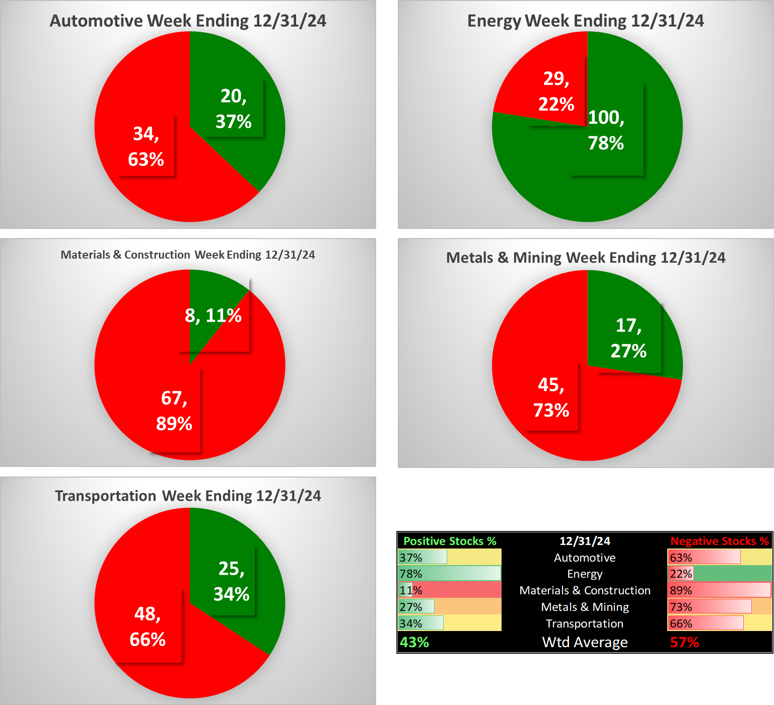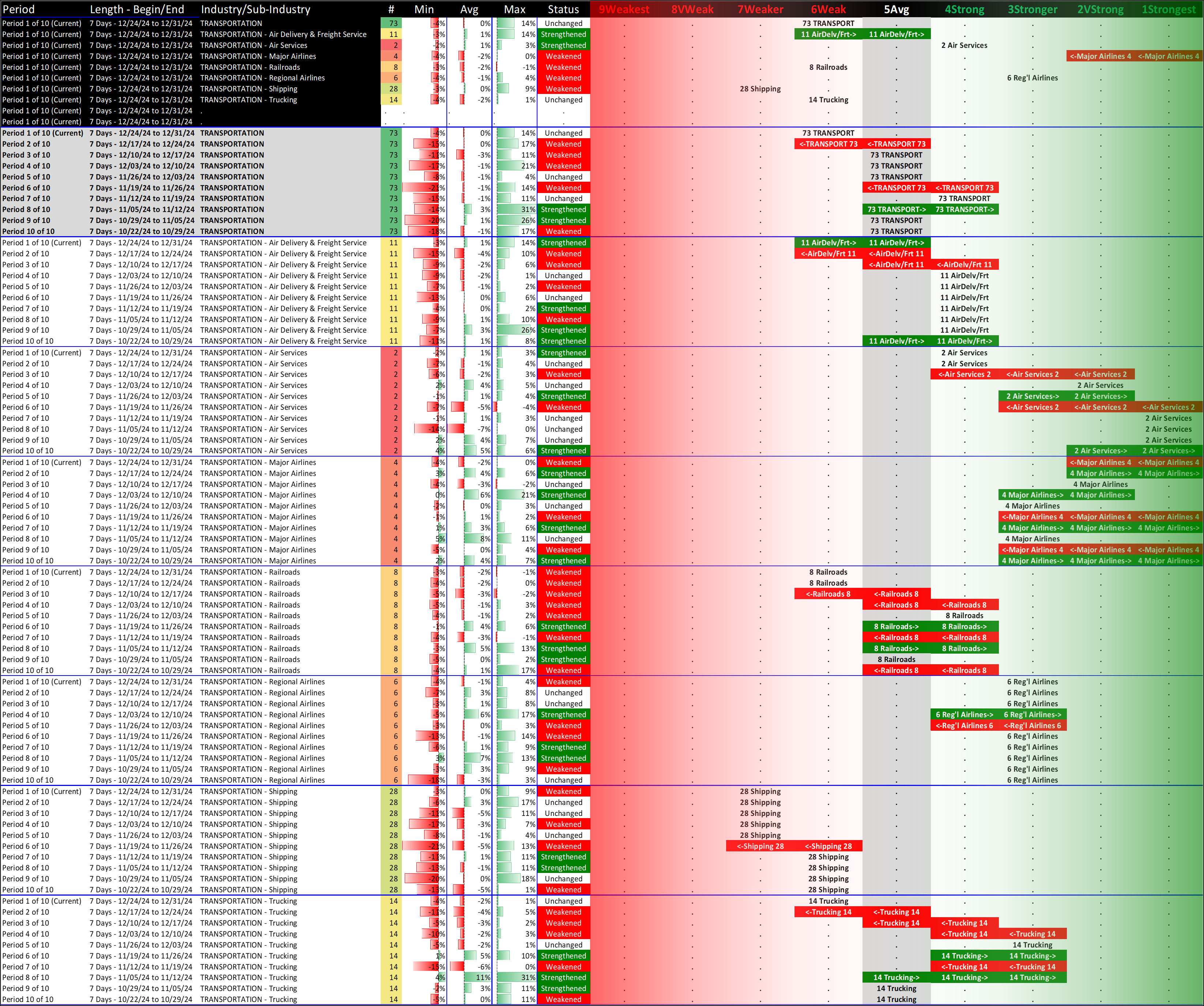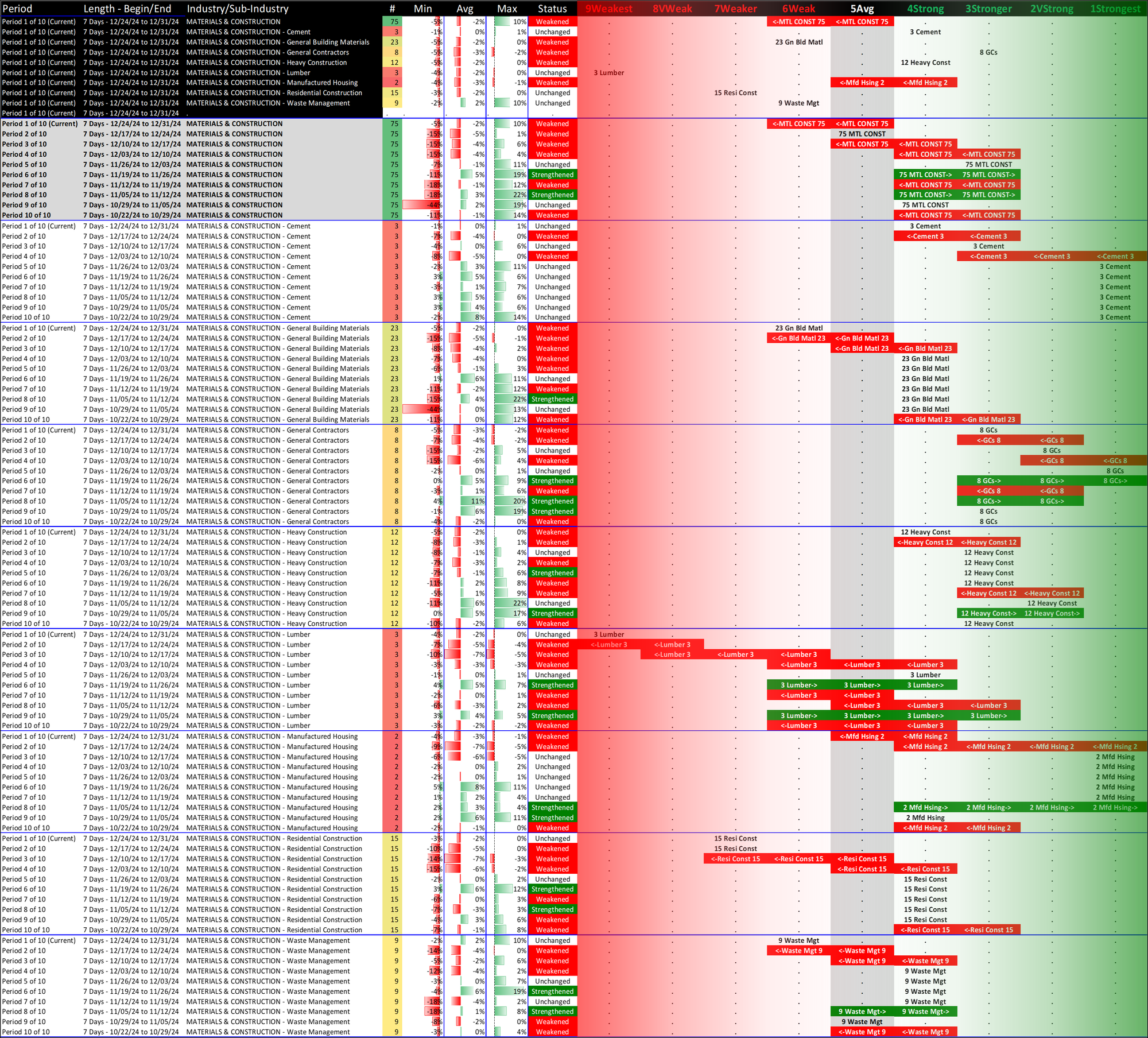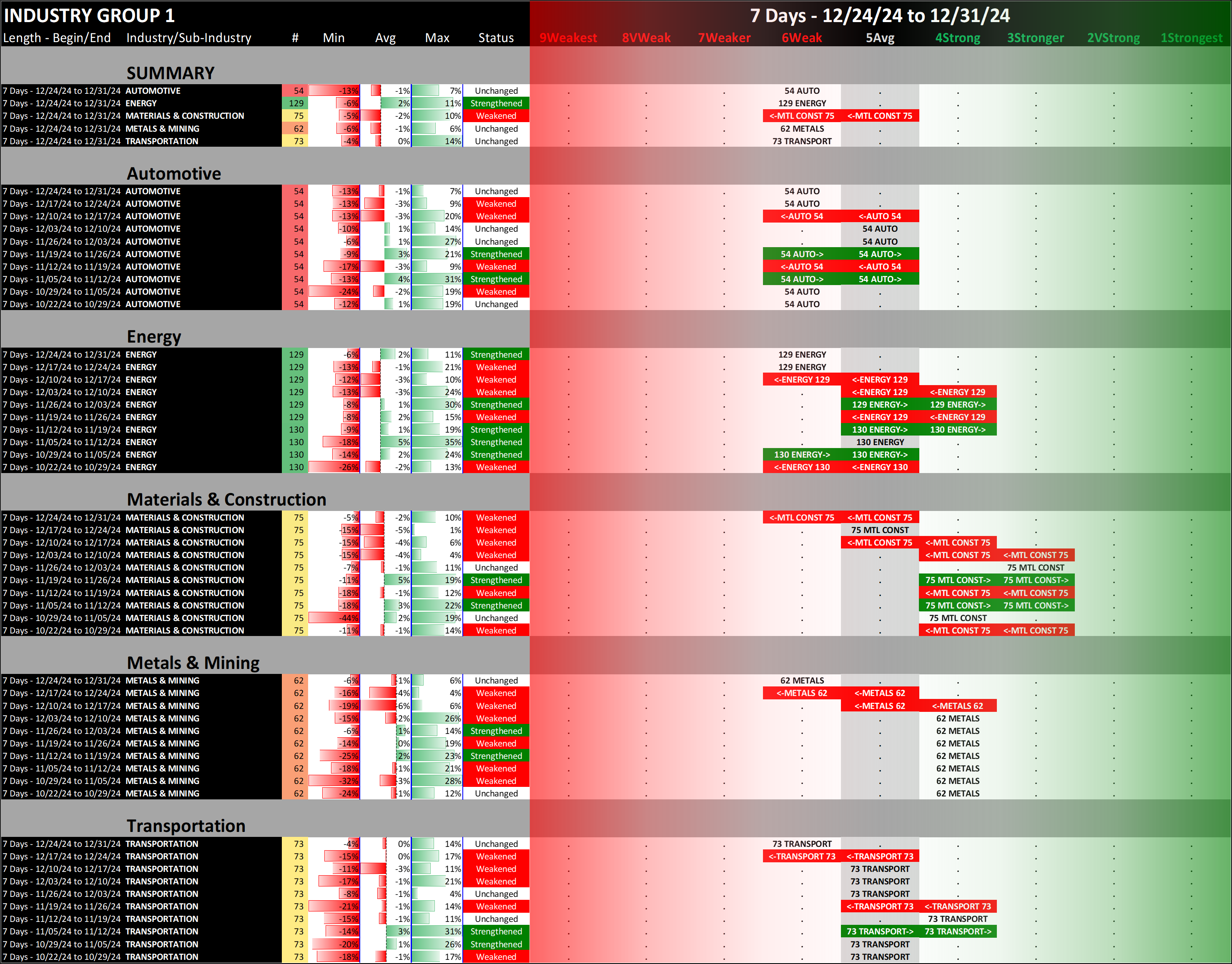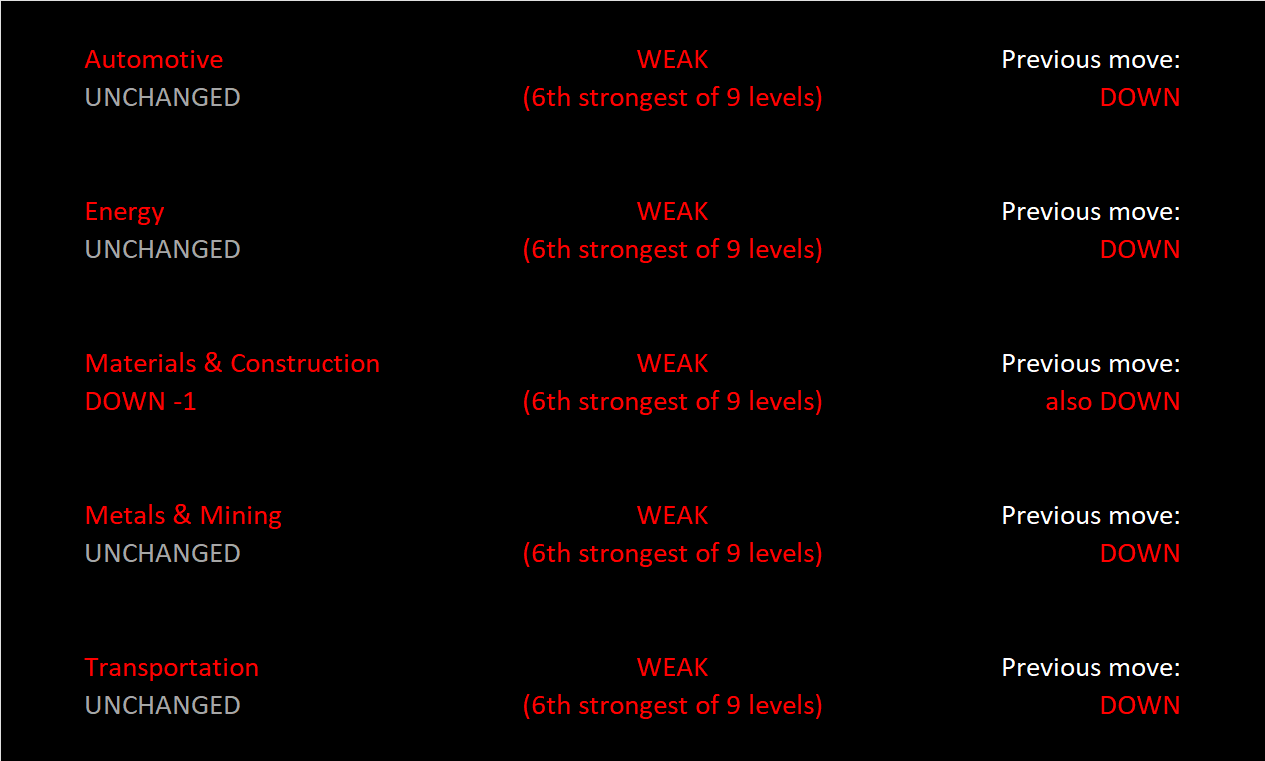 All industries are at 6Weak, with four unchanged at that level for the week (Automotive, Energy, Metals & Mining, and Transportation) while Materials & Construction fell one strength level.