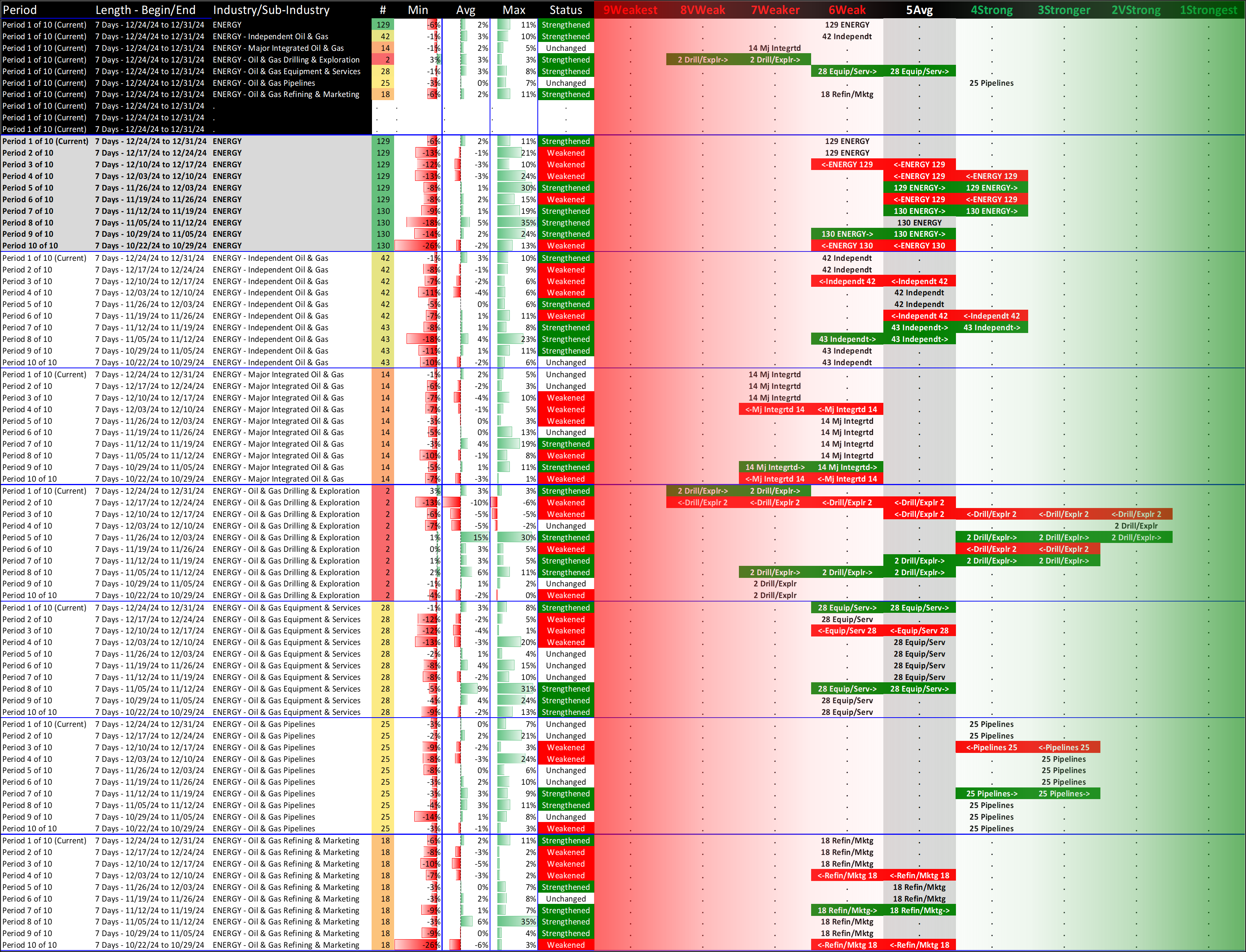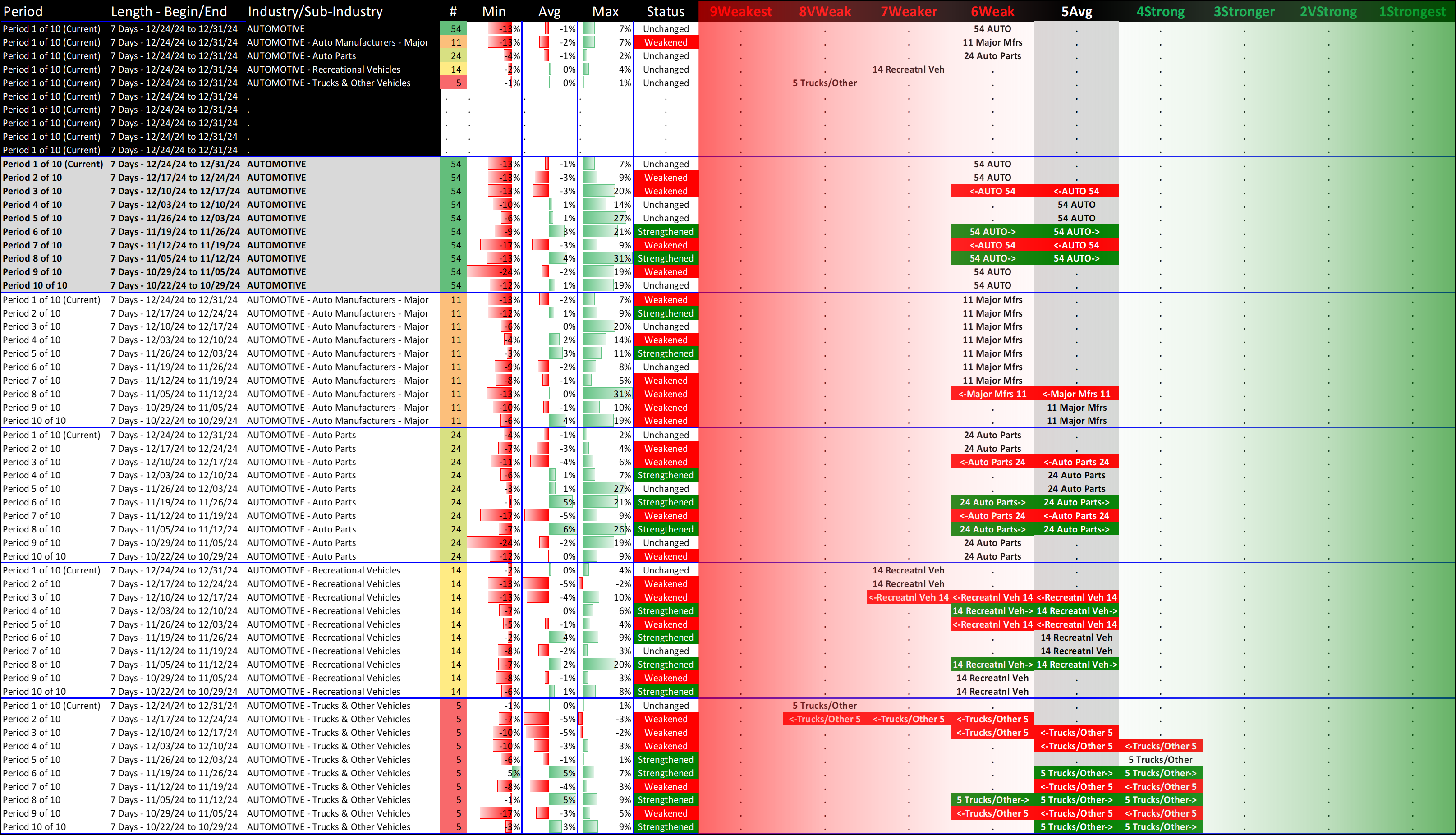 What: recent week-by-week strength changes for the industry and its sub-industries