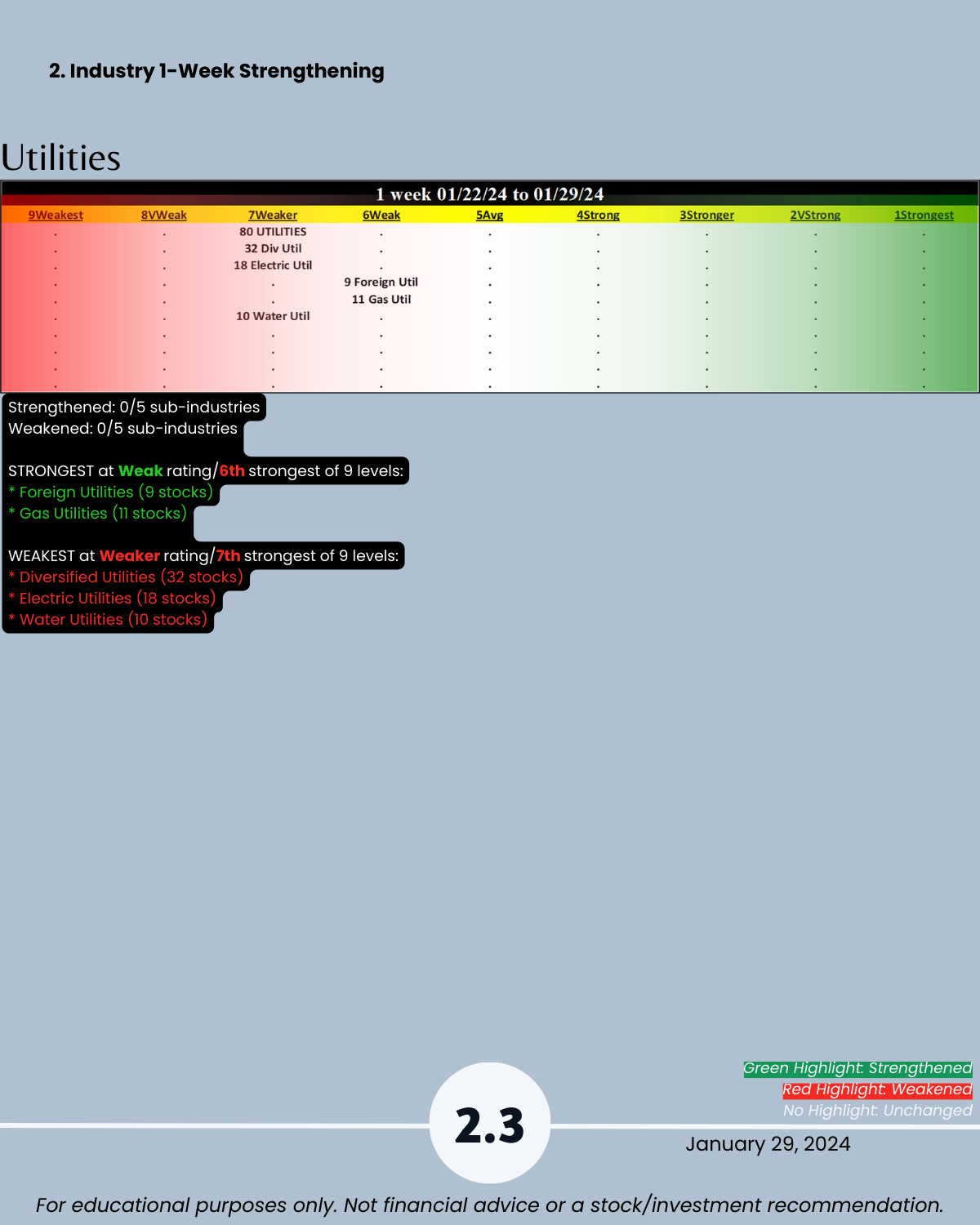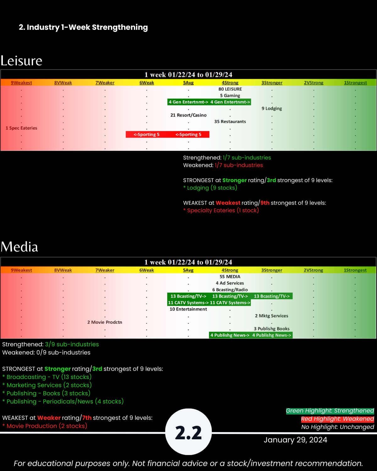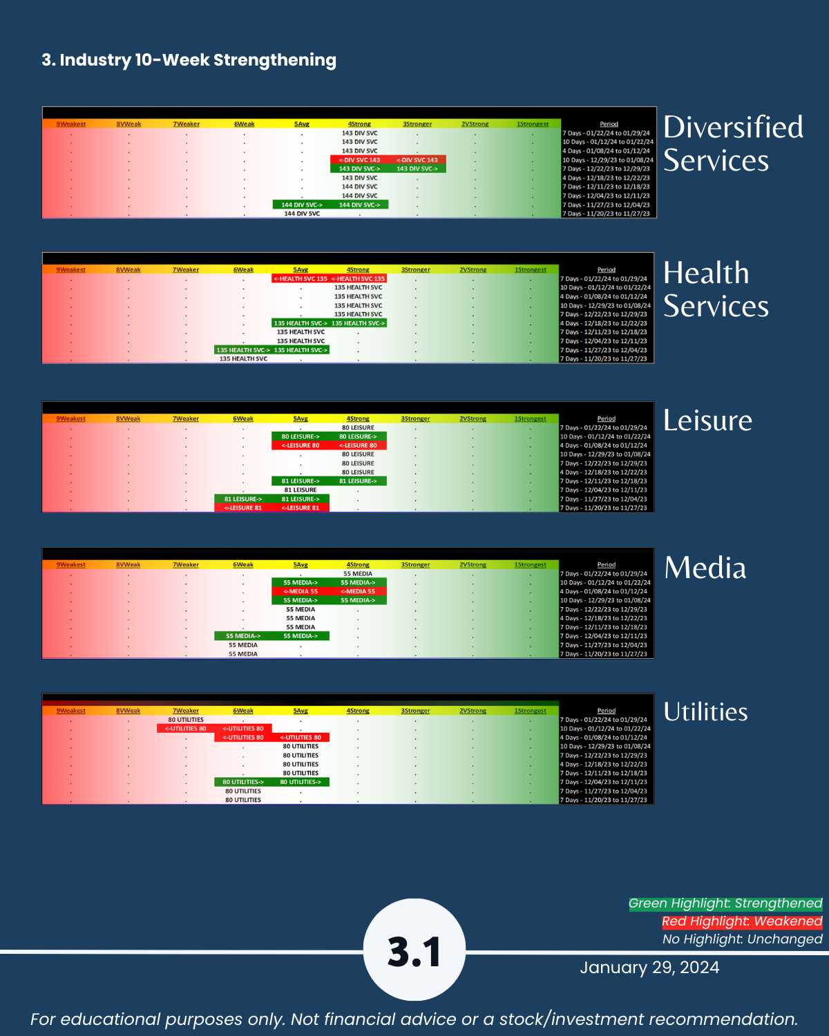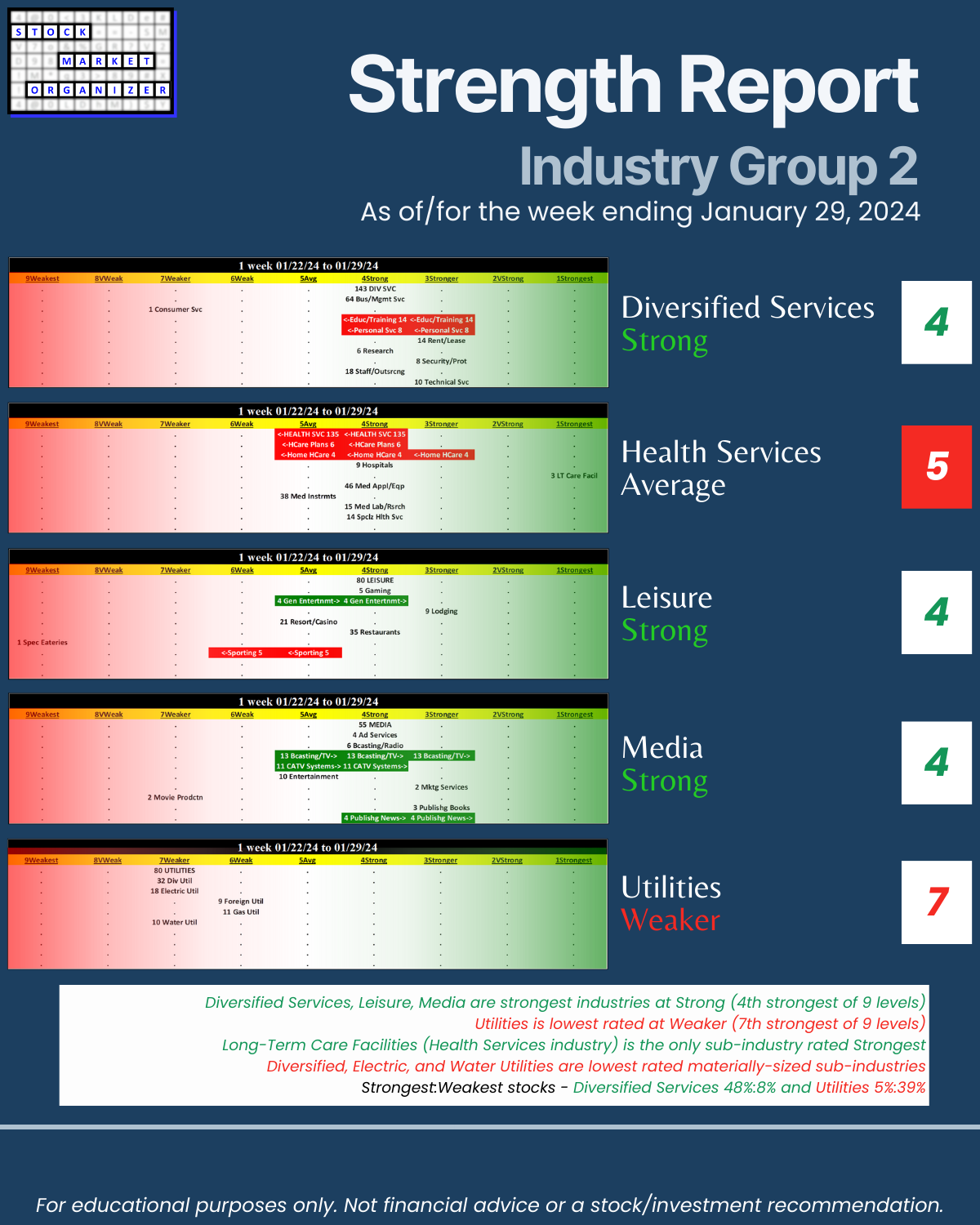 Attached: 1/29/24 Strongest- and Weakest-rated Stock Market Organizer stocks and objective strengthening/weakening measurements in the Diversified Services, Health Services, Leisure, Media, and Utilities industries.