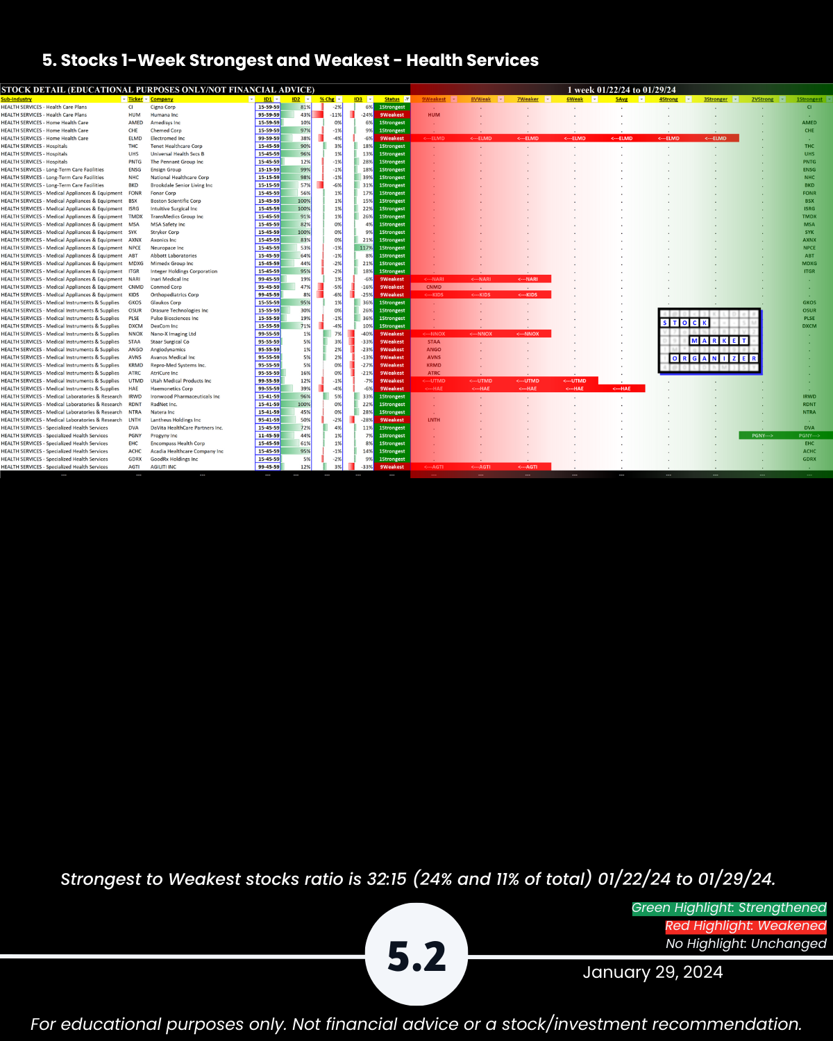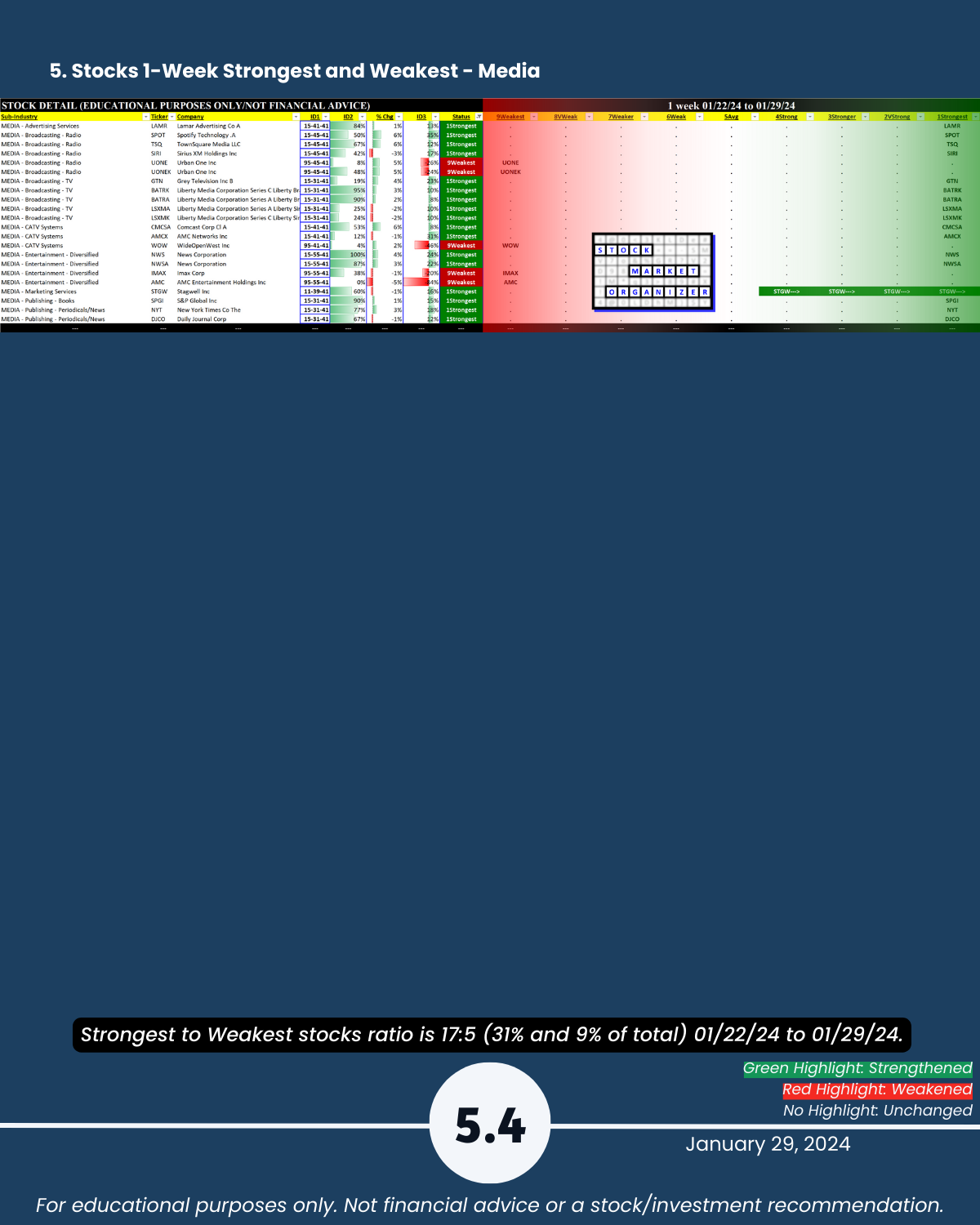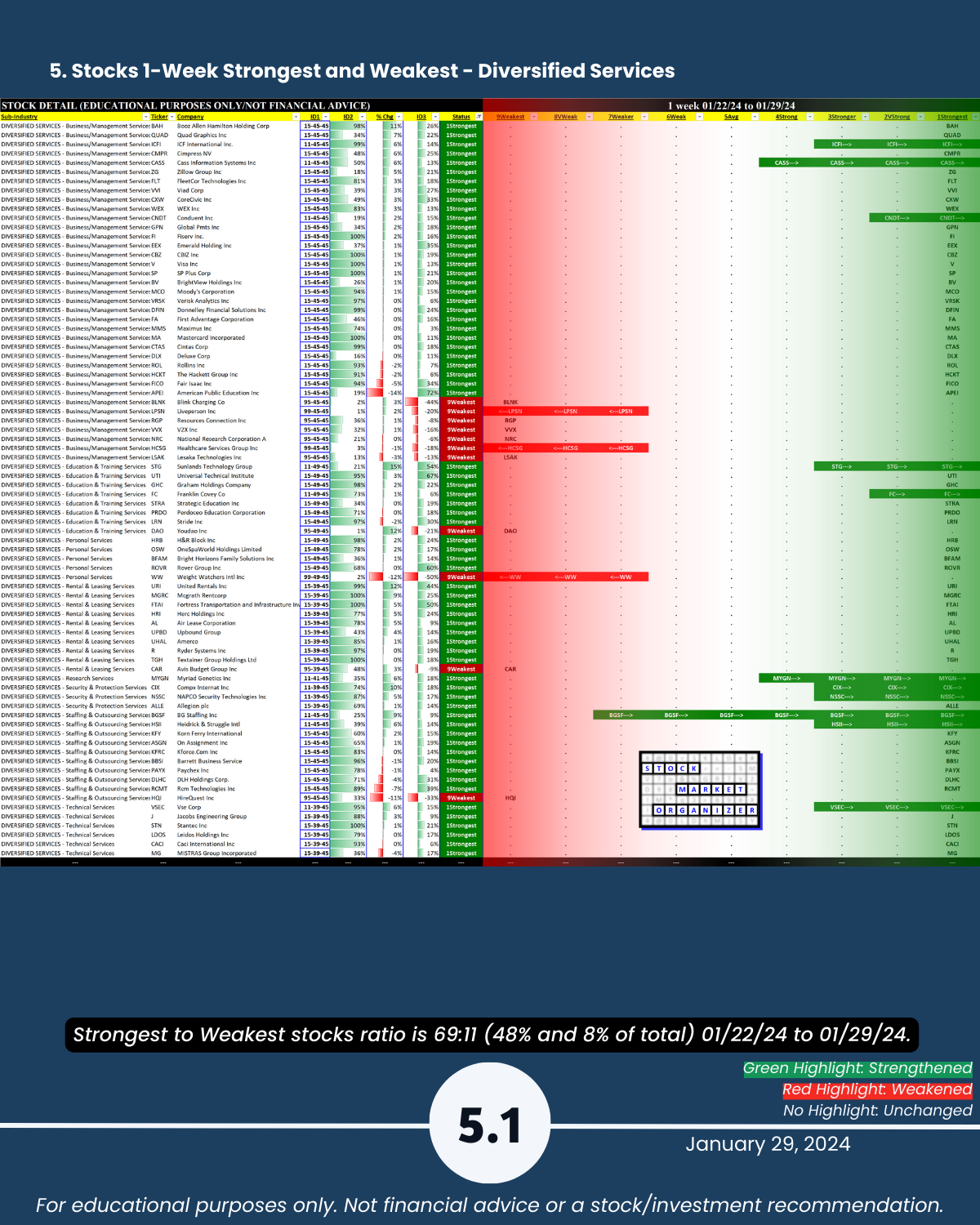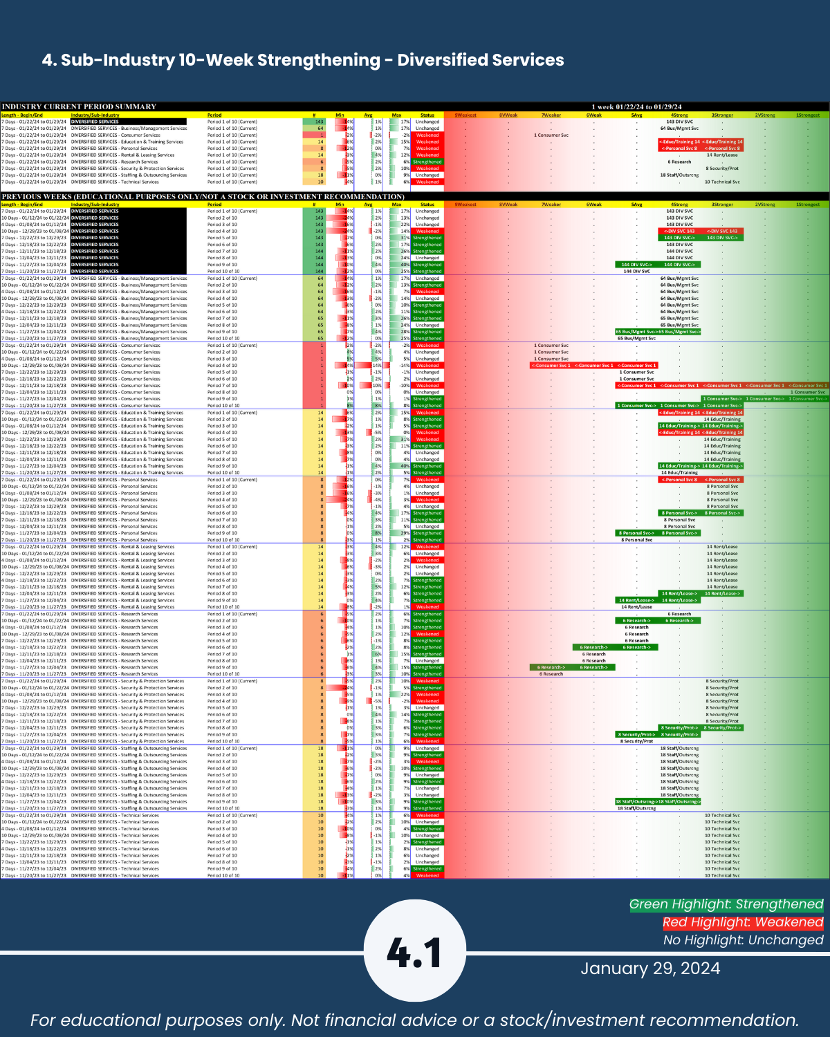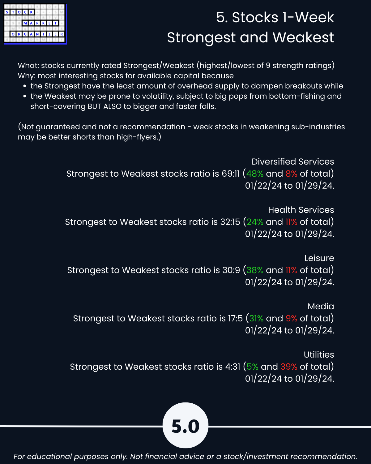 Attached: 1/29/24 Strongest- and Weakest-rated Stock Market Organizer stocks and objective strengthening/weakening measurements in the Diversified Services, Health Services, Leisure, Media, and Utilities industries.