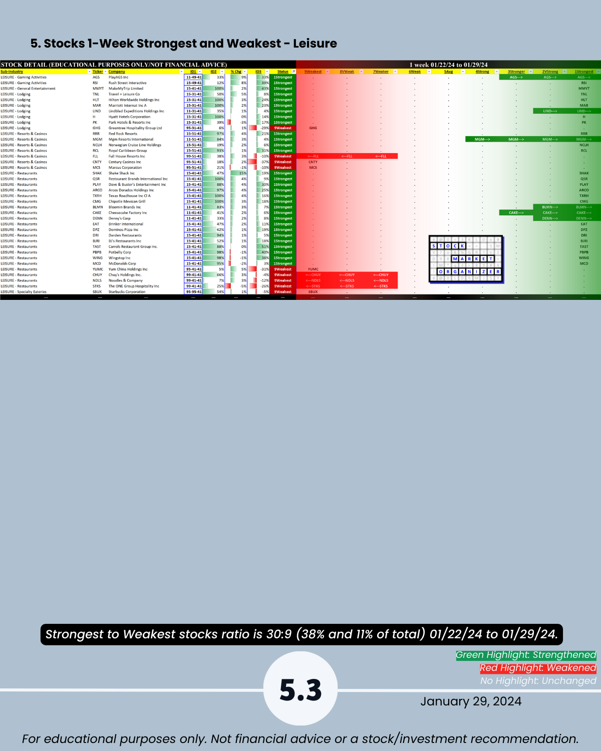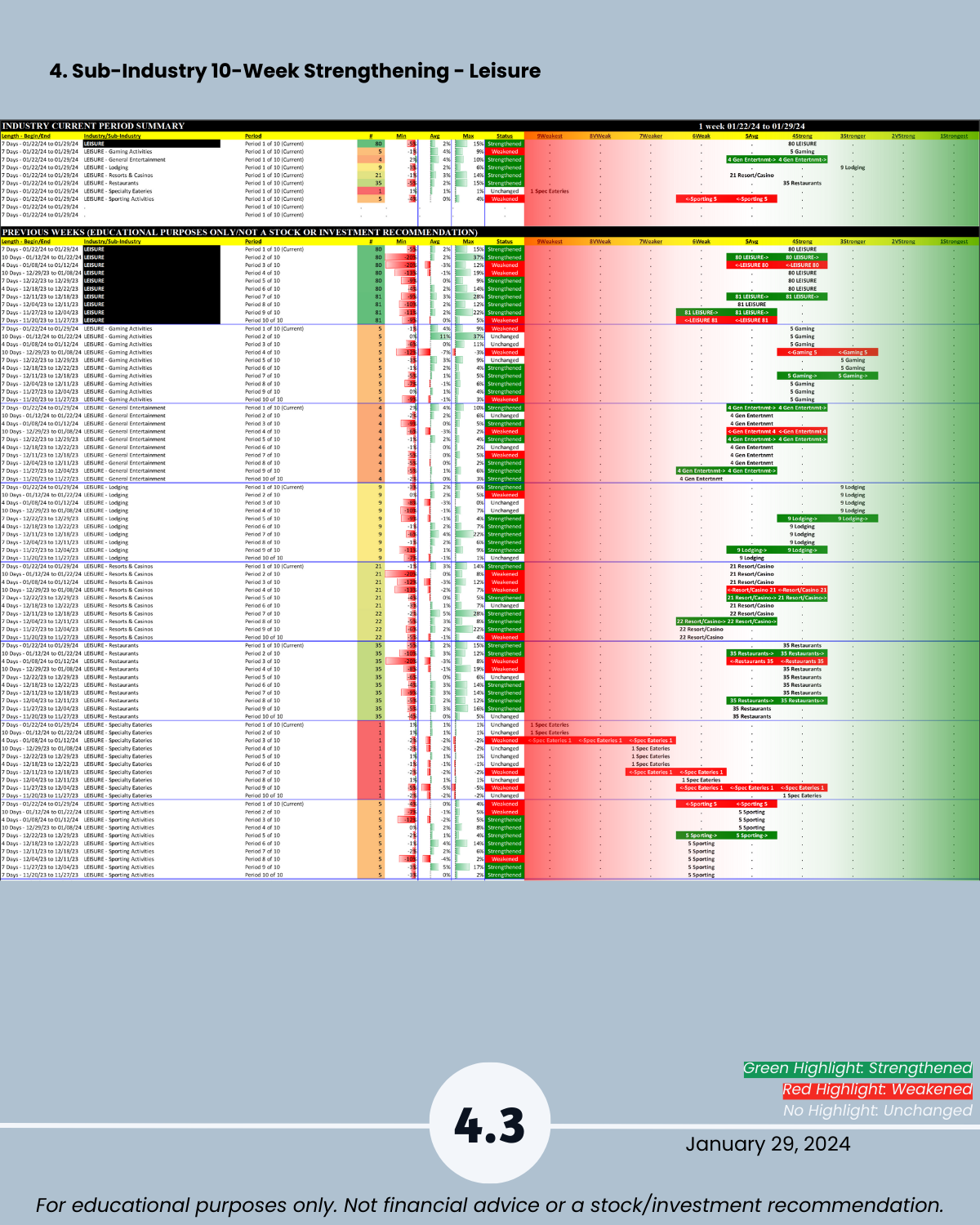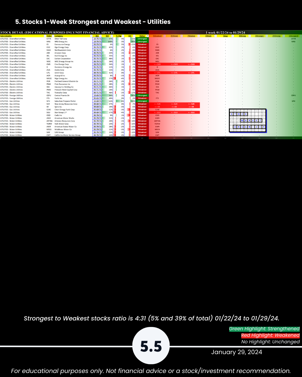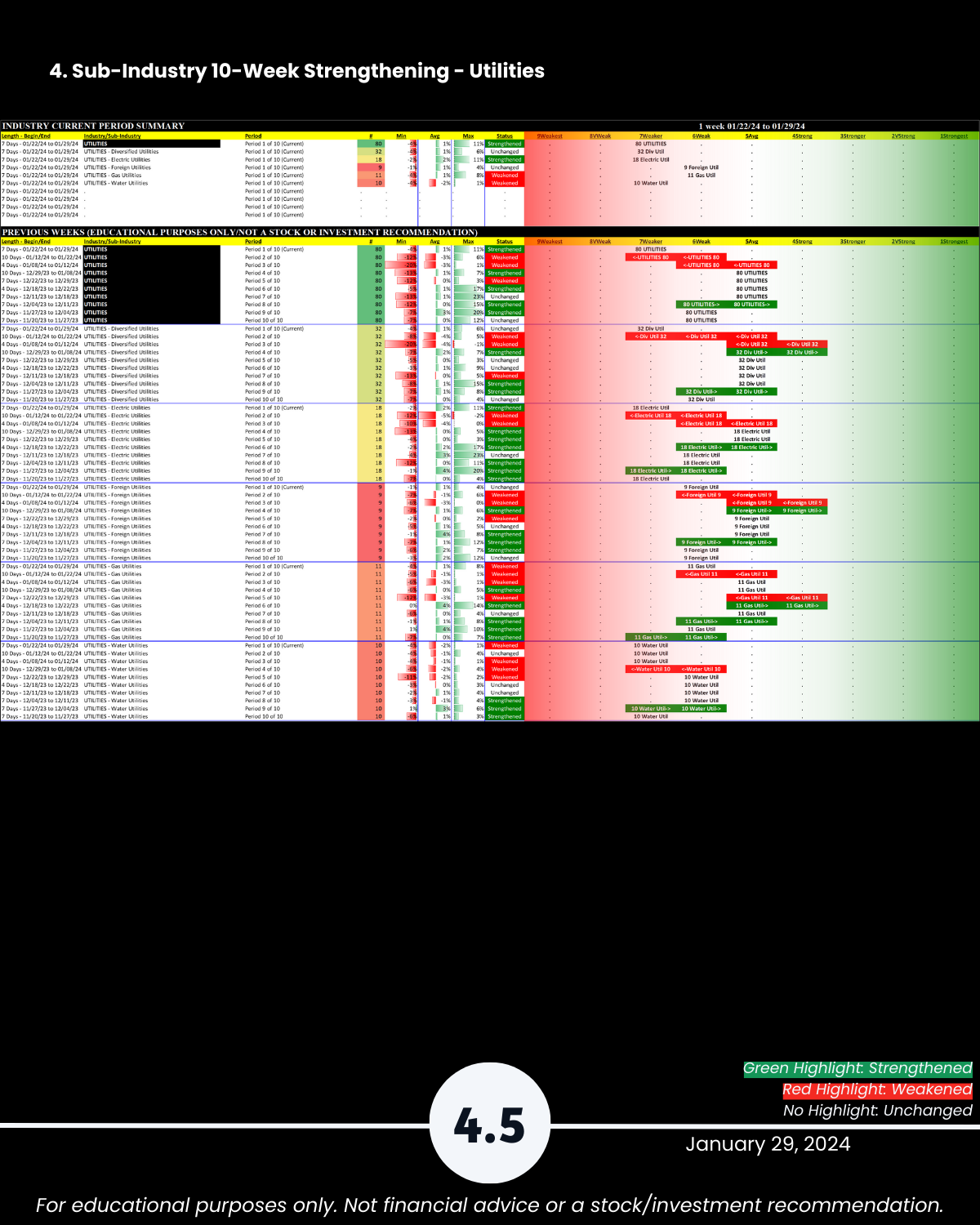 Attached: 1/29/24 Strongest- and Weakest-rated Stock Market Organizer stocks and objective strengthening/weakening measurements in the Diversified Services, Health Services, Leisure, Media, and Utilities industries.