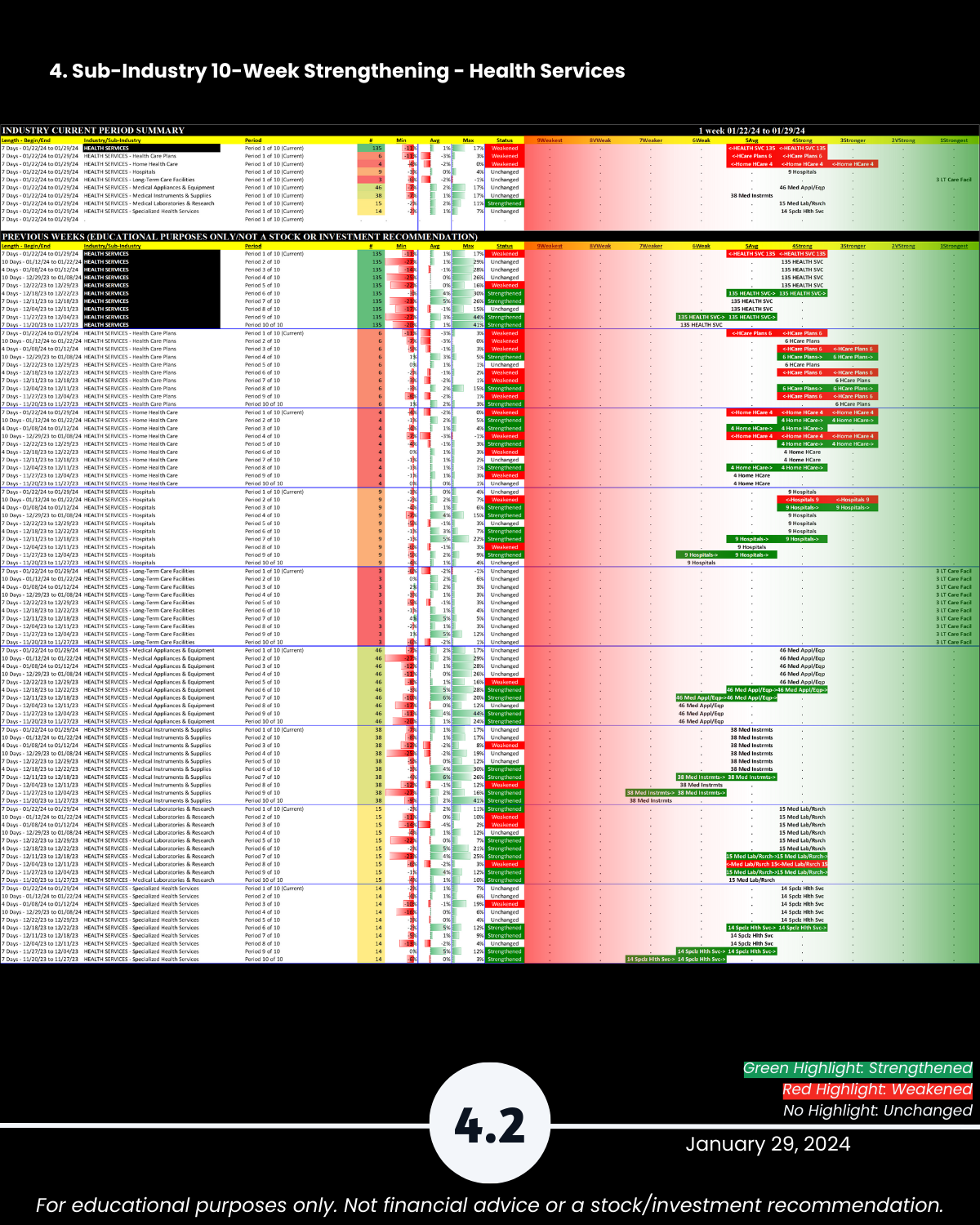 🔹 How all stocks in each sub-industry and industry stack up against each other in terms of current strengthening and weakening. These relationships may not continue, but it’s hard to meaningfully discern where you could go if you don’t know where you currently are. This analysis enables you to quickly see the best and worst stocks and ignore the rest.
