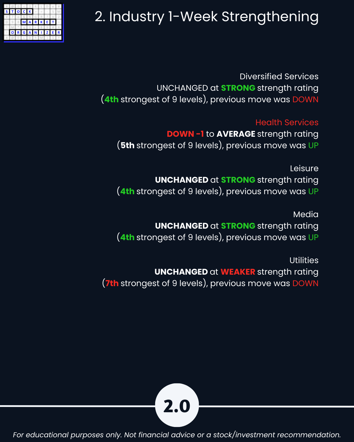 🔹 Diversified Services, Leisure, Media are strongest industries at Strong (4th strongest of 9 levels)