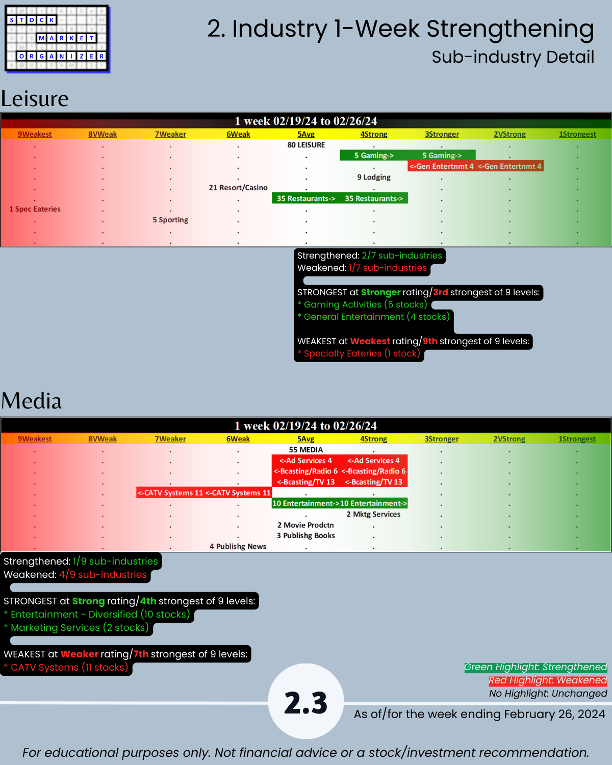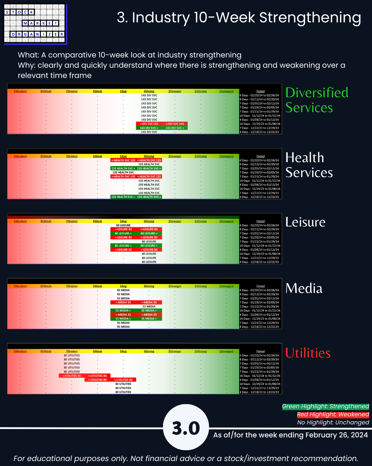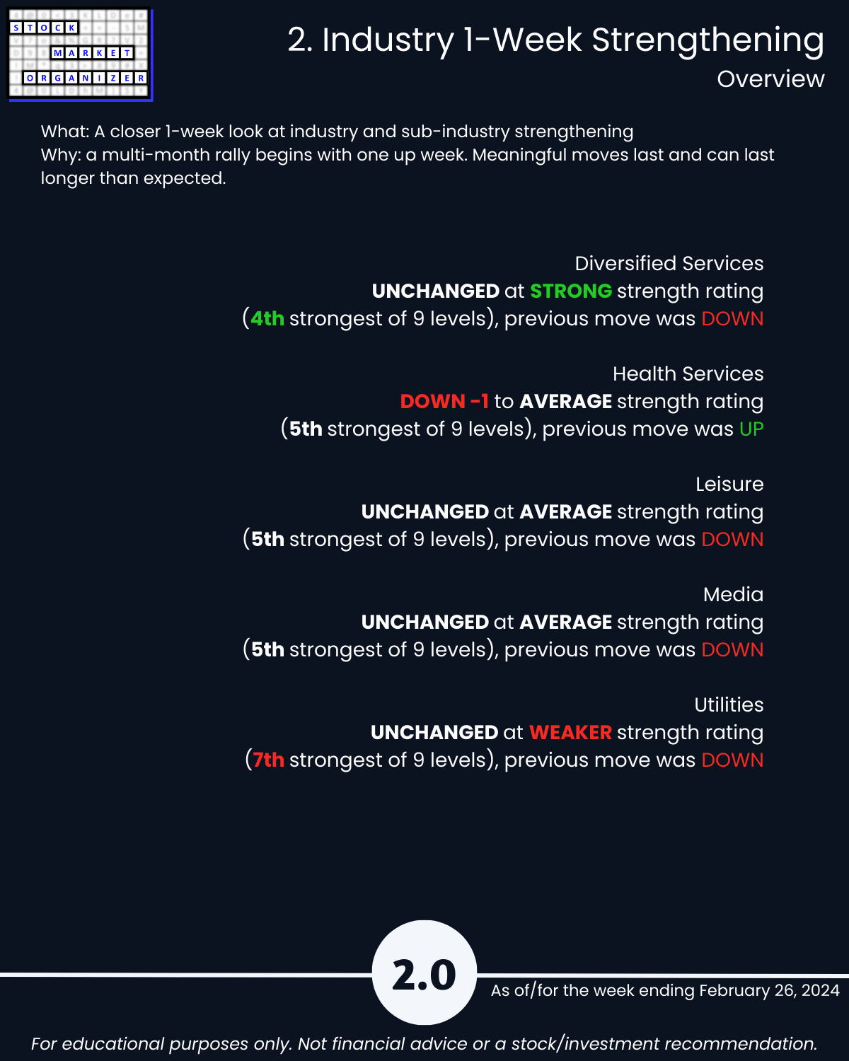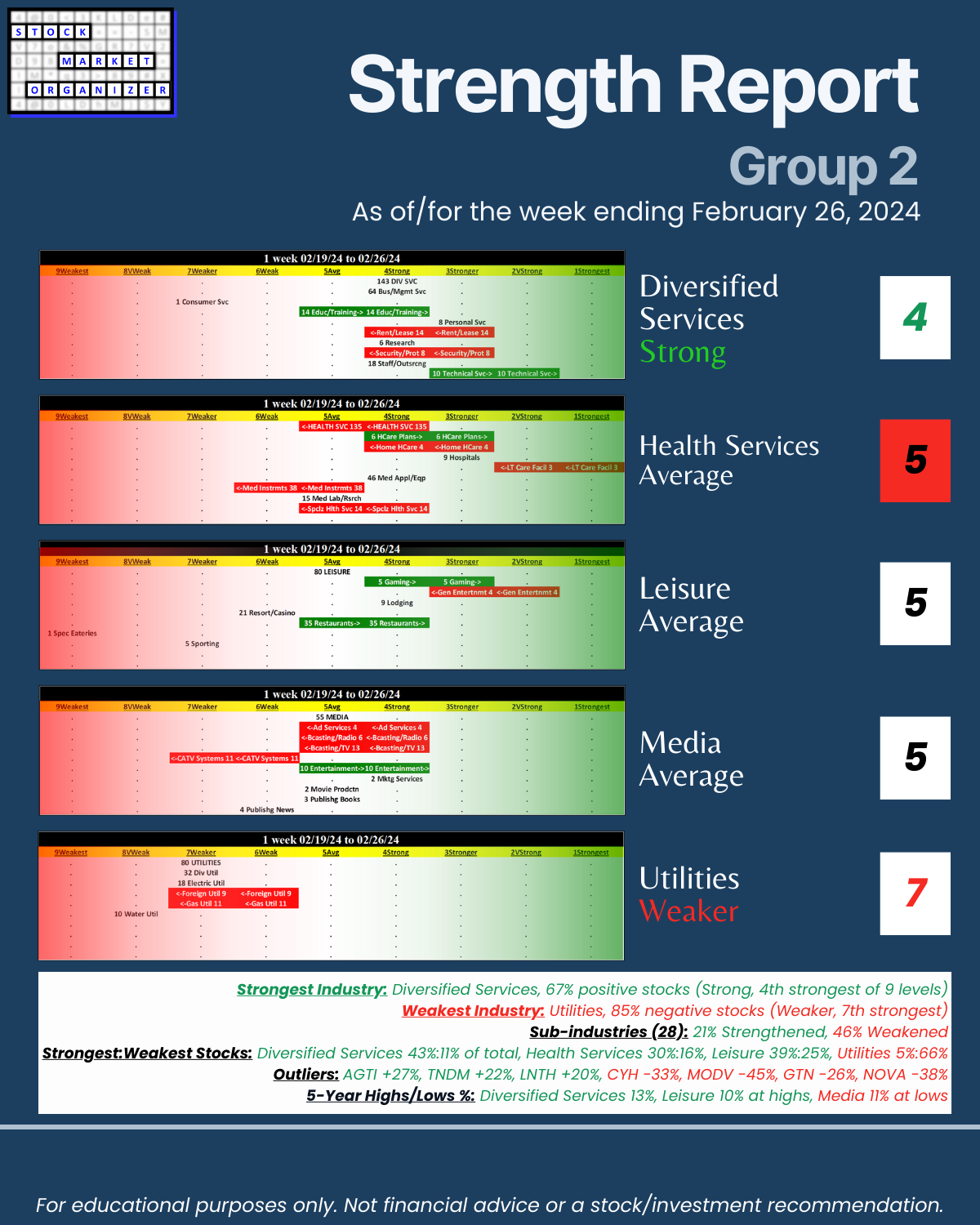 Not debatable: 🔹 The stronger your stocks, the greener your P&L. 🔹 Market conditions matter. 🔹 You won’t find what you aren’t looking for. This is all put into practice in the attached 2/26/24 analysis of Group 2 industries (loosely, the Services sector) – Diversified Services, Health Services, Leisure, Media, and Utilities.