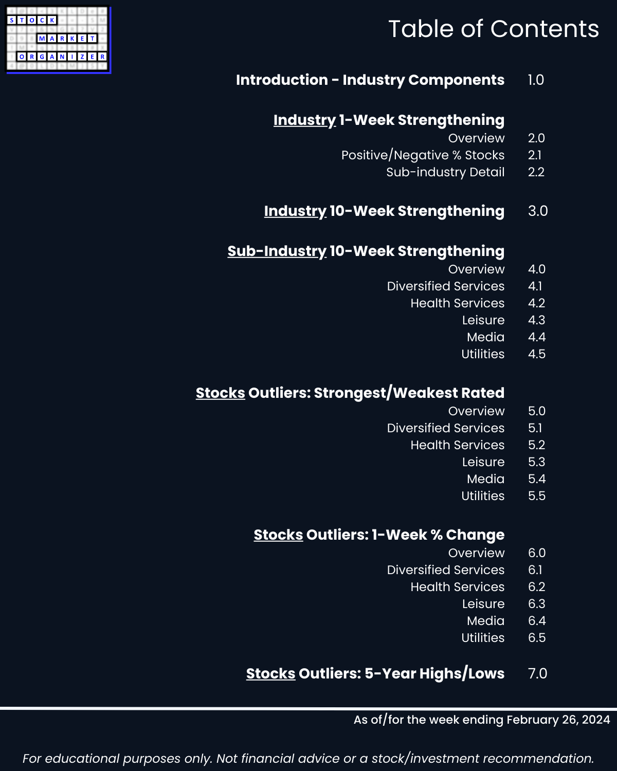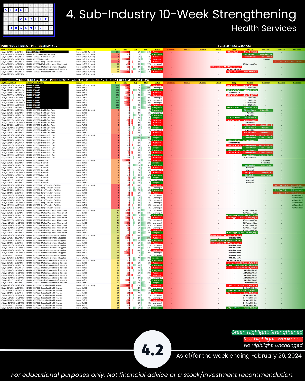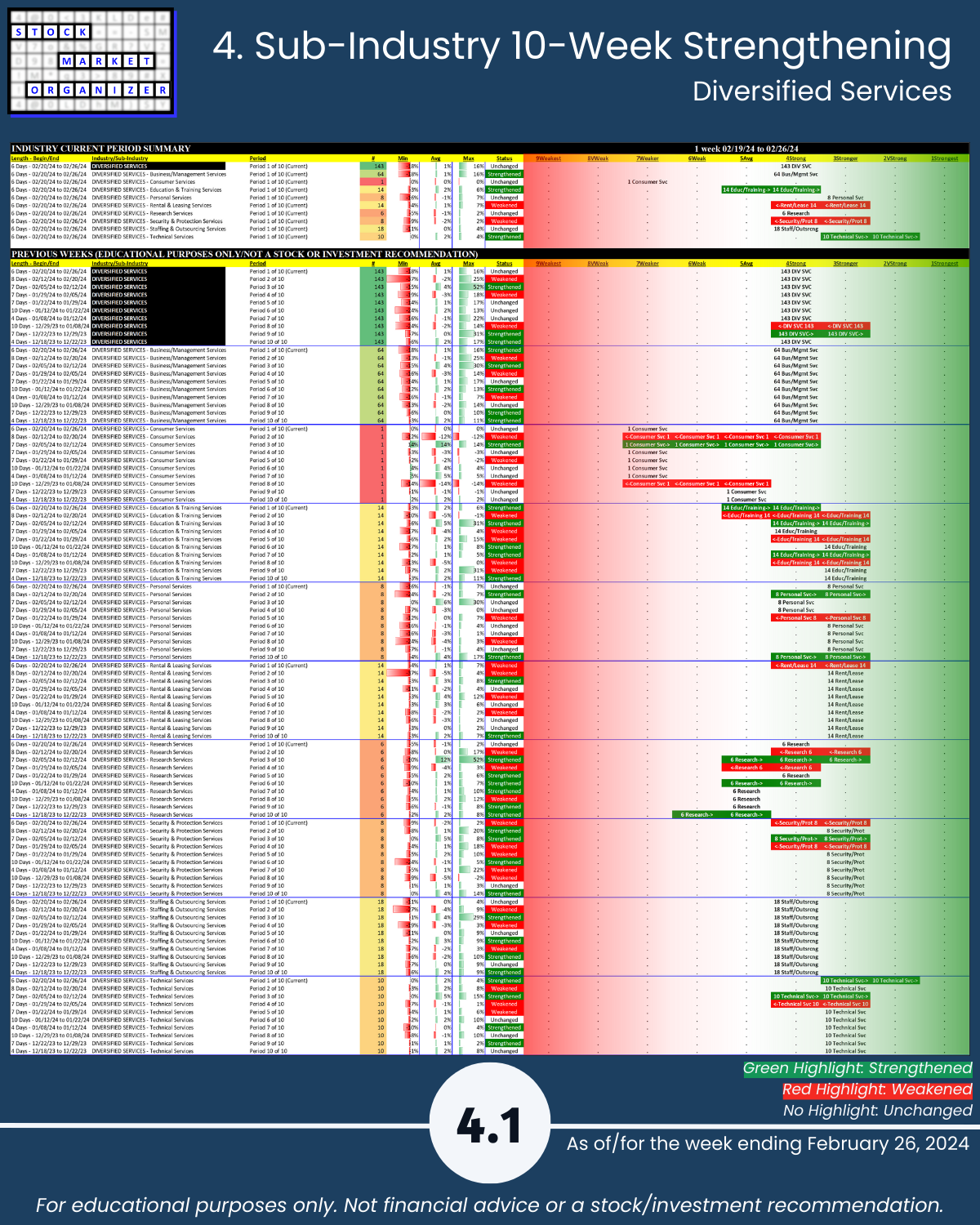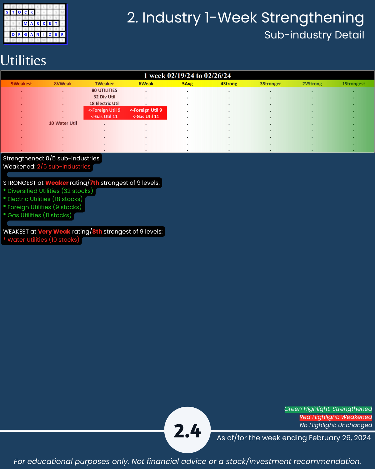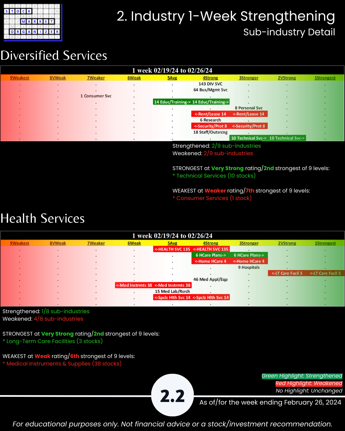 Not debatable: 🔹 The stronger your stocks, the greener your P&L. 🔹 Market conditions matter. 🔹 You won’t find what you aren’t looking for. This is all put into practice in the attached 2/26/24 analysis of Group 2 industries (loosely, the Services sector) – Diversified Services, Health Services, Leisure, Media, and Utilities.