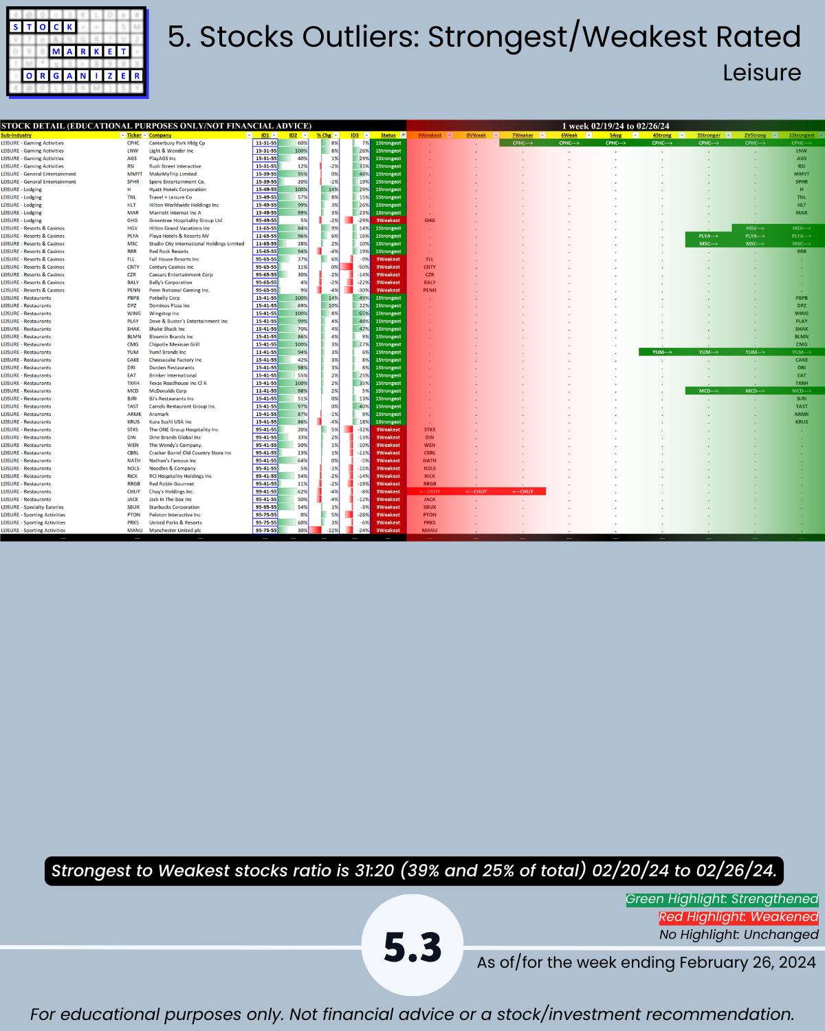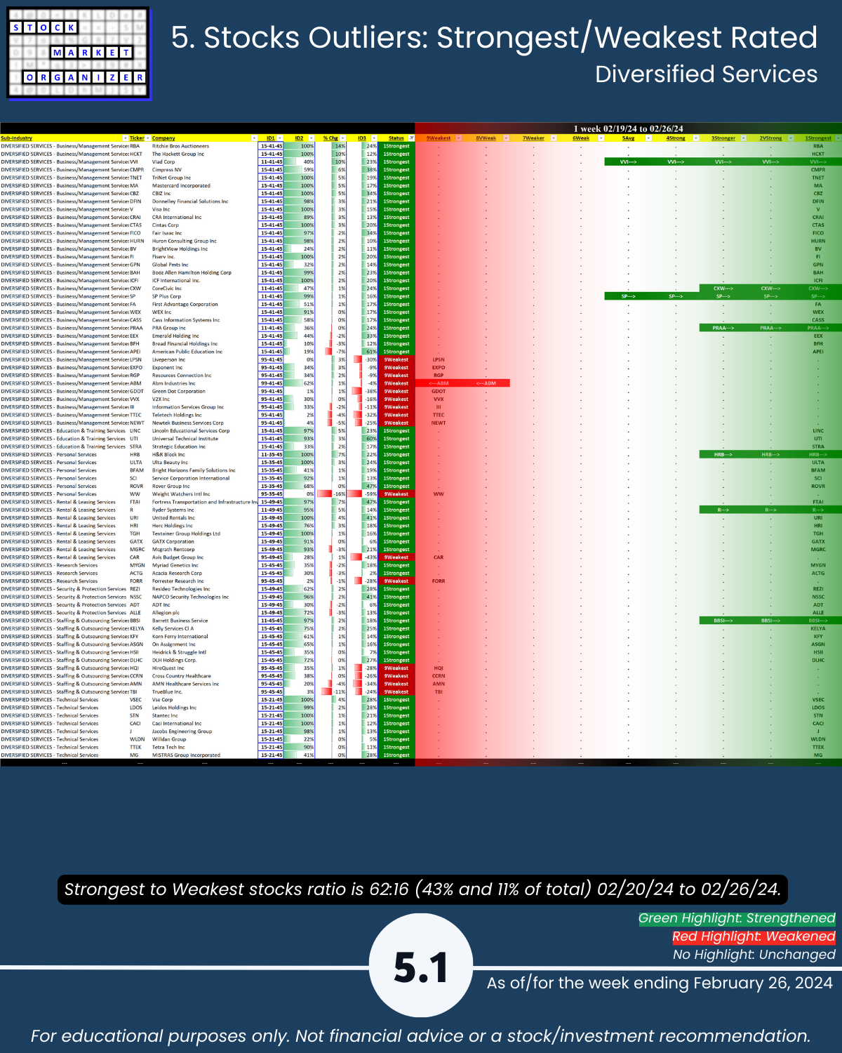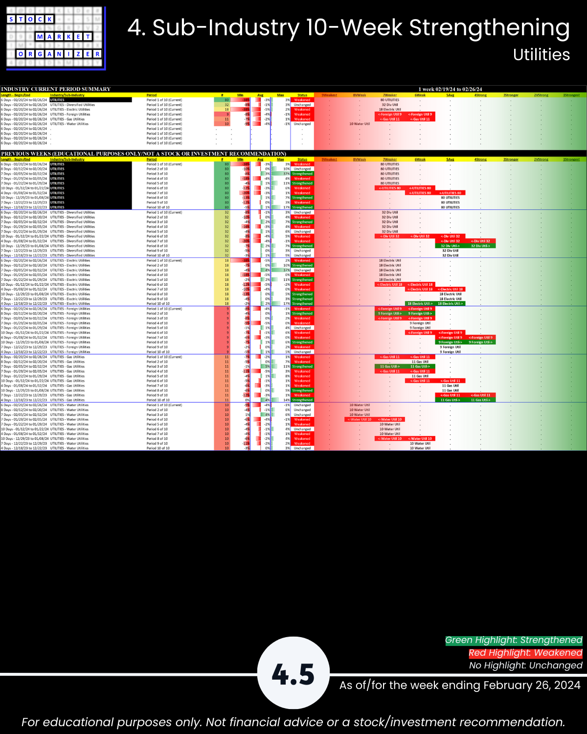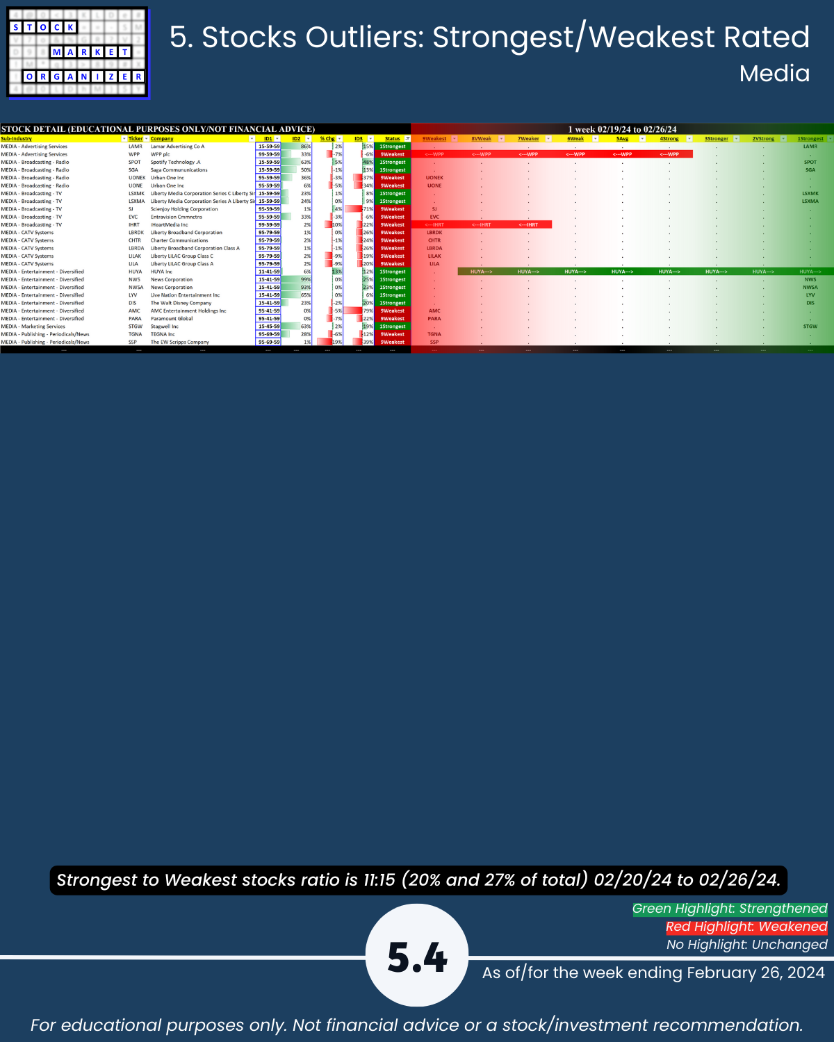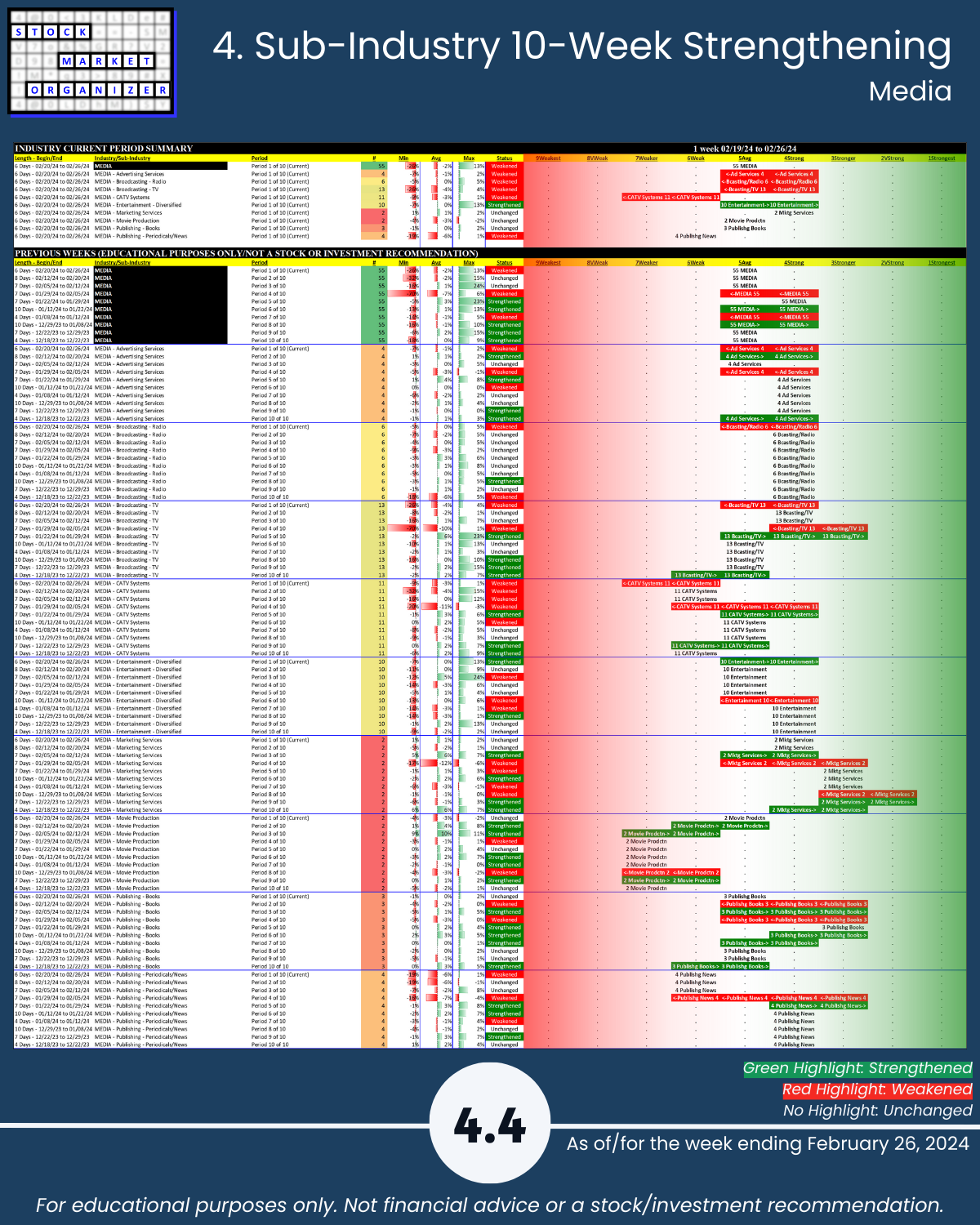You’ll find here Strongest- and Weakest-rated Stock Market Organizer stocks and objective strengthening and weakening measurements in these industries.
