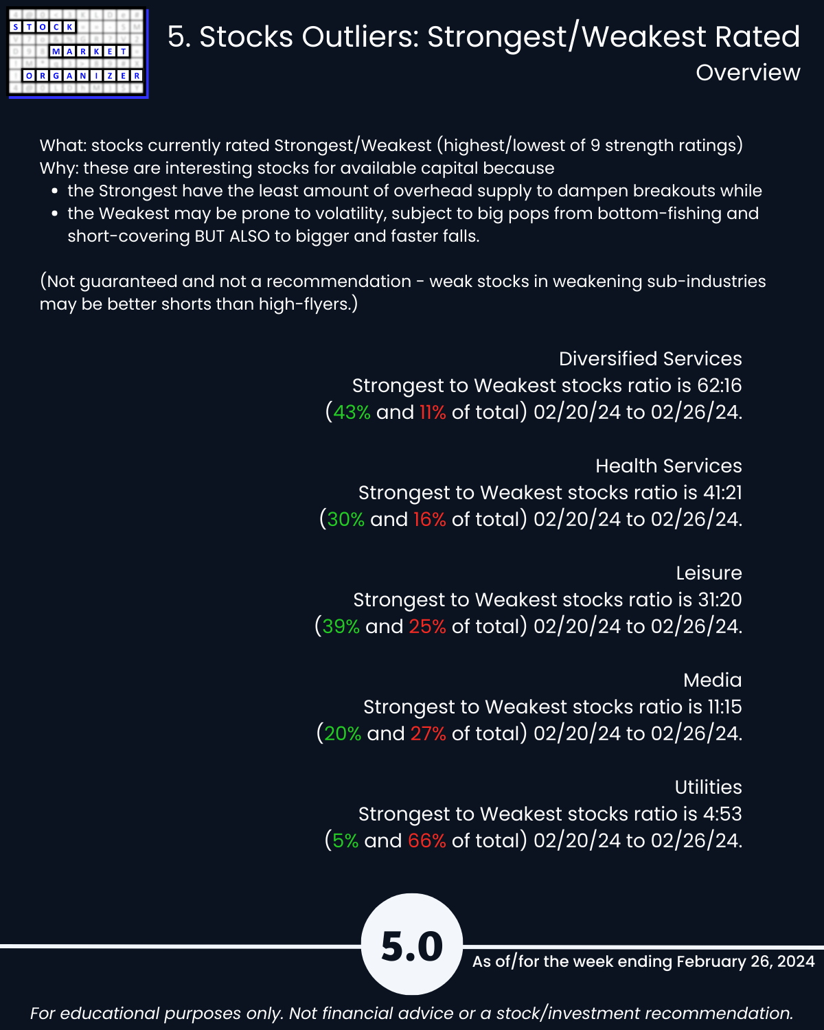 🔹 Strongest:Weakest Stocks: Diversified Services 43%:11% of total, Health Services 30%:16%, Leisure 39%:25%, Utilities 5%:66%