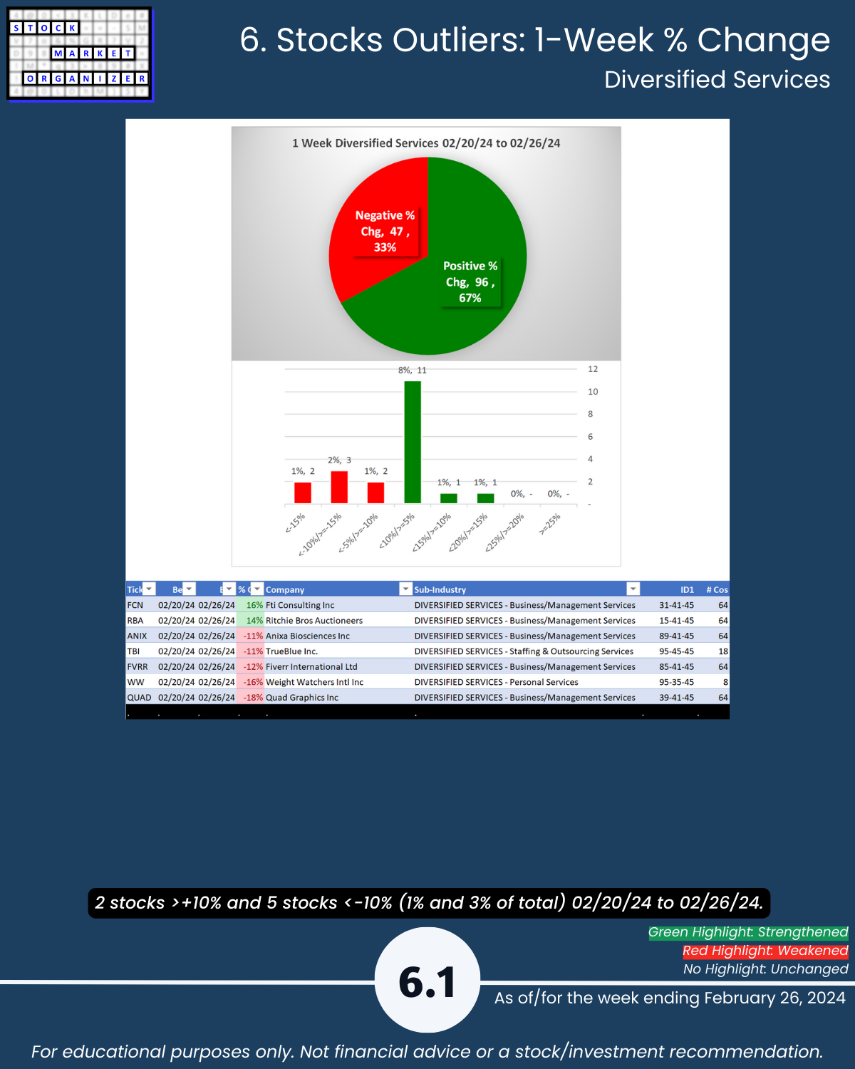 🔹 Strongest Industry: Diversified Services, 67% positive stocks (Strong, 4th strongest of 9 levels)