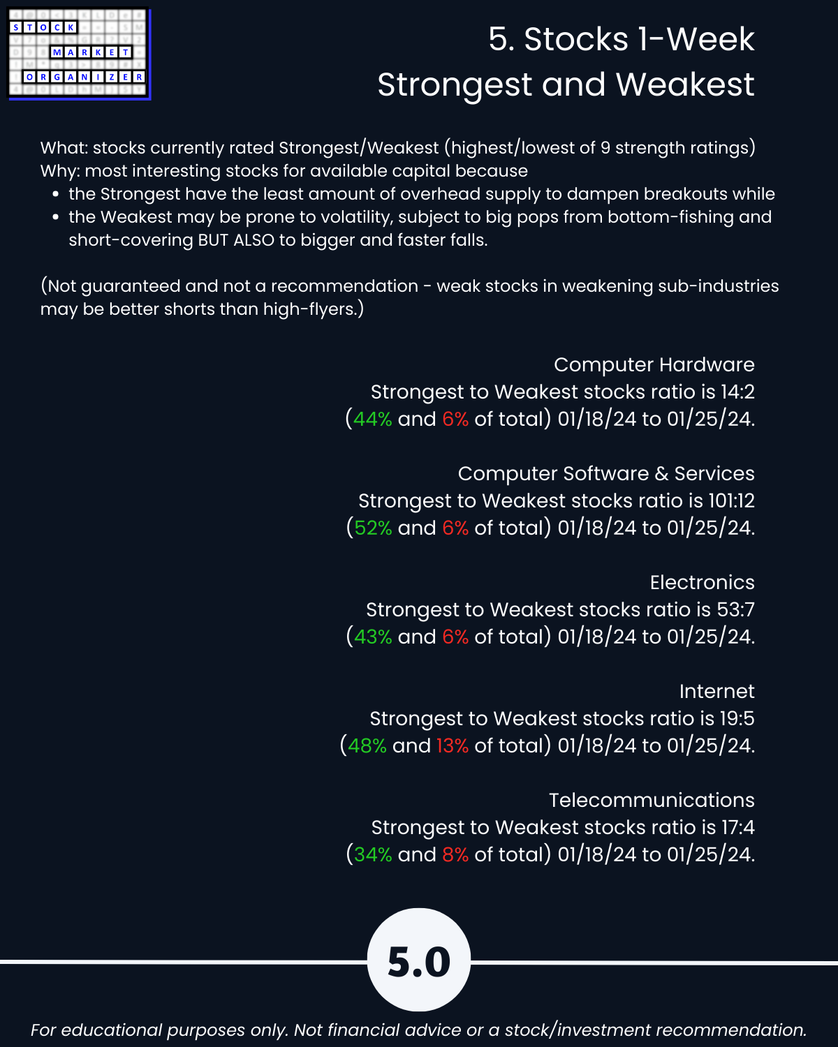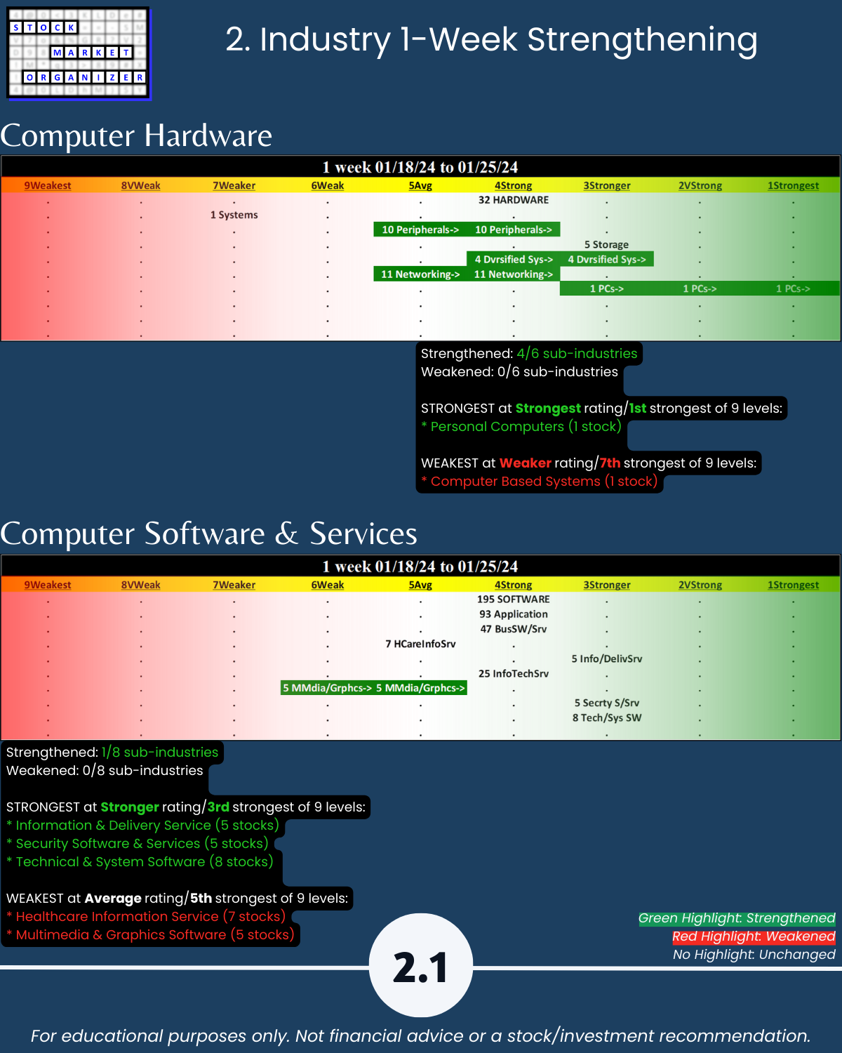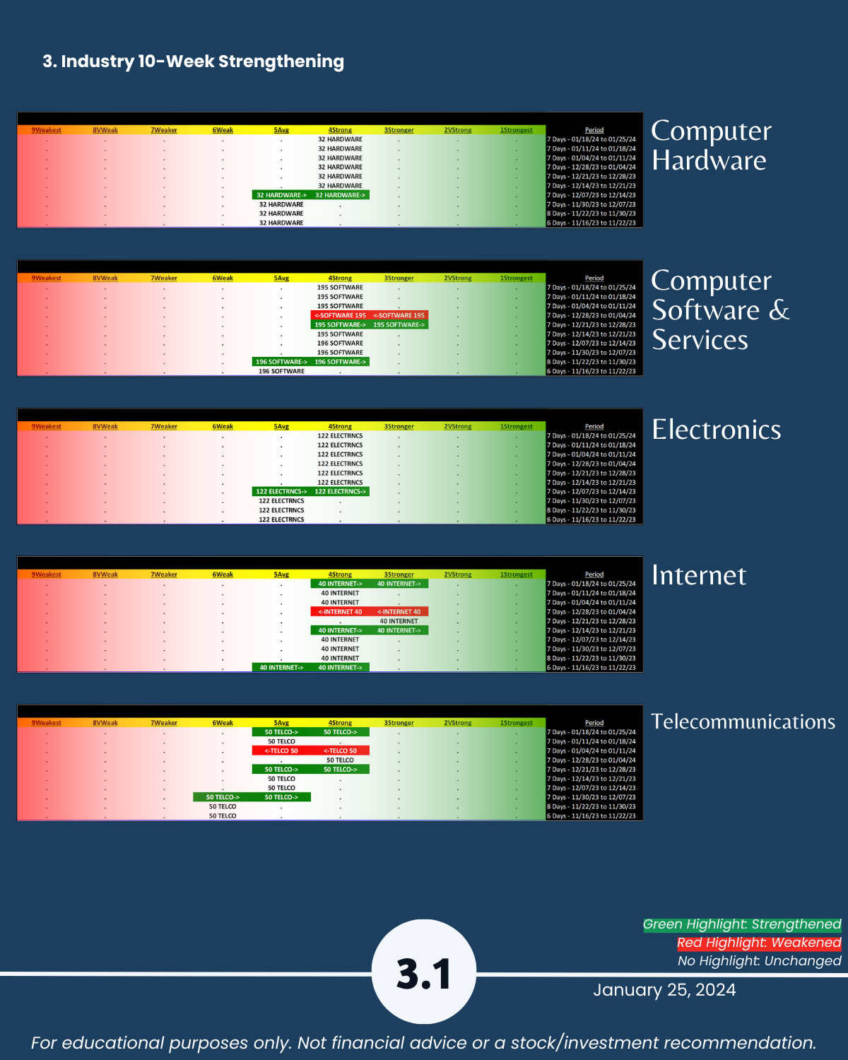 Tech sector flexing, at 1/25/24 these 5 industries are all ranked Strong or Stronger (4th/3rd strongest of 9 levels). Attached: Strongest- and Weakest-rated Stock Market Organizer stocks and objective strengthening/weakening measurements in Computer Hardware, Computer Software & Services, Electronics (Chips/Semis), Internet, and Telecommunications.
