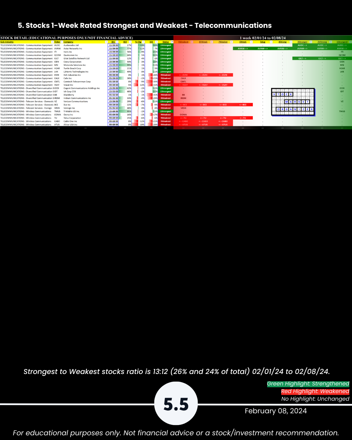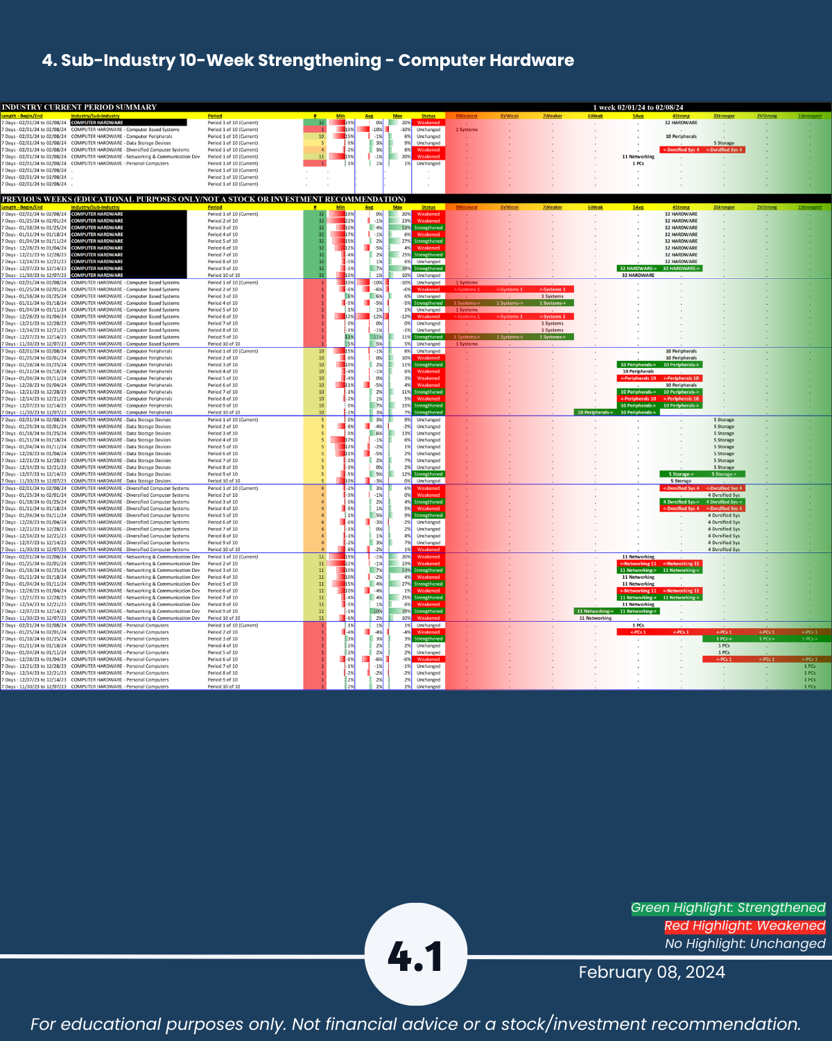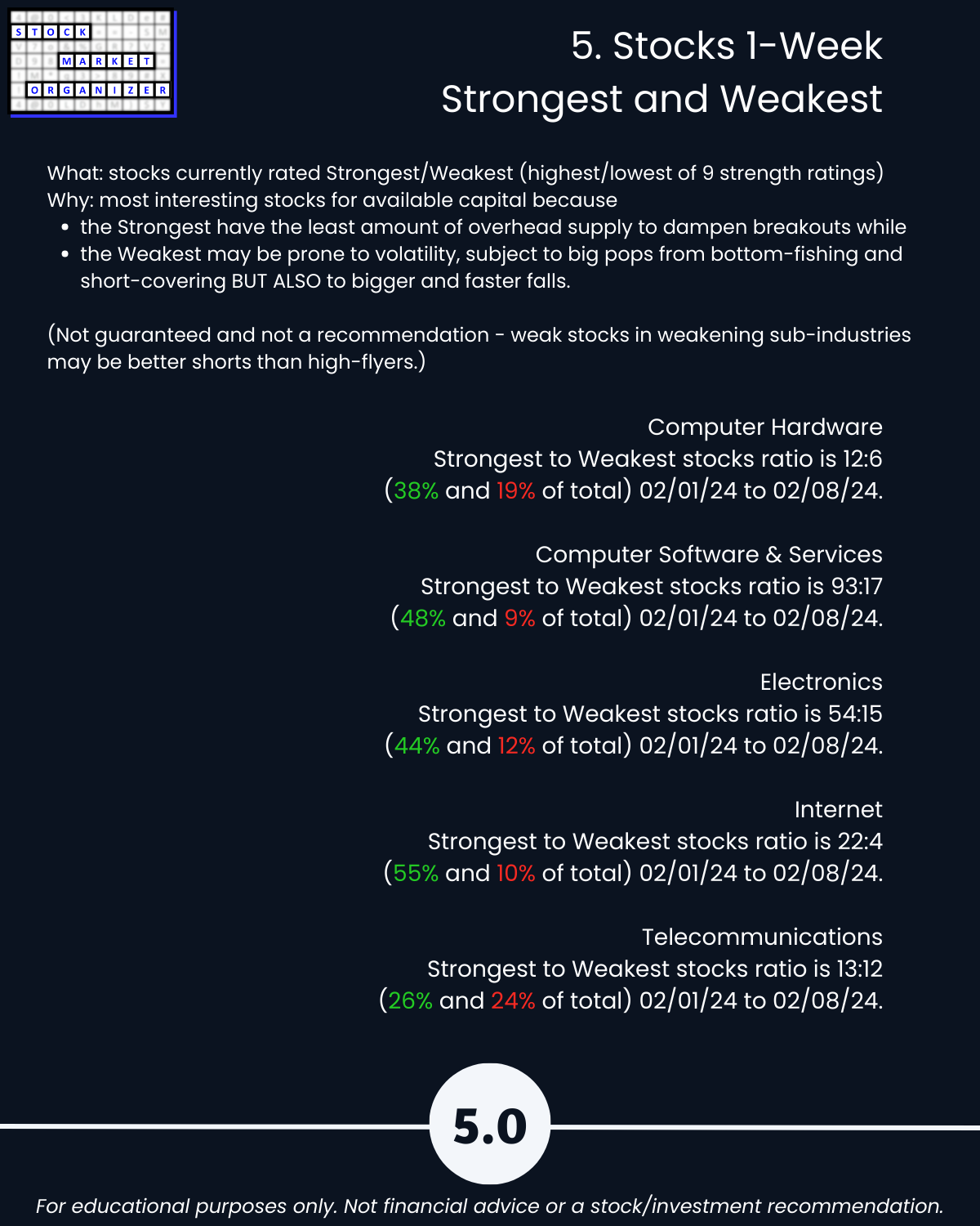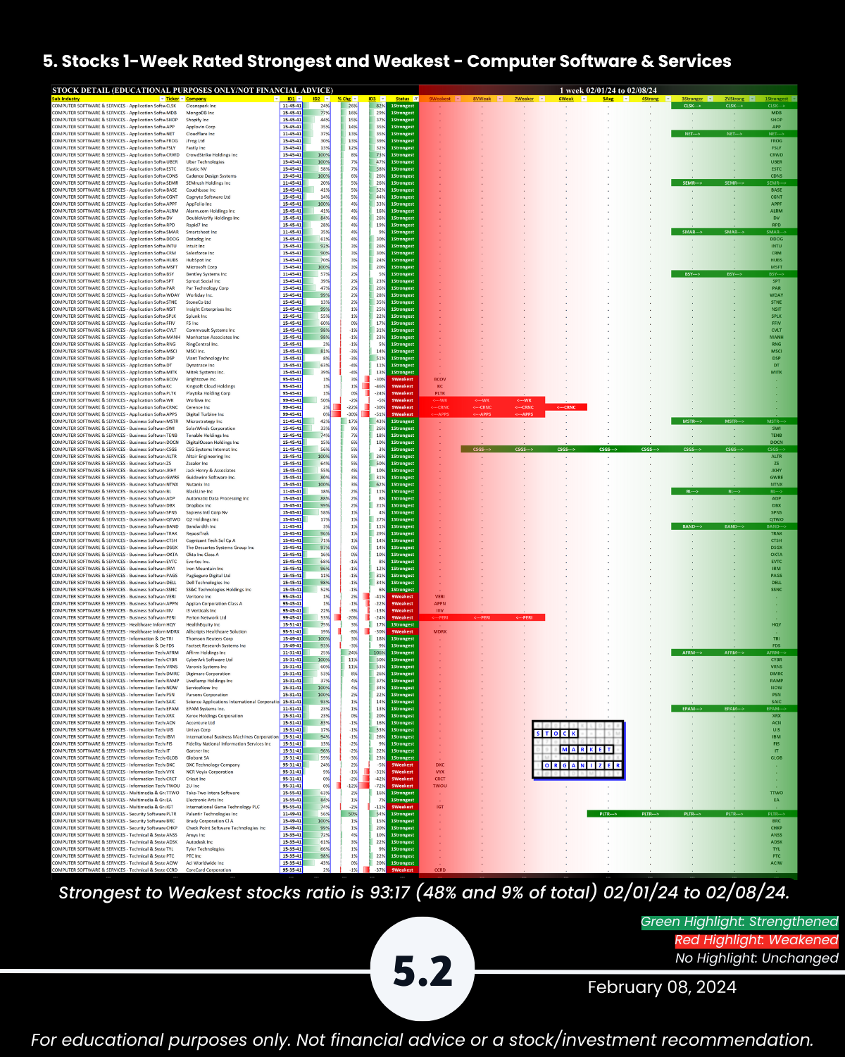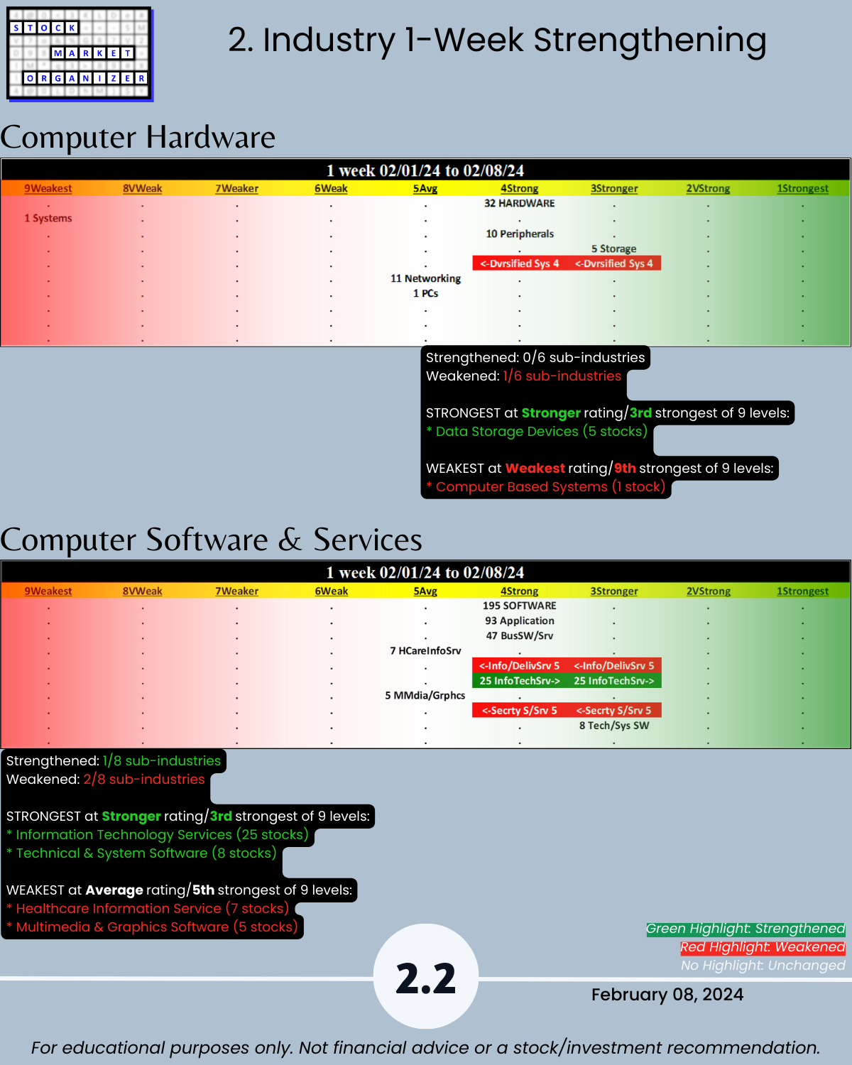 Today: Tech. Is there any legitimate reason NOT to look for strength in the market? With its +50% week PLTR says “hold my beer” to SMCI (+20% this week after +23% last week). NVDA +10% for the week to $696, continuing its explosive run after blasting through $500/share 1/8/24. Attached: an organized 2/8/24 Tech sector strengthening/weakening analysis. Includes Strongest- and Weakest-rated Stock Market Organizer stocks and objective strengthening/weakening measurements in Computer Hardware, Computer Software & Services, Electronics (Chips/Semis), Internet, and Telecommunications.