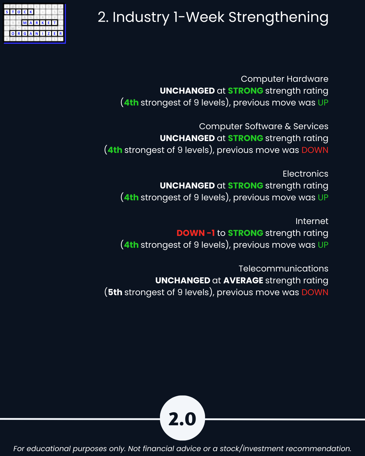 🔹 Hardware, Software, Electronics, Internet industries strongest ranked at Strong (4th strongest)