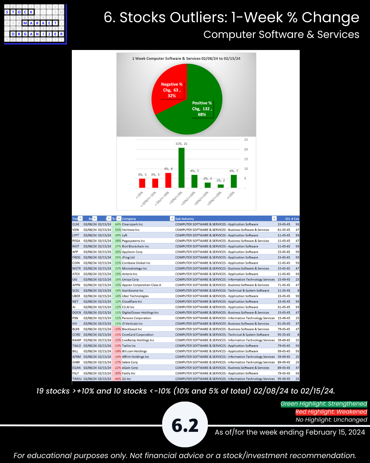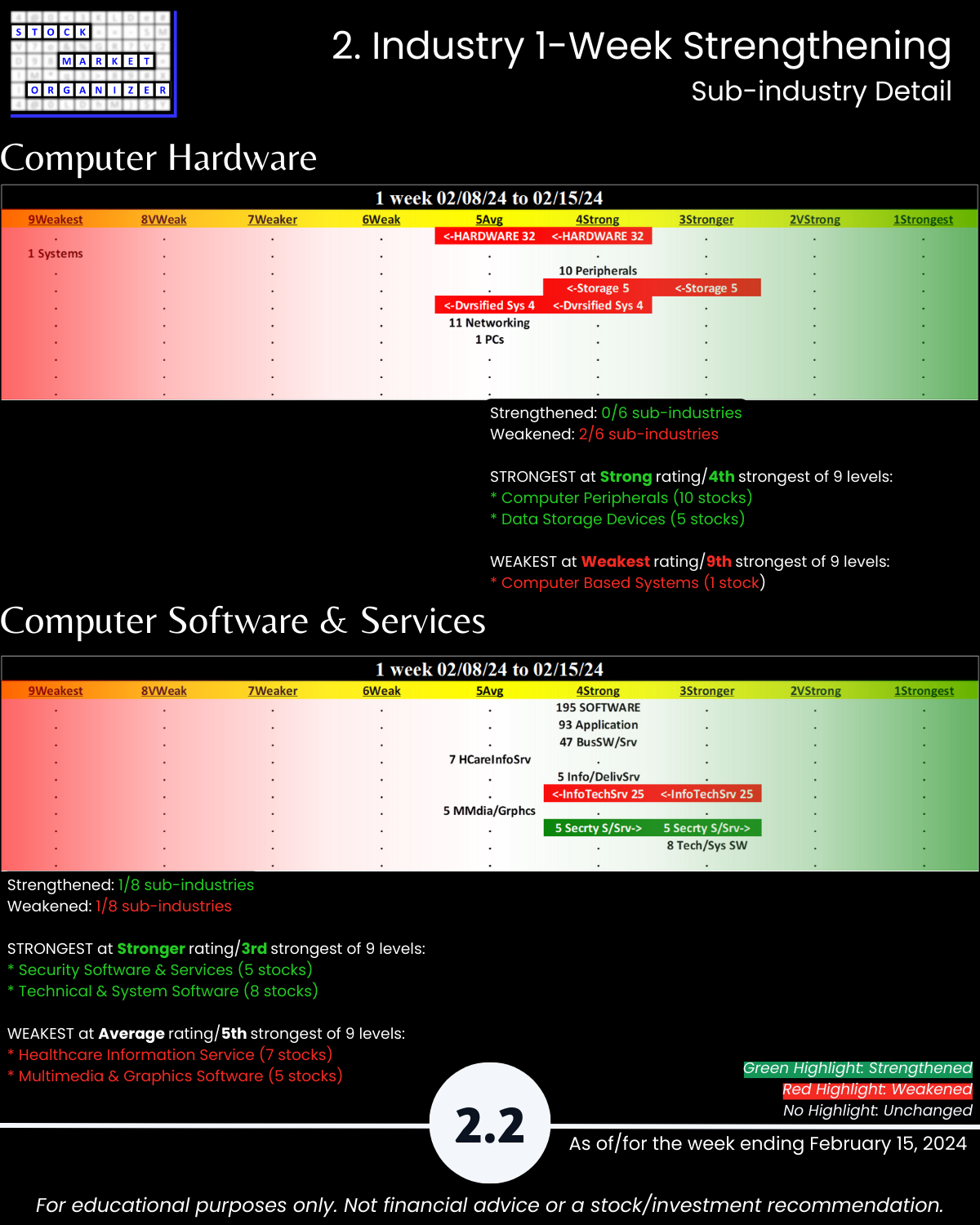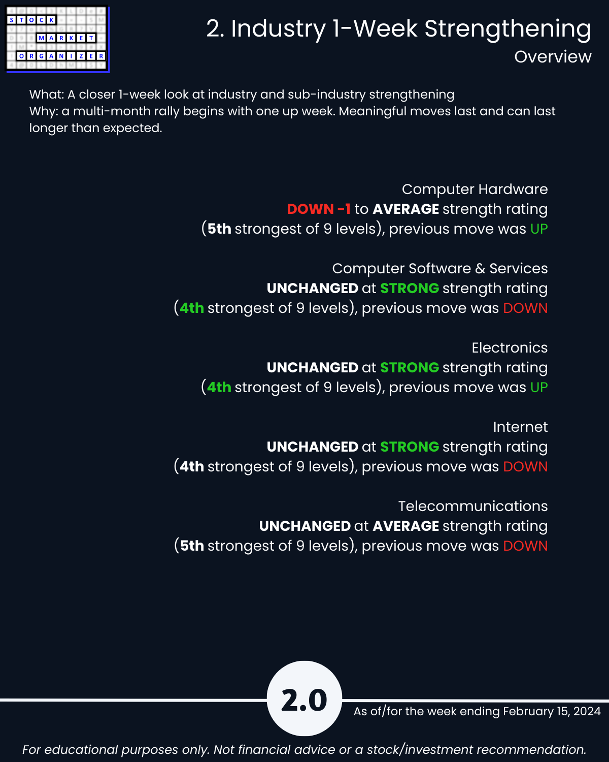 2/15/24 Thursday strength report = Tech. SMCI stellar 253% YTD still well behind QCOM 1999 2,667%. LYFT goes from cars to roller-coaster โ up/down big Tuesday after-hours (due to a press release typo!) then explodes to a +49% week. AKAM craters HARD on volume from multi-year highs. Attached includes Strongest- and Weakest-rated Stock Market Organizer stocks and objective strengthening/weakening measurements in Computer Hardware, Computer Software & Services, Electronics (Chips/Semis), Internet, and Telecommunications.