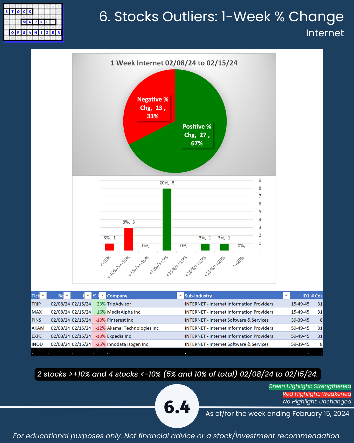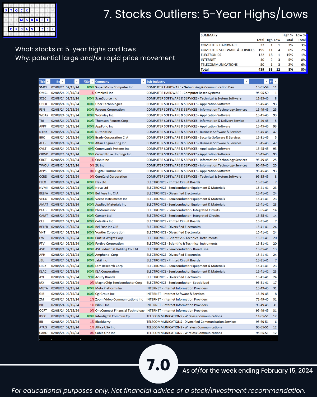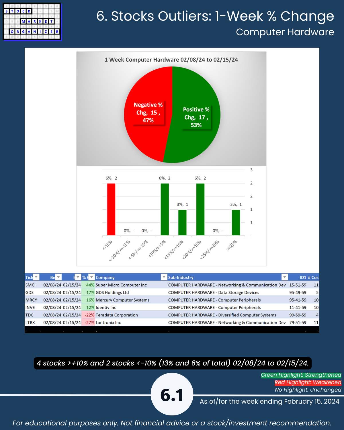 2/15/24 Thursday strength report = Tech. SMCI stellar 253% YTD still well behind QCOM 1999 2,667%. LYFT goes from cars to roller-coaster โ up/down big Tuesday after-hours (due to a press release typo!) then explodes to a +49% week. AKAM craters HARD on volume from multi-year highs. Attached includes Strongest- and Weakest-rated Stock Market Organizer stocks and objective strengthening/weakening measurements in Computer Hardware, Computer Software & Services, Electronics (Chips/Semis), Internet, and Telecommunications.