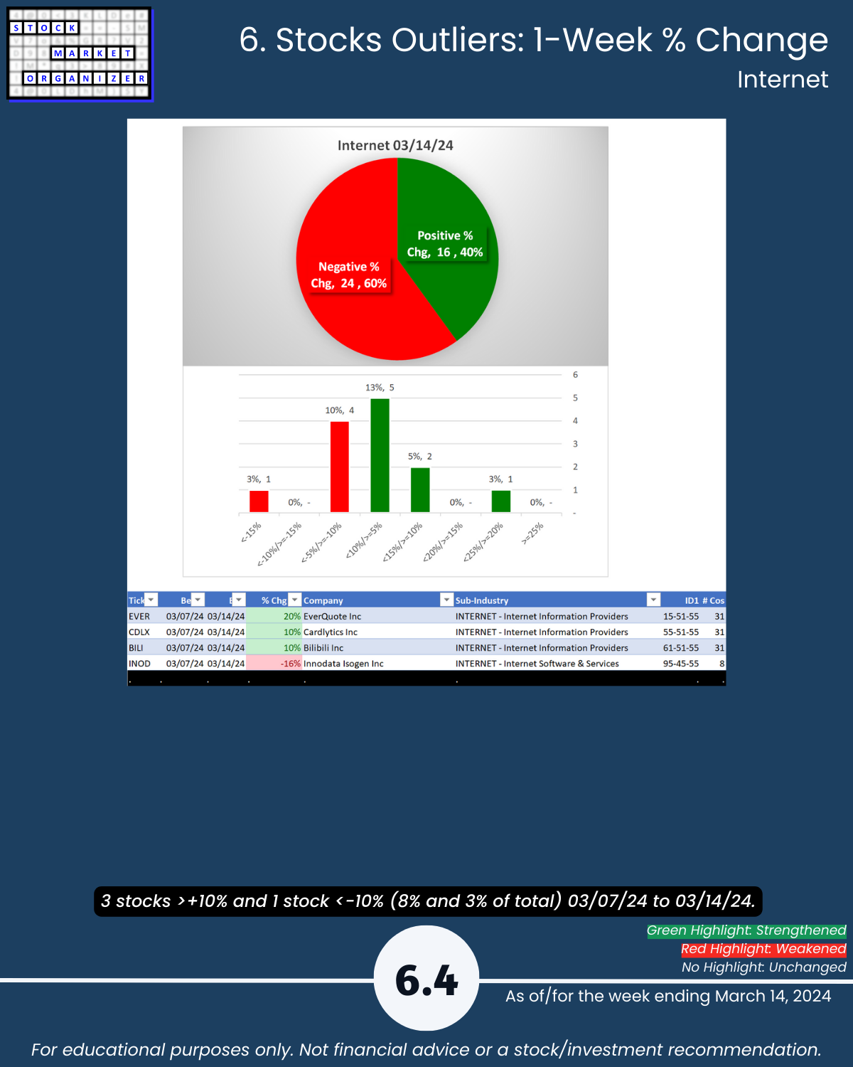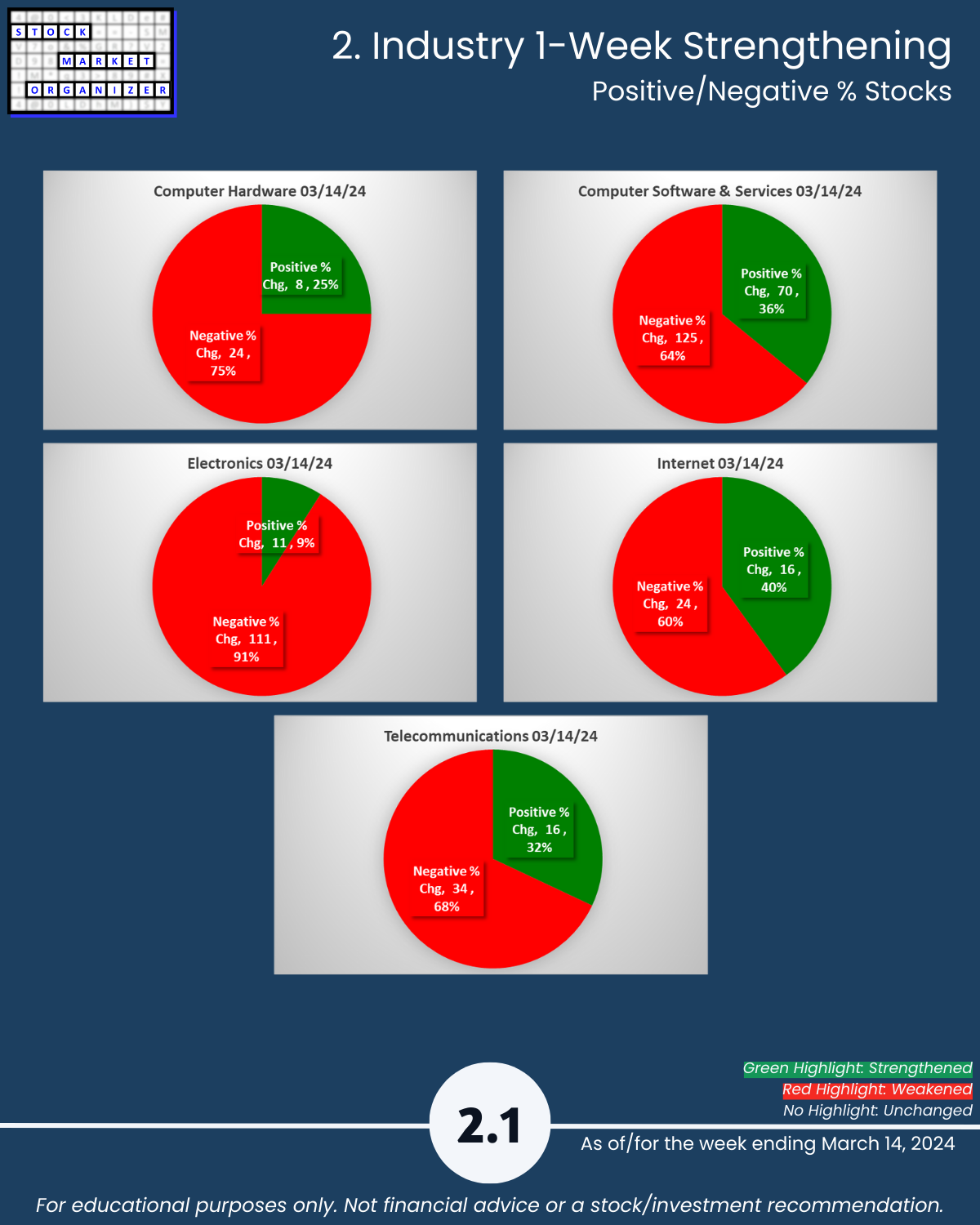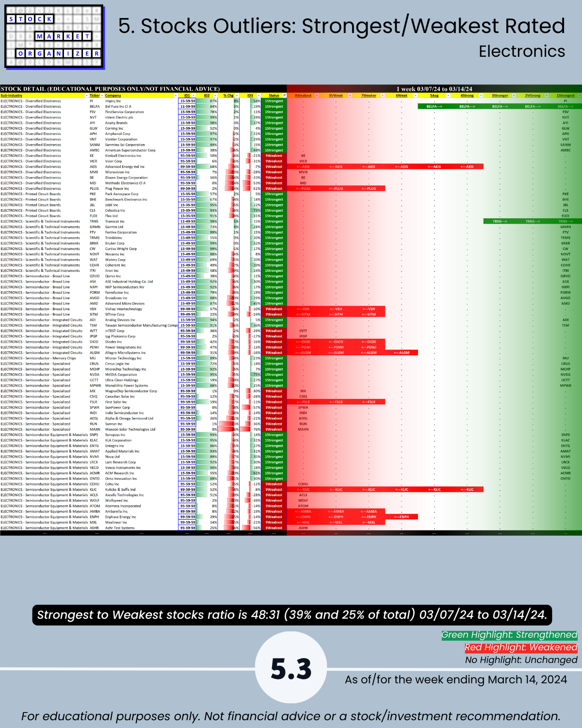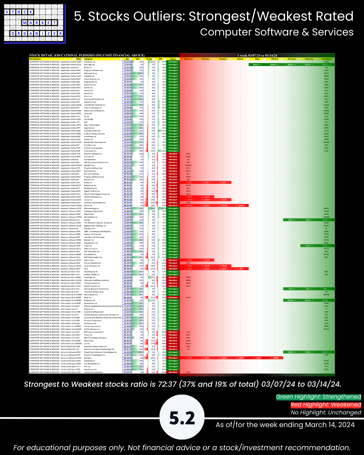 🔹 Stocks rated Strongest:Weakest: Software 37%/19% of total, Electronics 39%:25%, Internet 38%:10%