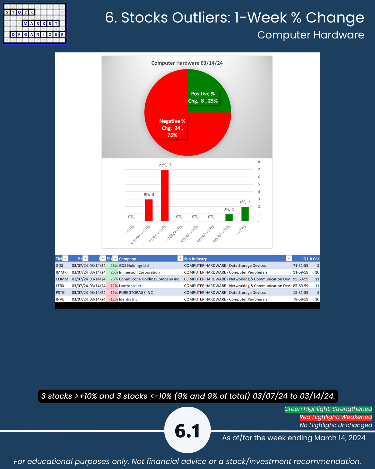 🔹 Outliers: Electronics 91% negative stocks Hardware 75%; Electronics 19% stocks <-10%; see above for individual stocks