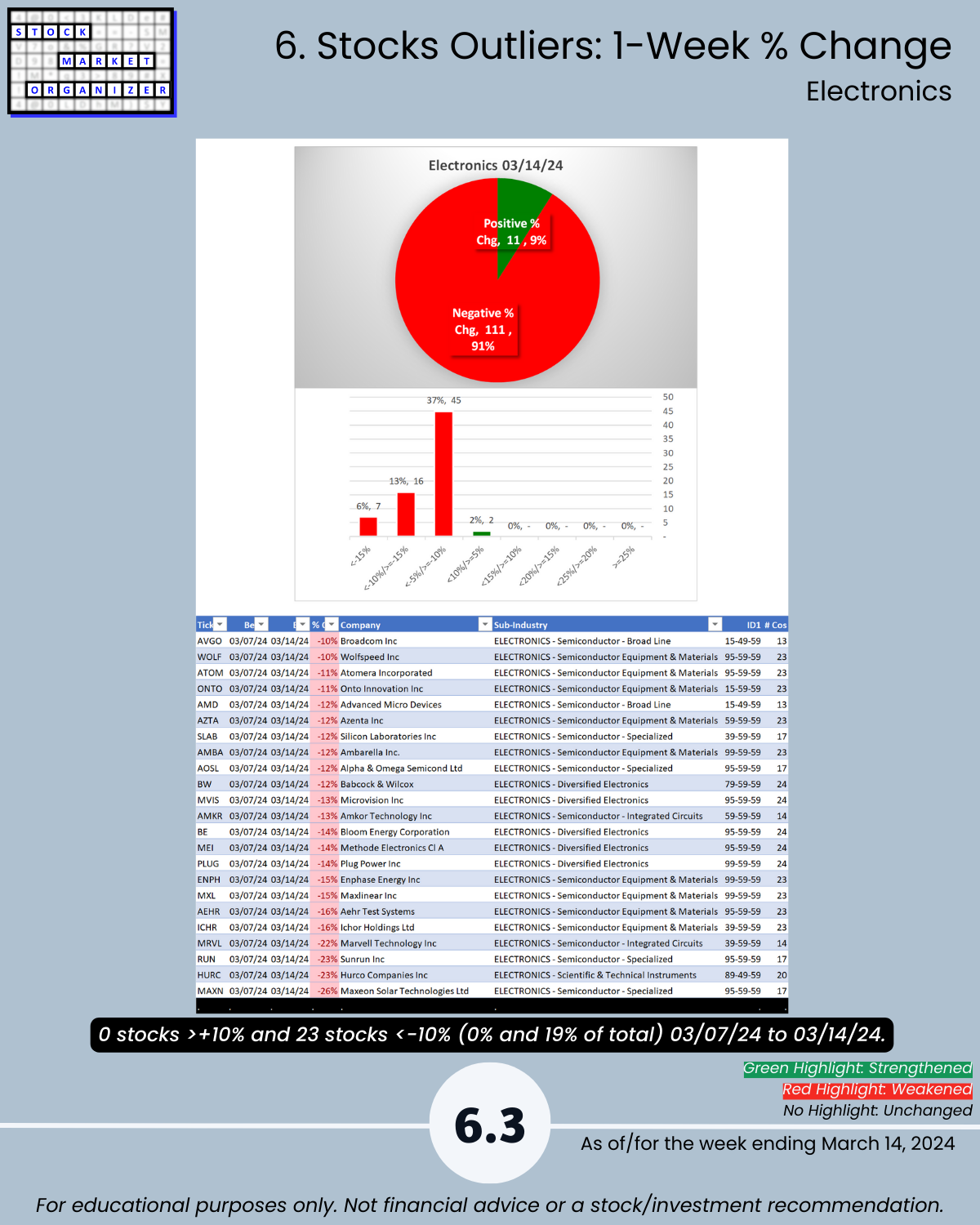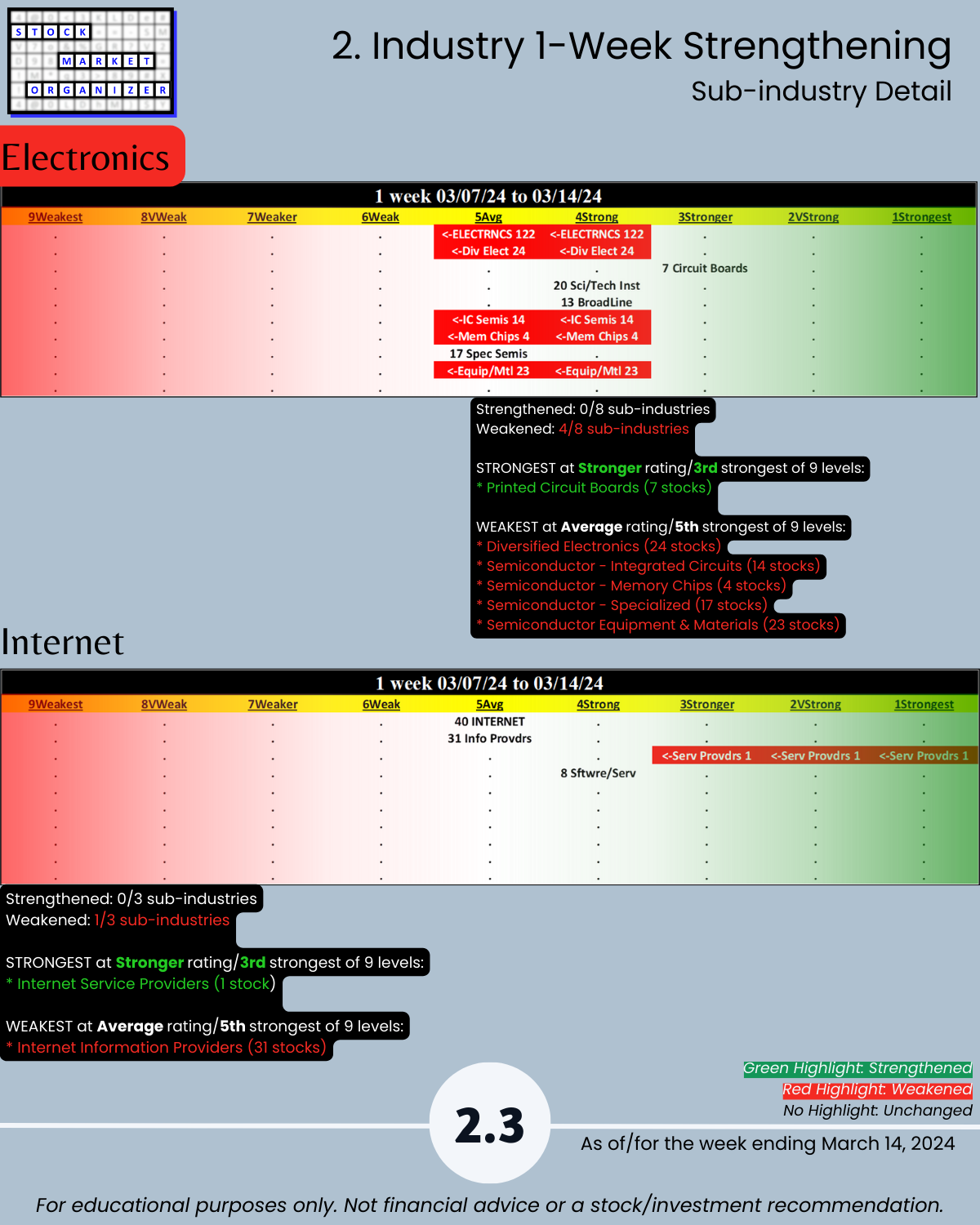 3/14/24 will this Electronics (chips/semis) weak week be the first of several? Helpful Tech sector insights from an objective strength analysis: 🔹 2/5 industries WEAKENED (Software, Electronics) 🔹 Electronics 4/8 sub-industries WEAKENED, 91% NEGATIVE stocks, and almost 1 in 5 stocks <-10% for the week = the opposite of last week with 84% positive stocks and 16% stocks > 10% 🔹 the 5 industries averaged 72% negative stocks (“best” was Internet 60% negative).