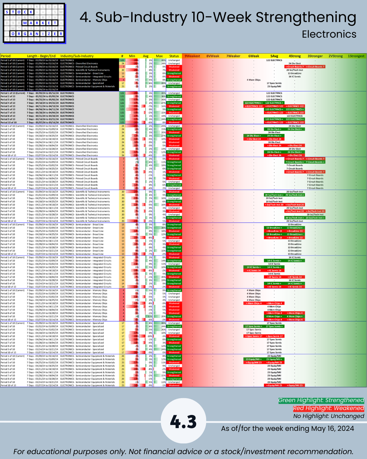 Tech Thursday 5/16/24 – an opinion-free, fat-free, gluten-free chips focus today. (Electronics = semis/chips). Also today, Computer Hardware, Software/Services, Internet, and Telco.