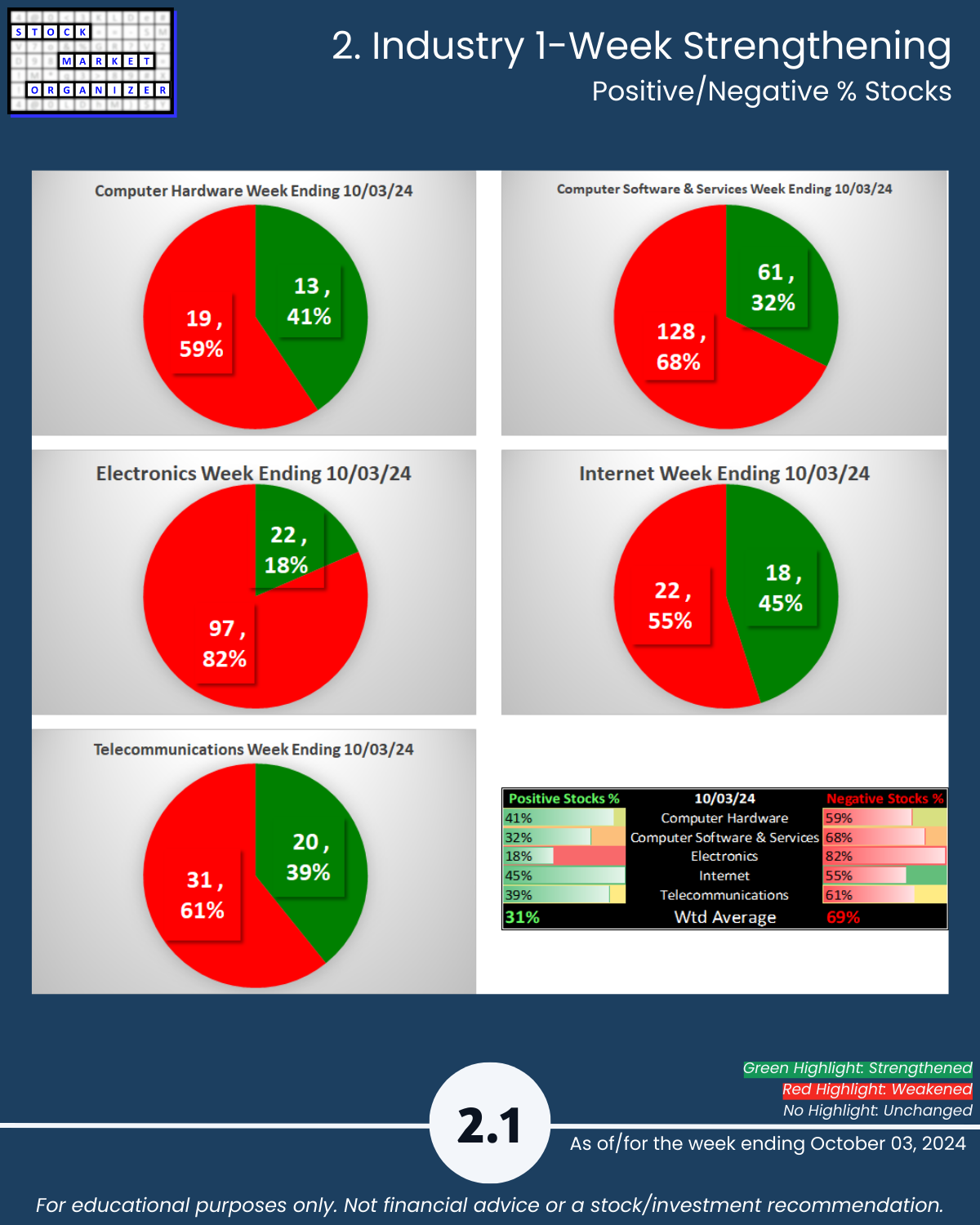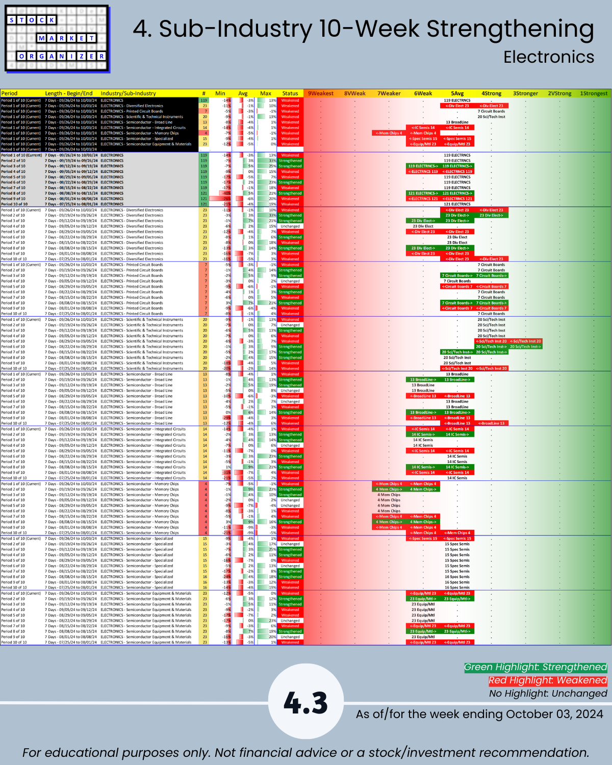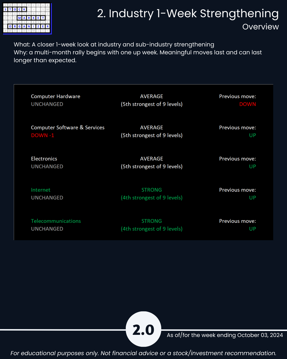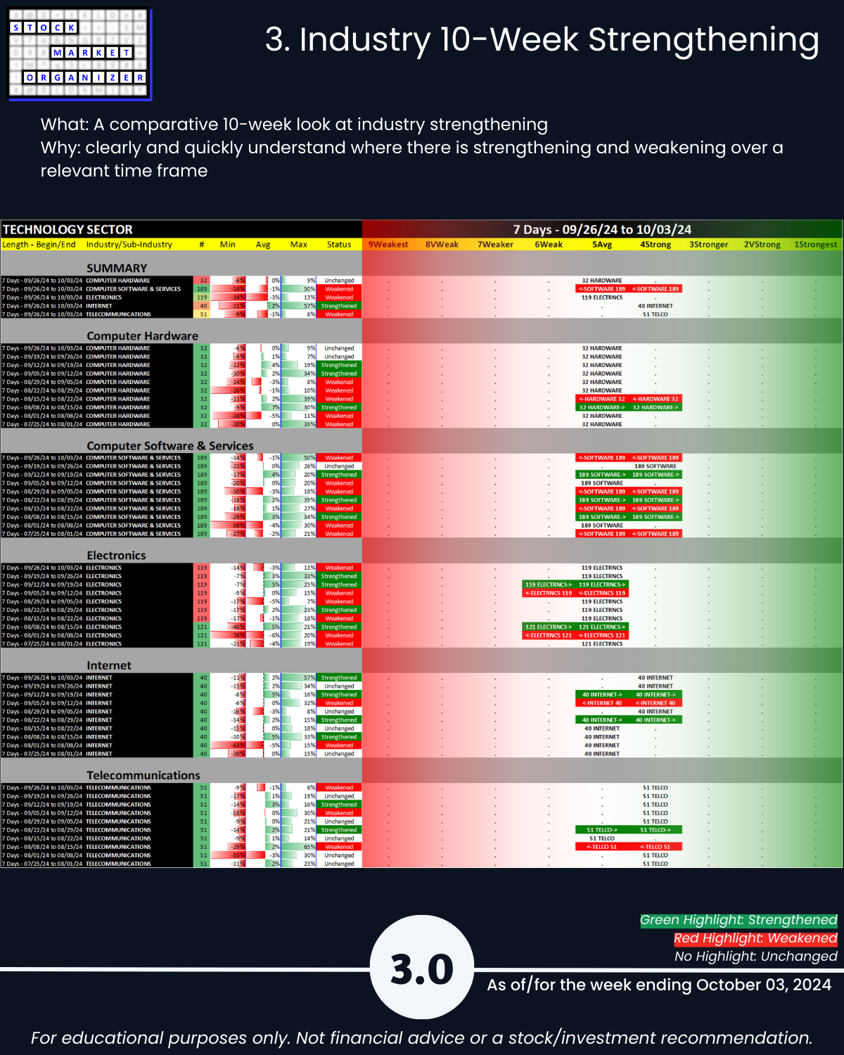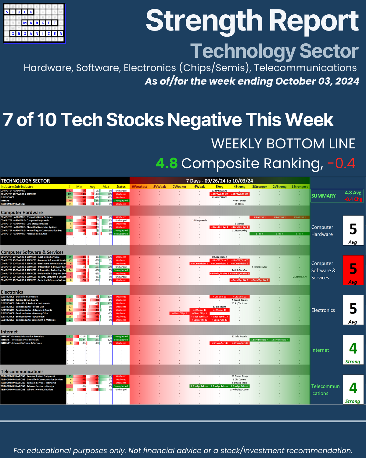 Technology Sector focus as of/for the week ending 10/03/24 (Hardware, Software/Services, Electronics aka Chips/Semis, Internet, Telco). Details below, genuinely unique and unavailable elsewhere because I created this method from scratch to answer on an on-going basis the following question: “Where is there strengthening and weakening in the market at the stock, sub-industry, and industry levels?”