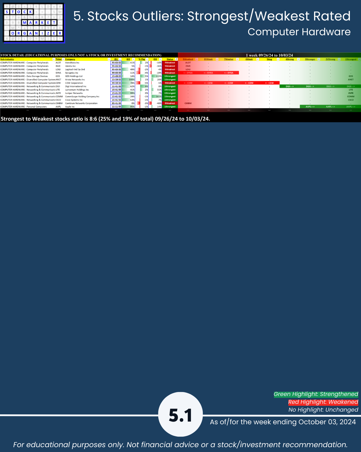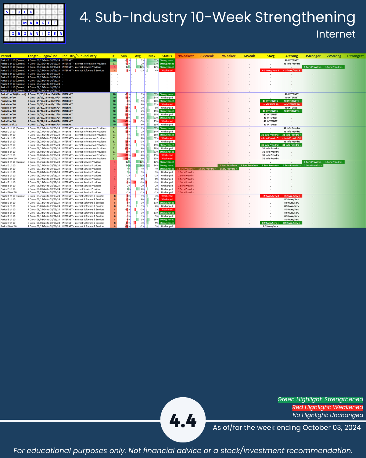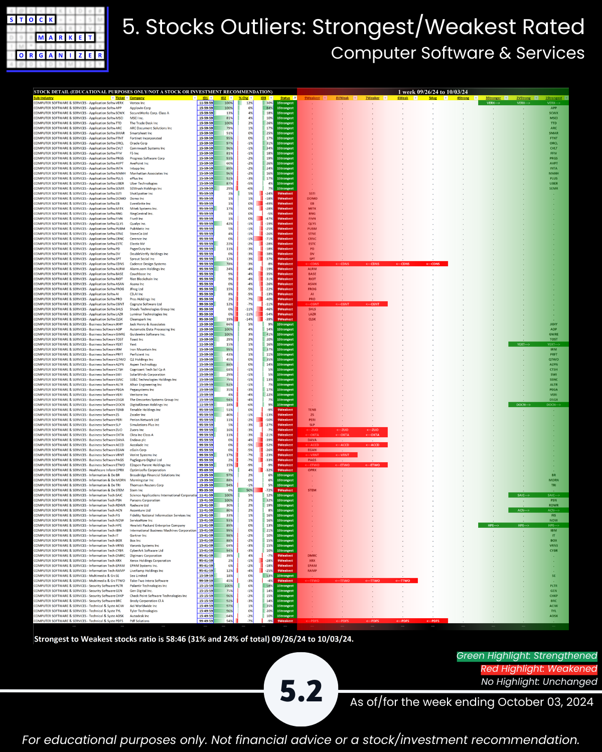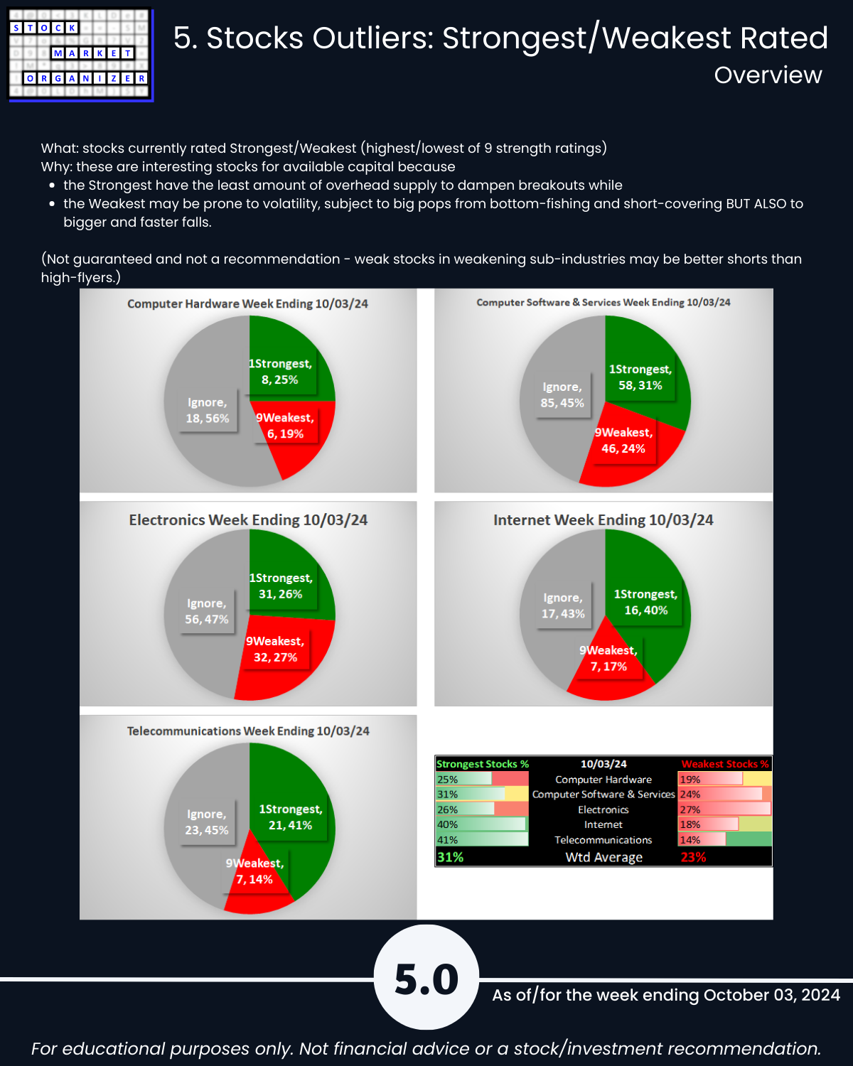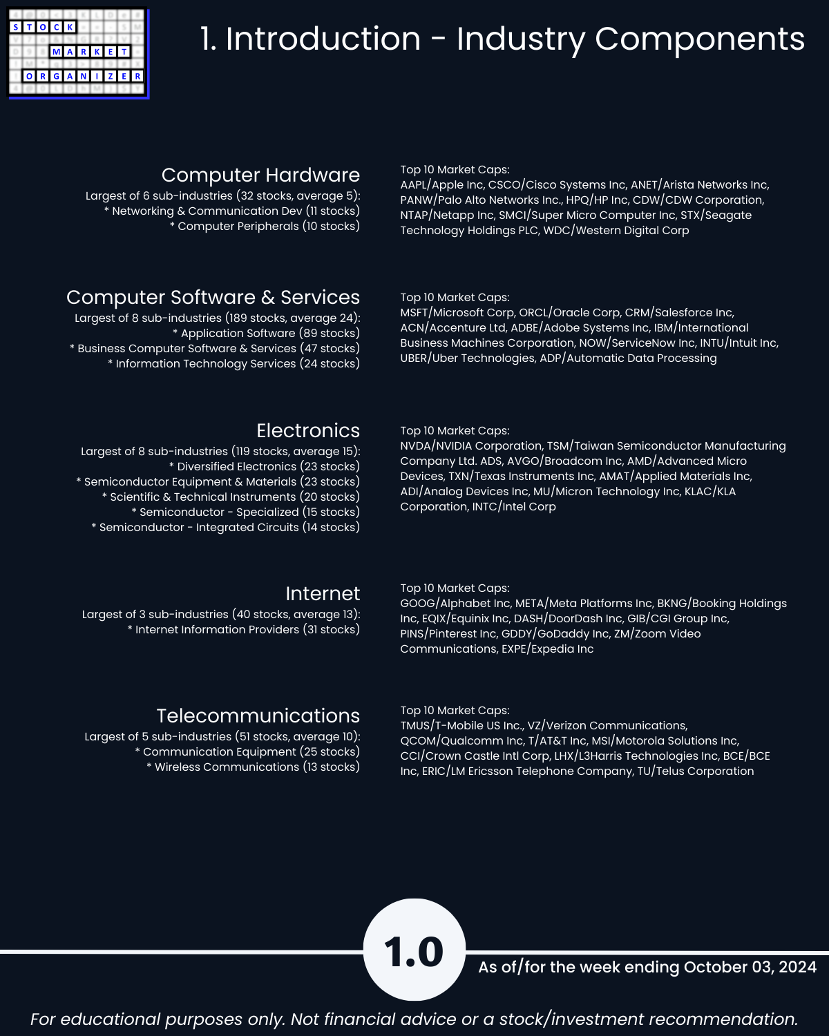 Technology Sector focus as of/for the week ending 10/03/24 (Hardware, Software/Services, Electronics aka Chips/Semis, Internet, Telco). Details below, genuinely unique and unavailable elsewhere because I created this method from scratch to answer on an on-going basis the following question: “Where is there strengthening and weakening in the market at the stock, sub-industry, and industry levels?”