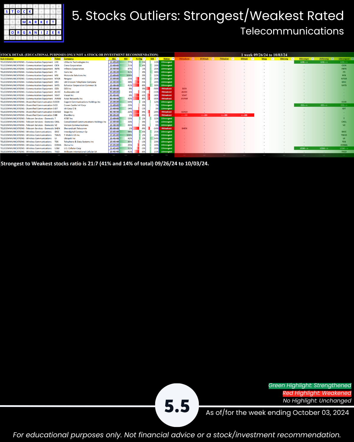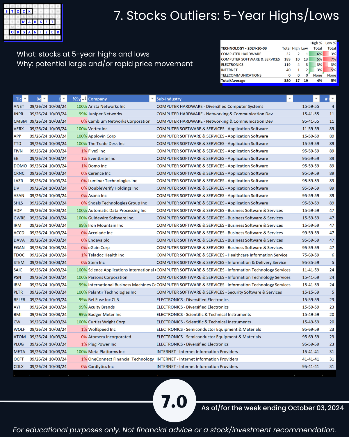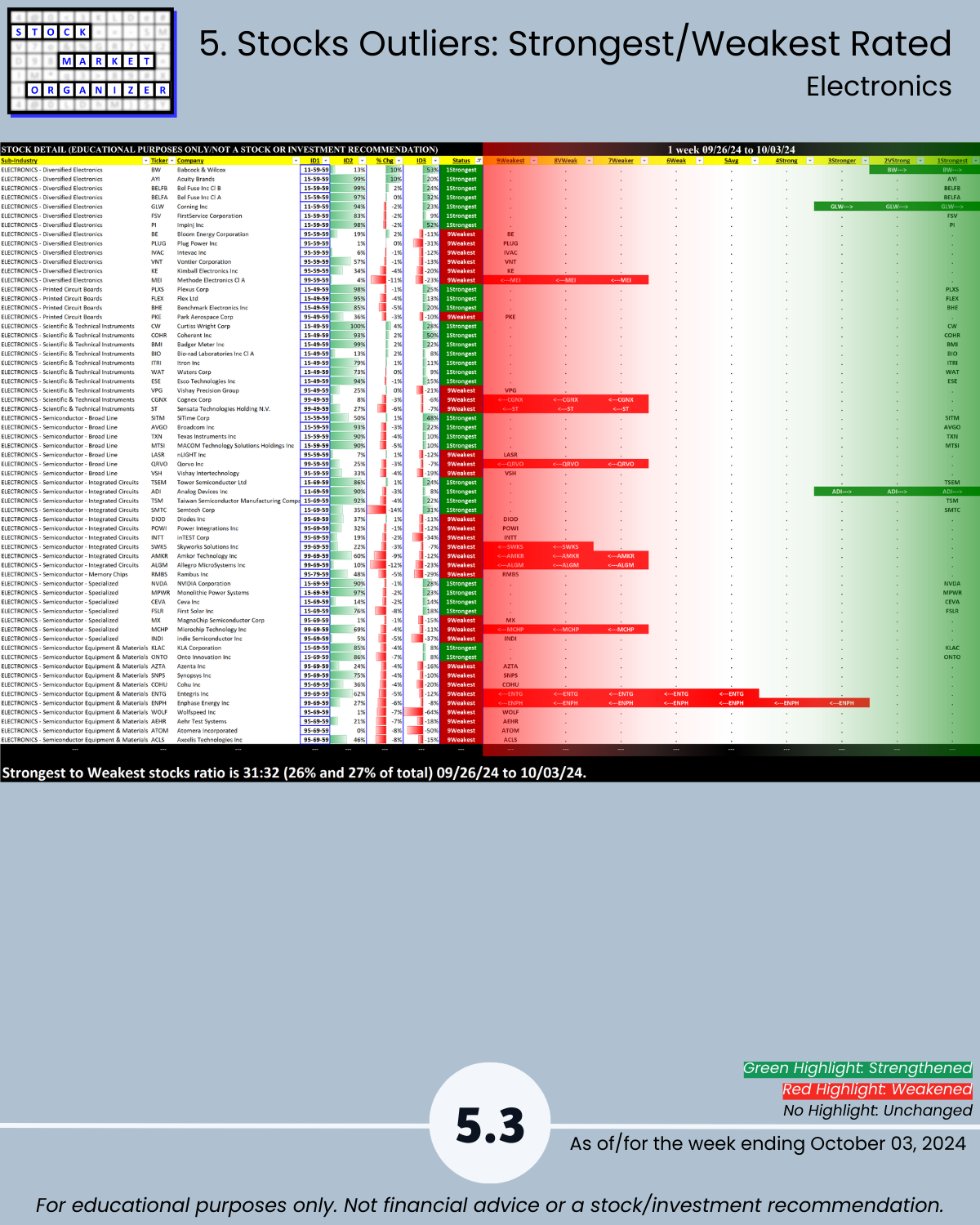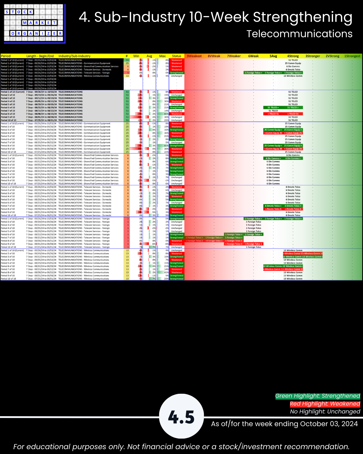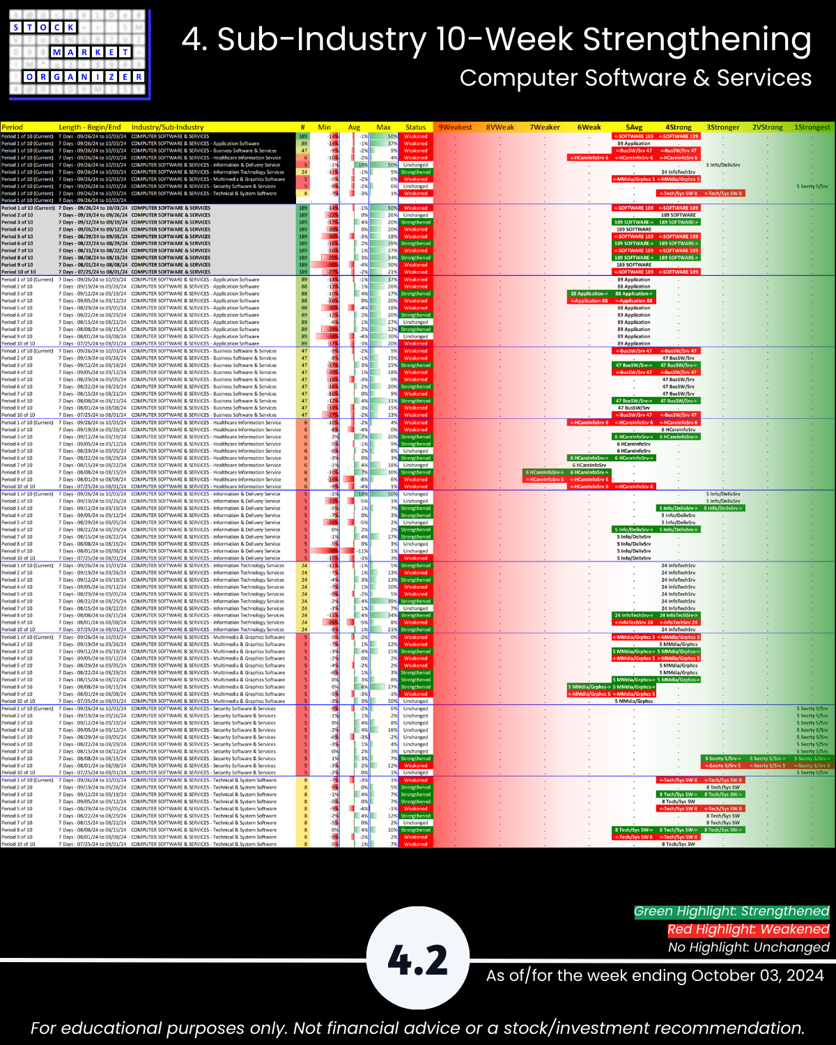 Technology Sector focus as of/for the week ending 10/03/24 (Hardware, Software/Services, Electronics aka Chips/Semis, Internet, Telco). Details below, genuinely unique and unavailable elsewhere because I created this method from scratch to answer on an on-going basis the following question: “Where is there strengthening and weakening in the market at the stock, sub-industry, and industry levels?”