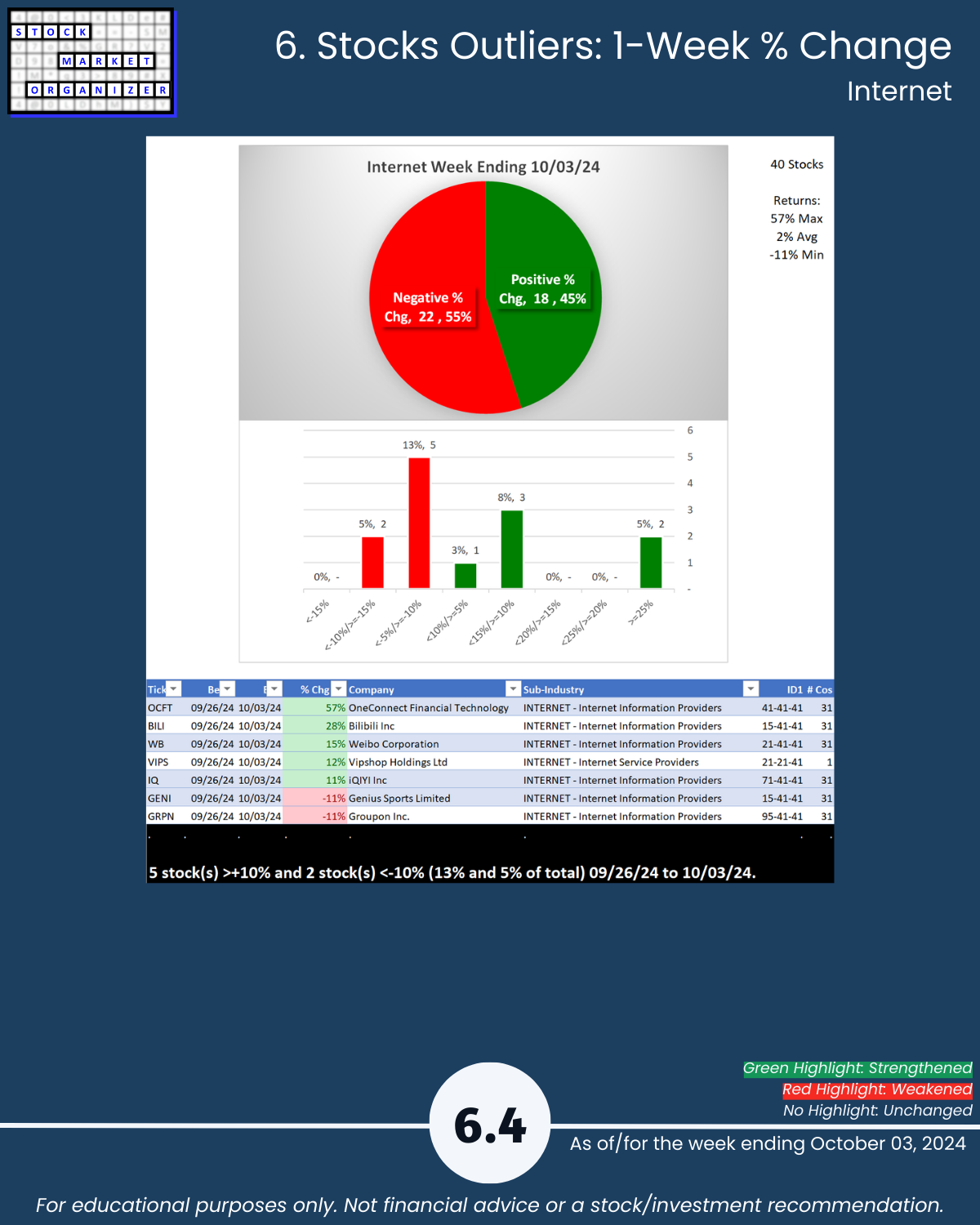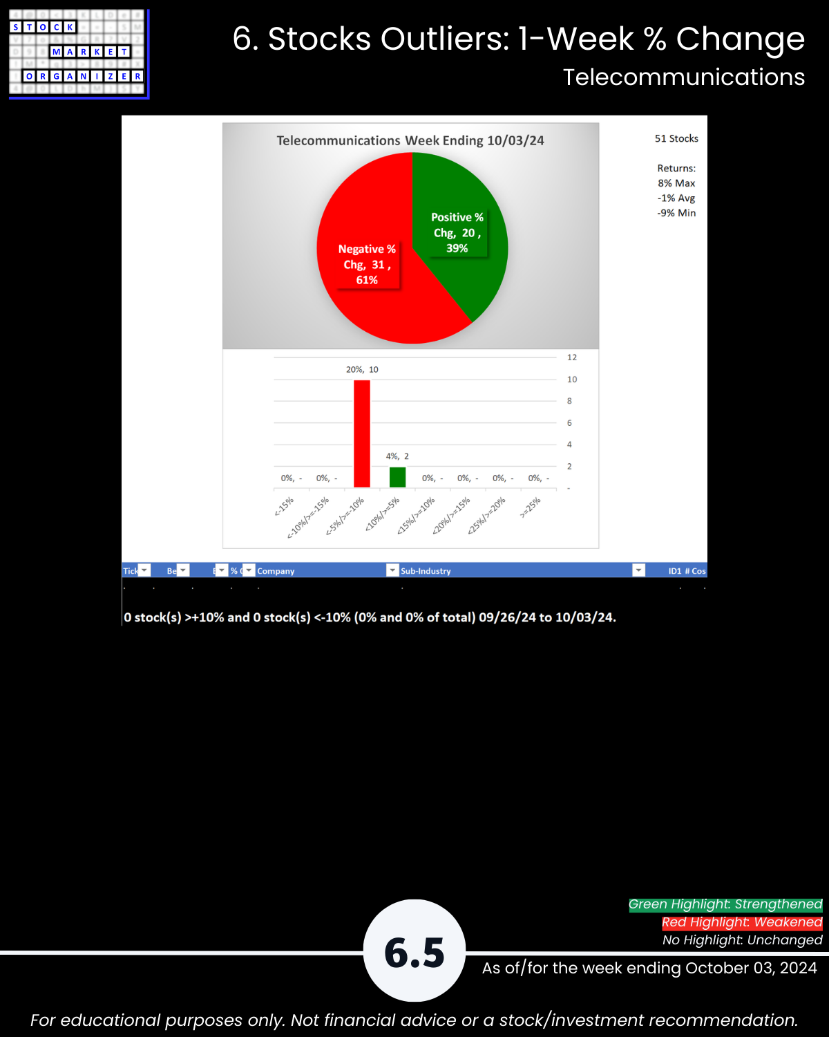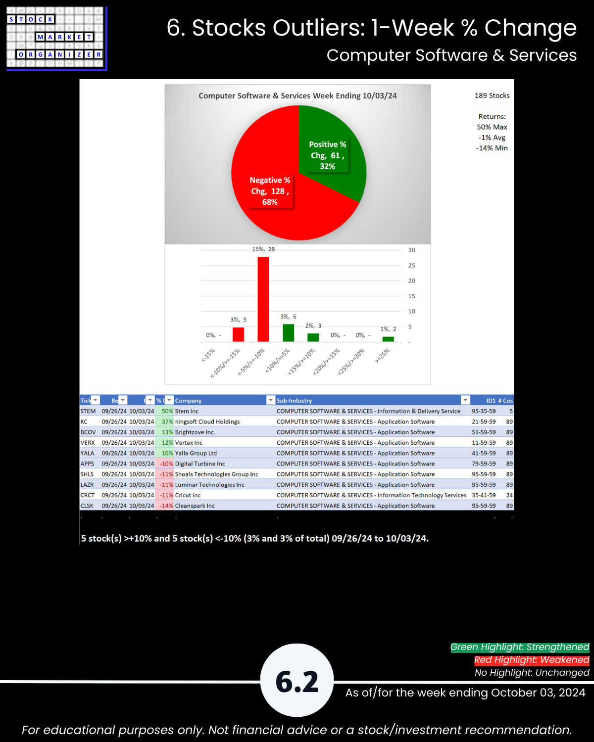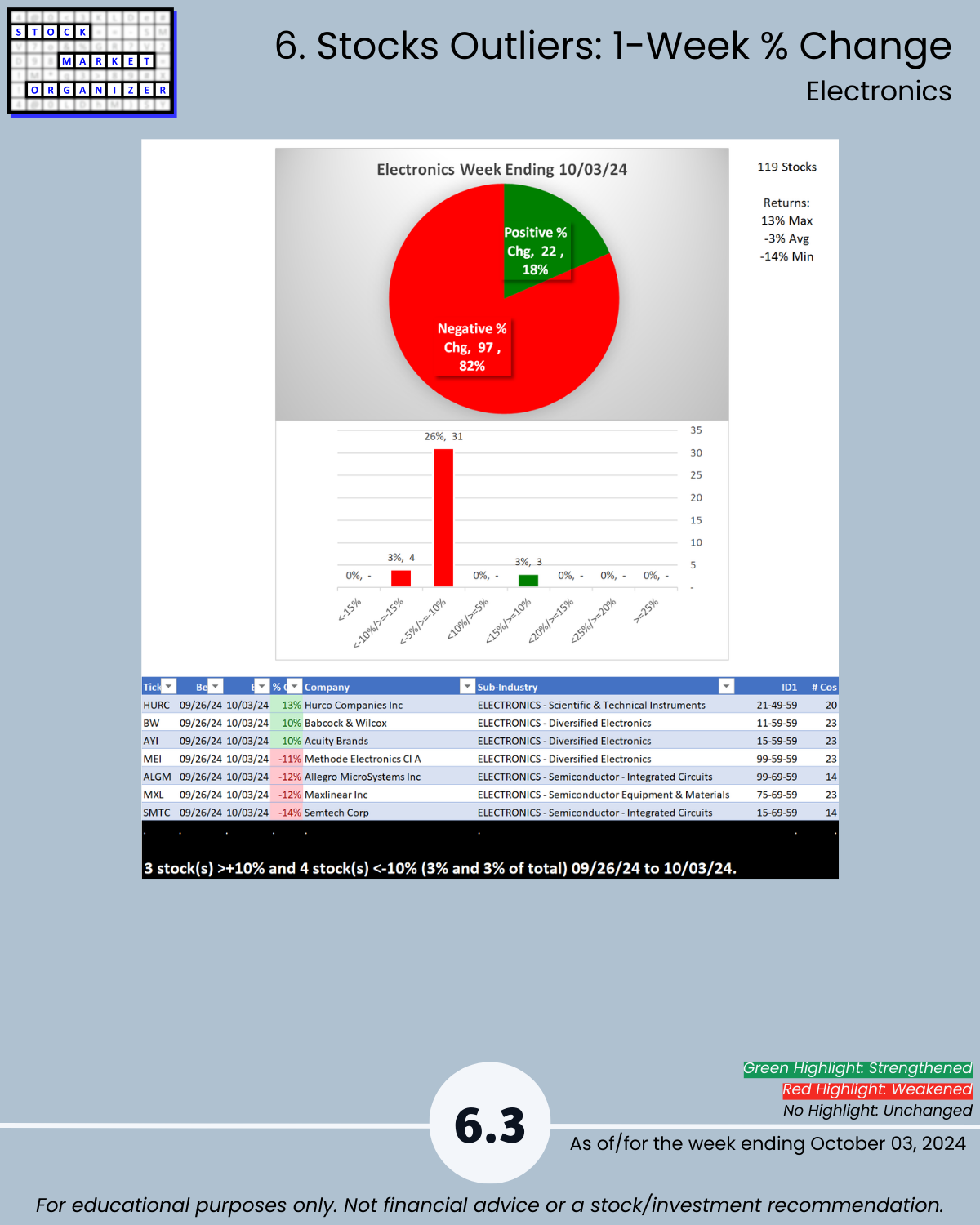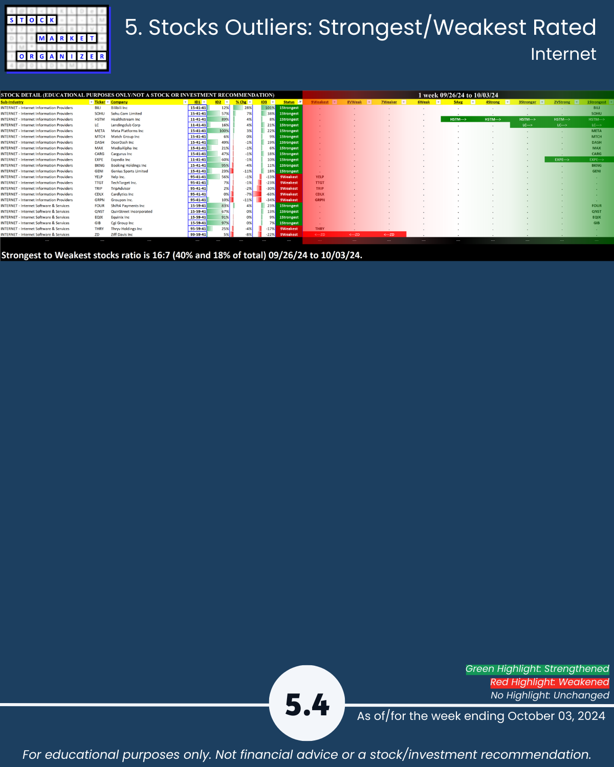 Technology Sector focus as of/for the week ending 10/03/24 (Hardware, Software/Services, Electronics aka Chips/Semis, Internet, Telco). Details below, genuinely unique and unavailable elsewhere because I created this method from scratch to answer on an on-going basis the following question: “Where is there strengthening and weakening in the market at the stock, sub-industry, and industry levels?”