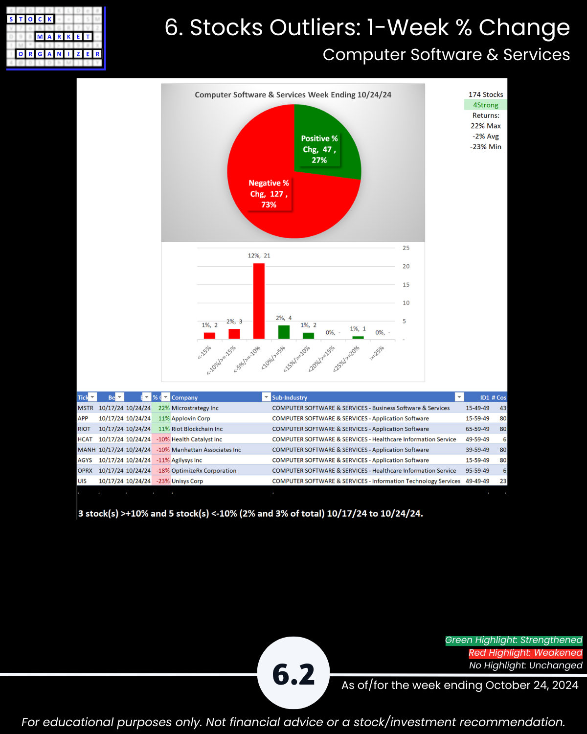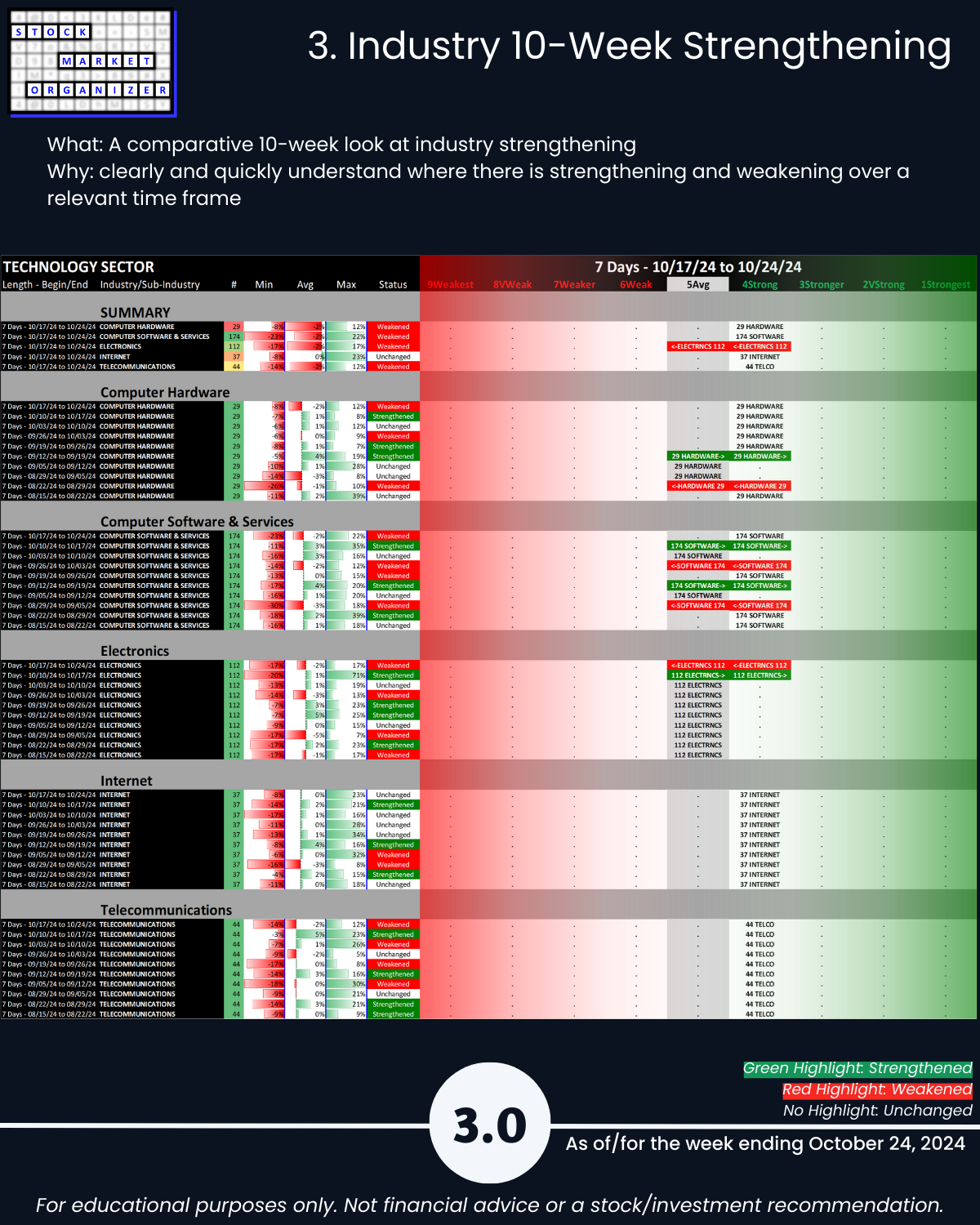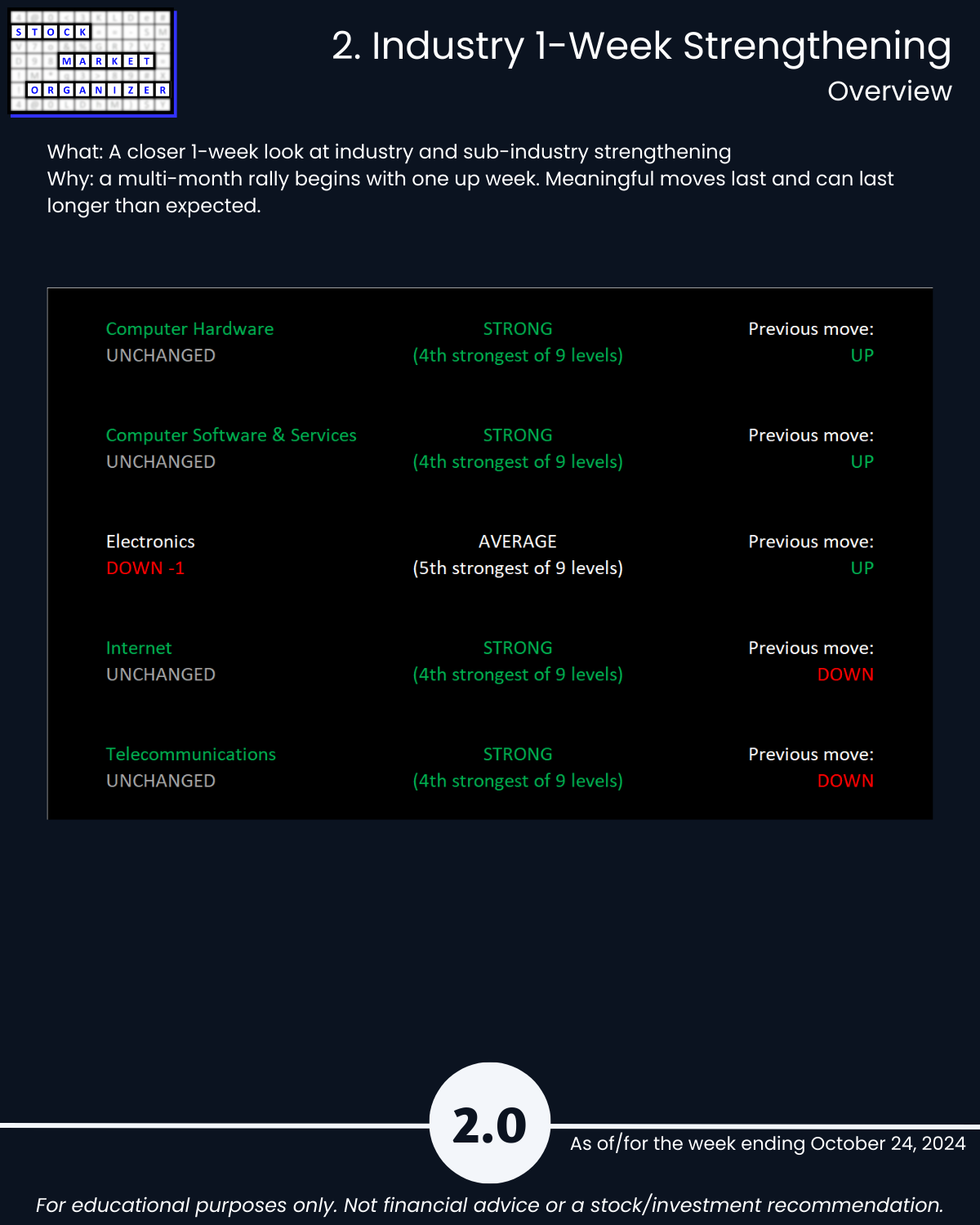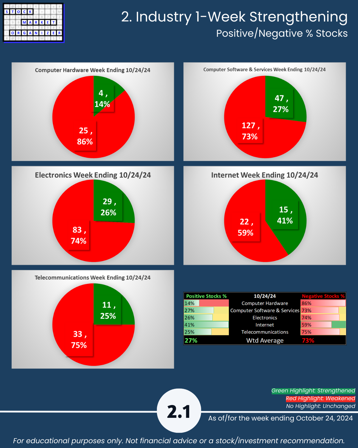 For the week ending Thursday, October 24, 2024, mild Weakening in Computer Hardware, Computer Software & Services, Electronics (Chips/Semiconductors), Internet, and Telecommunications.