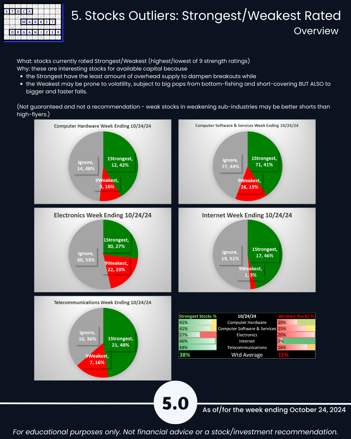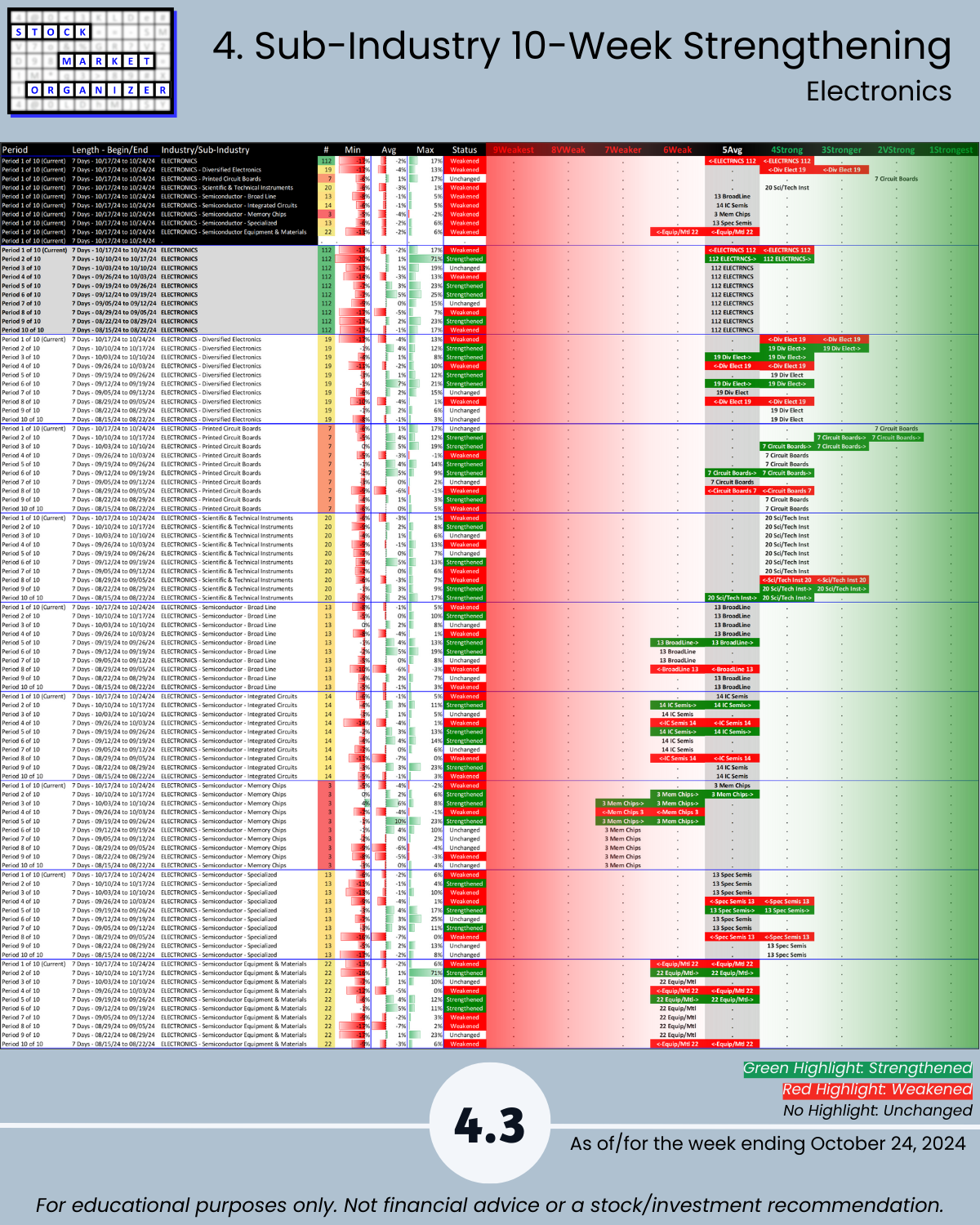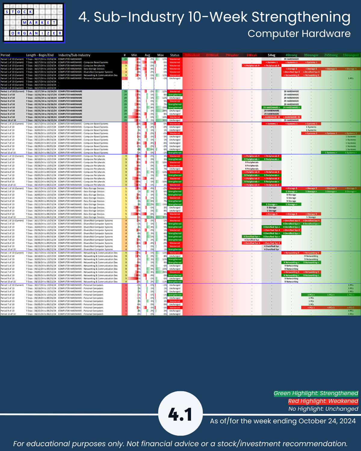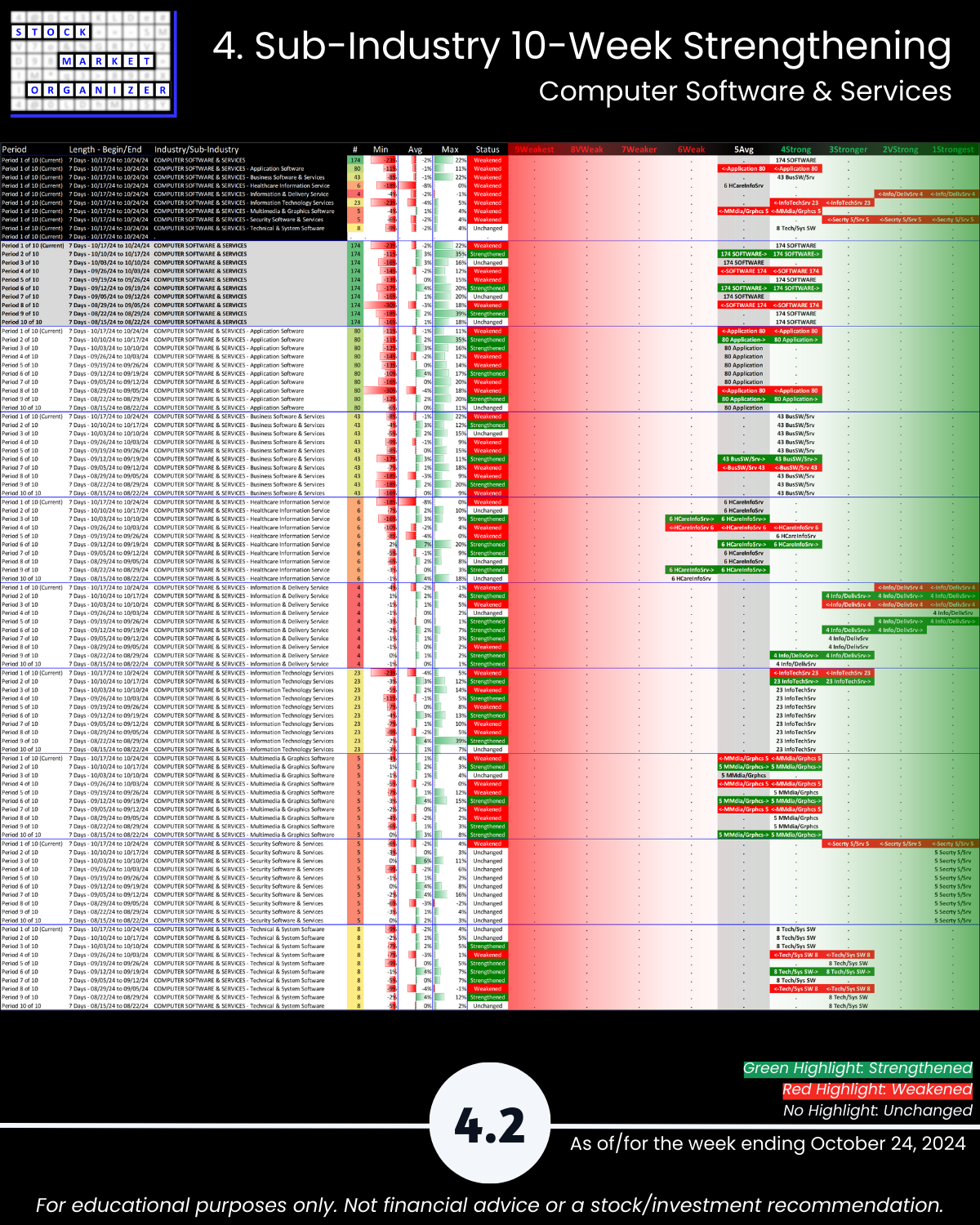 For the week ending Thursday, October 24, 2024, mild Weakening in Computer Hardware, Computer Software & Services, Electronics (Chips/Semiconductors), Internet, and Telecommunications.