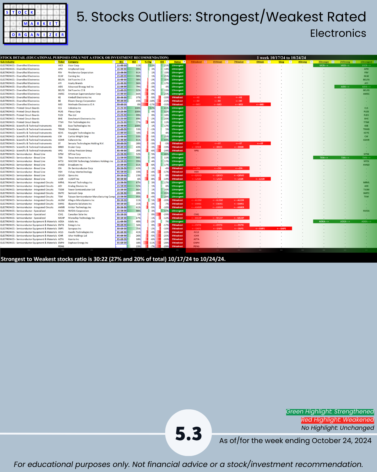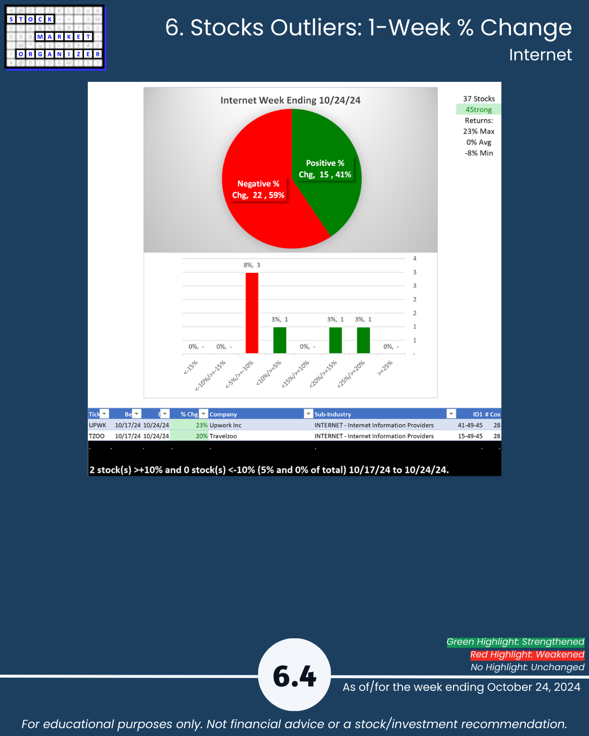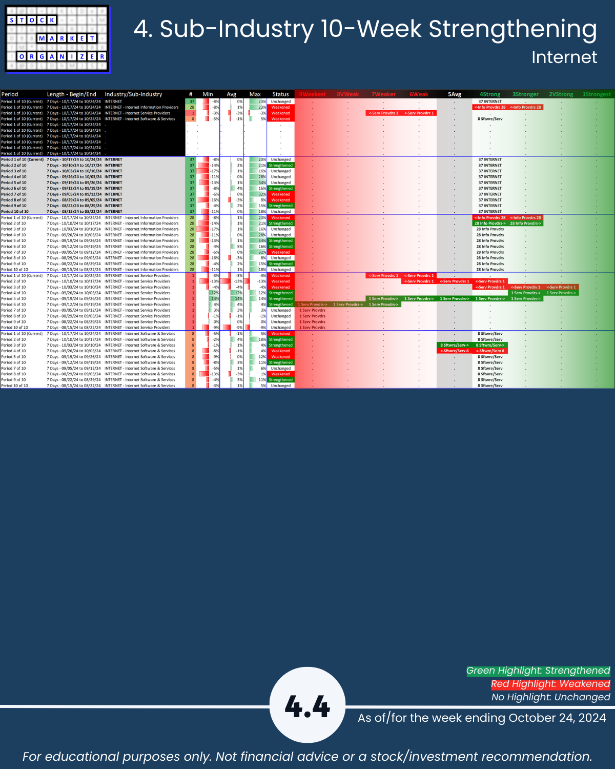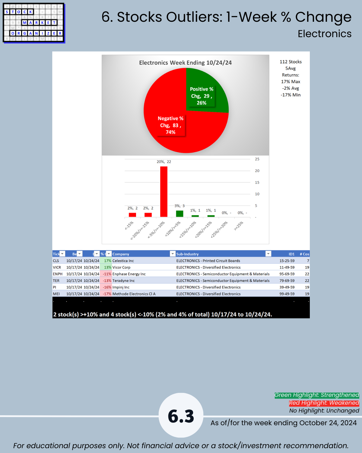 For the week ending Thursday, October 24, 2024, mild Weakening in Computer Hardware, Computer Software & Services, Electronics (Chips/Semiconductors), Internet, and Telecommunications.