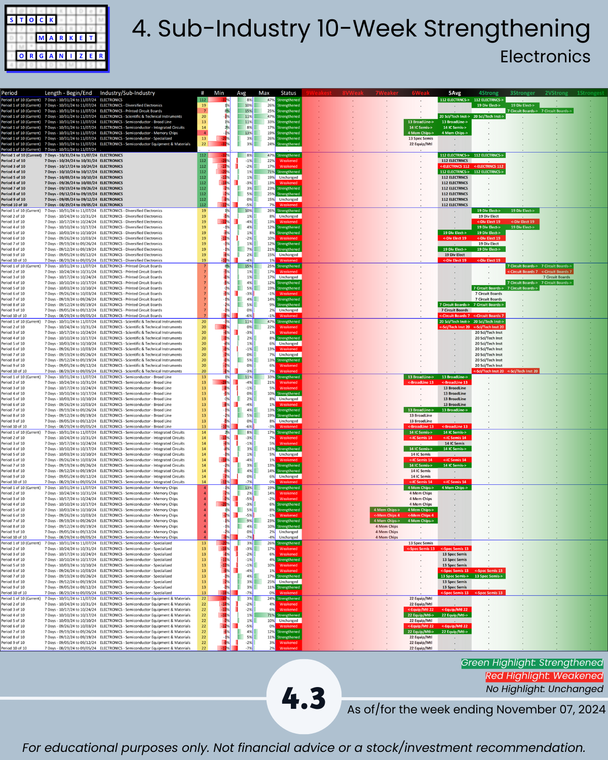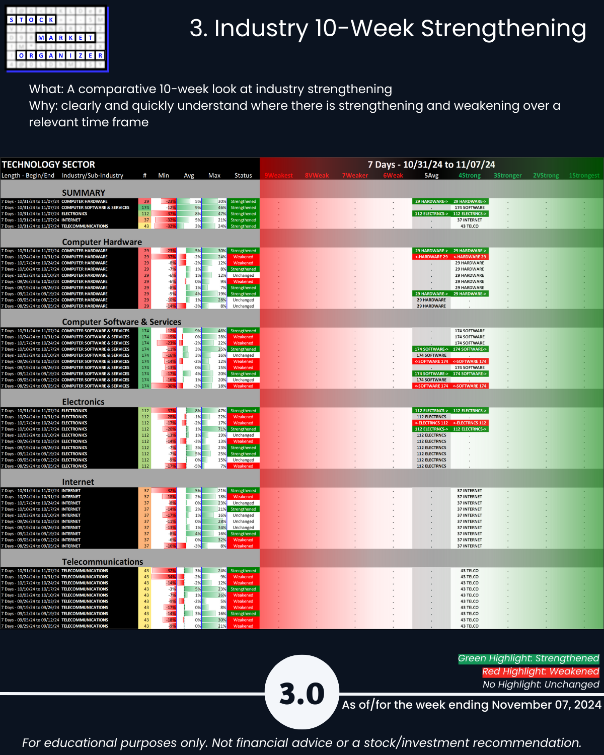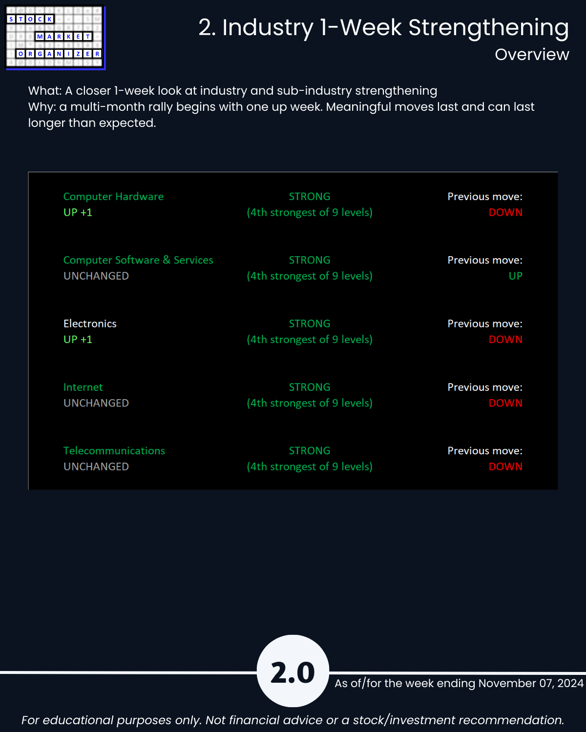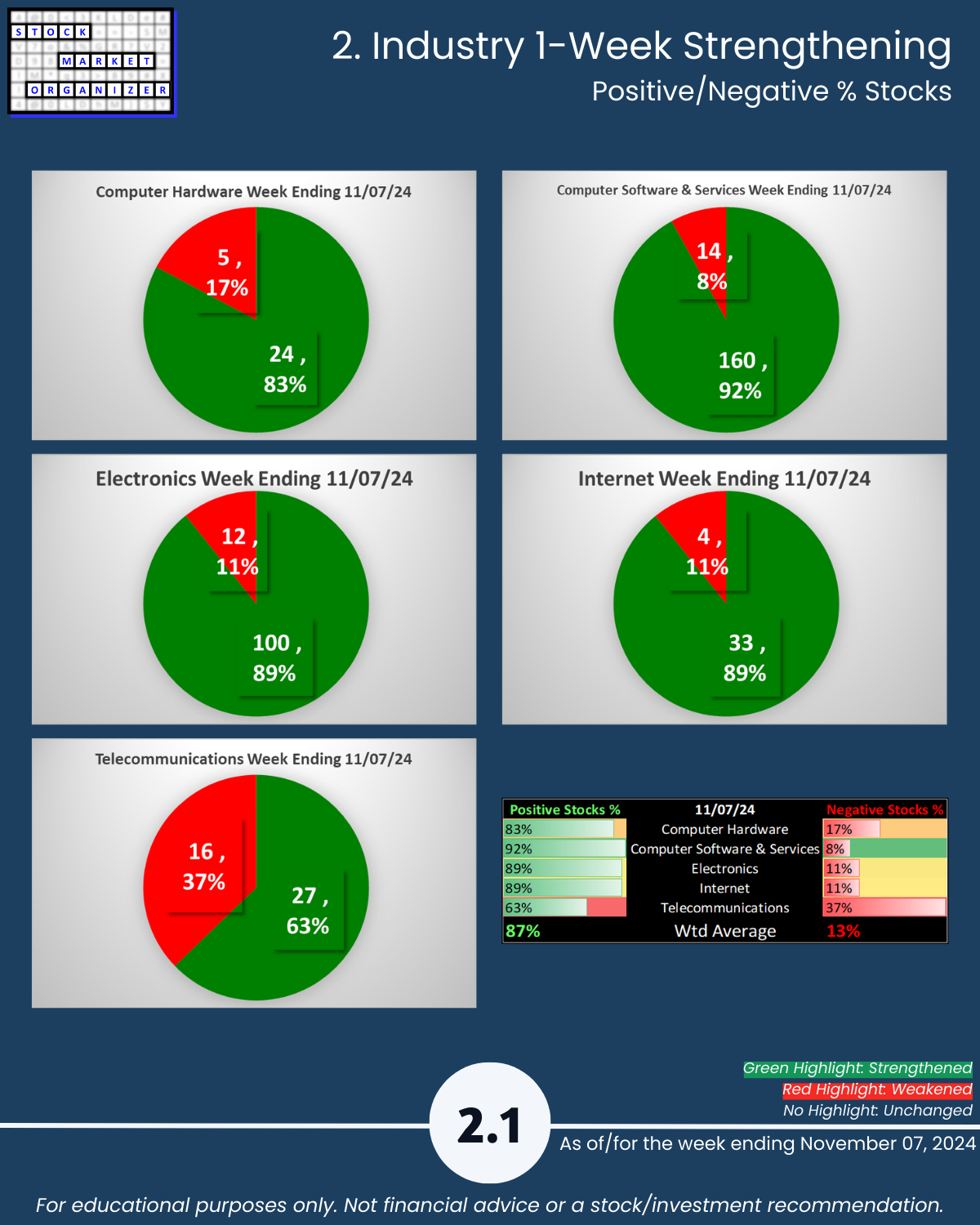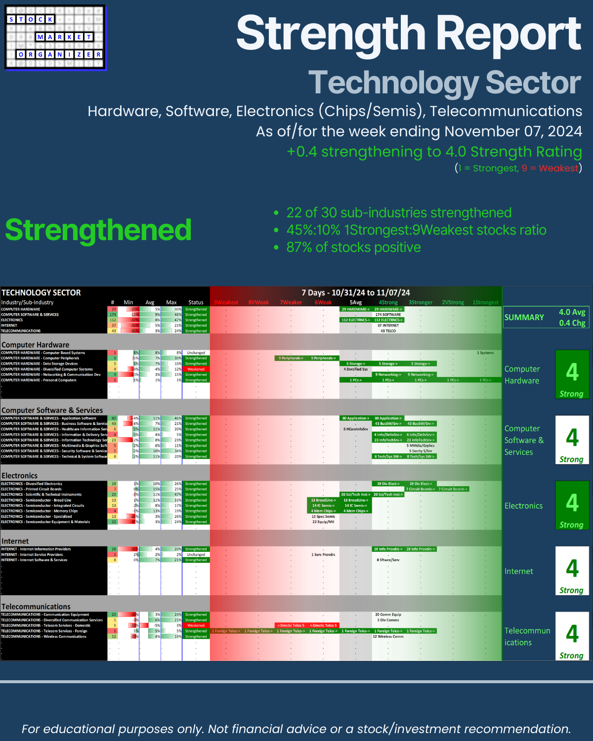 For the week ending Thursday, November 7, 2024, STRENGTHENING in Computer Hardware, Computer Software & Services, Electronics (Chips/Semiconductors), Internet, and Telecommunications.