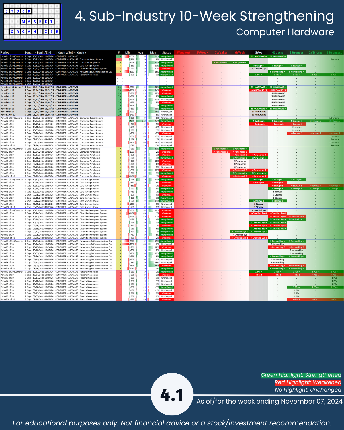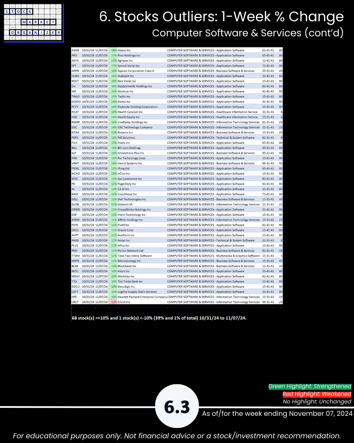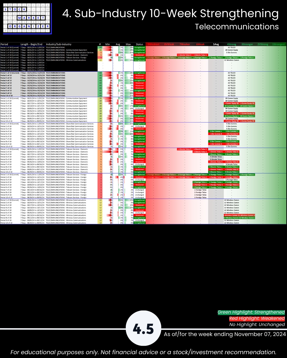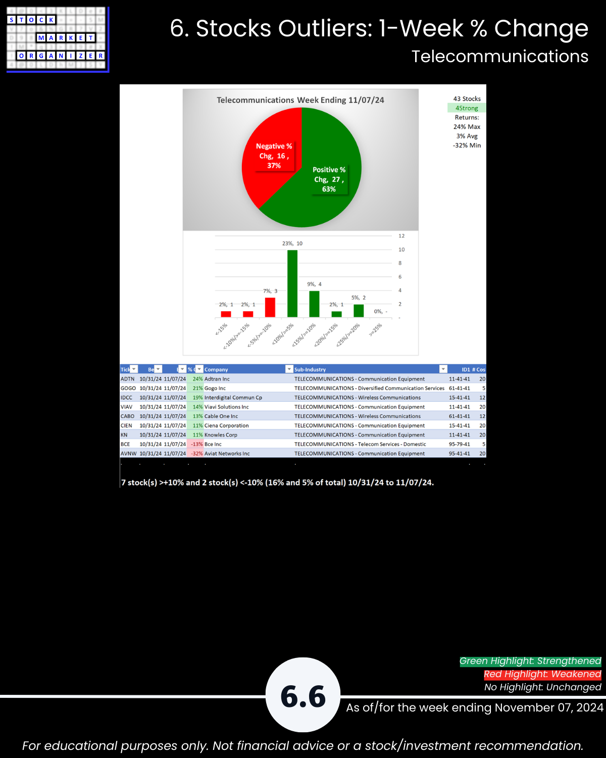 For the week ending Thursday, November 7, 2024, STRENGTHENING in Computer Hardware, Computer Software & Services, Electronics (Chips/Semiconductors), Internet, and Telecommunications.