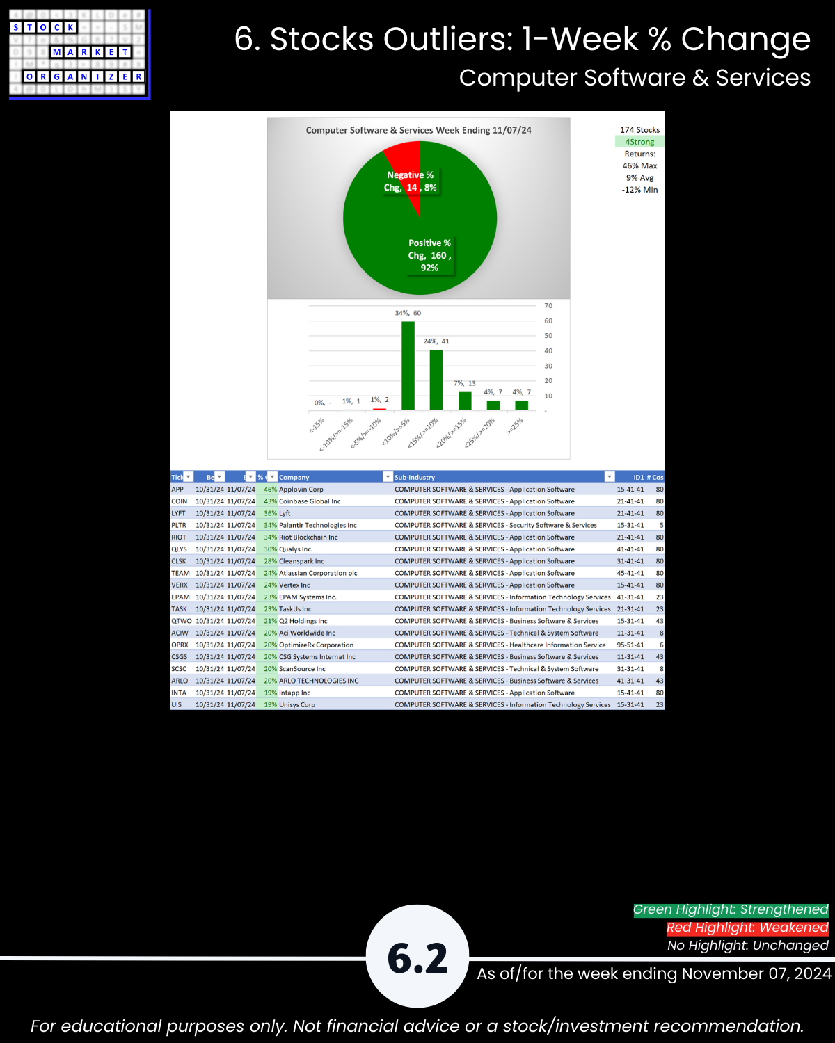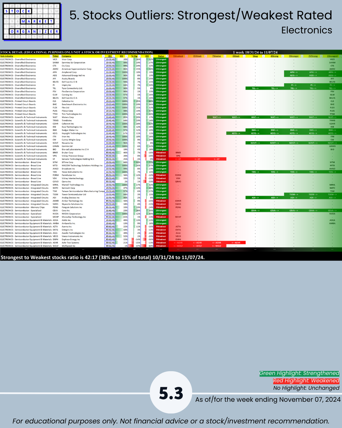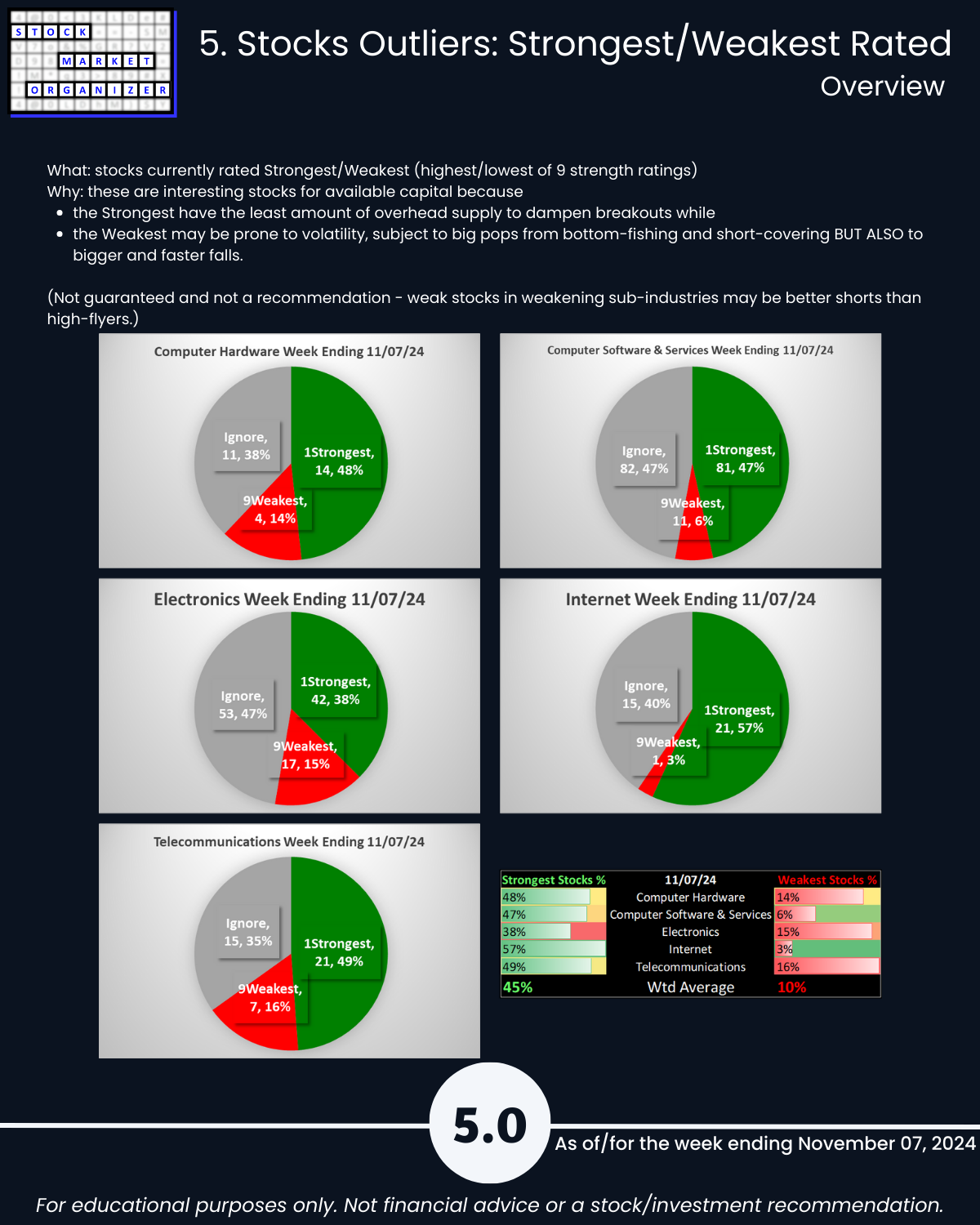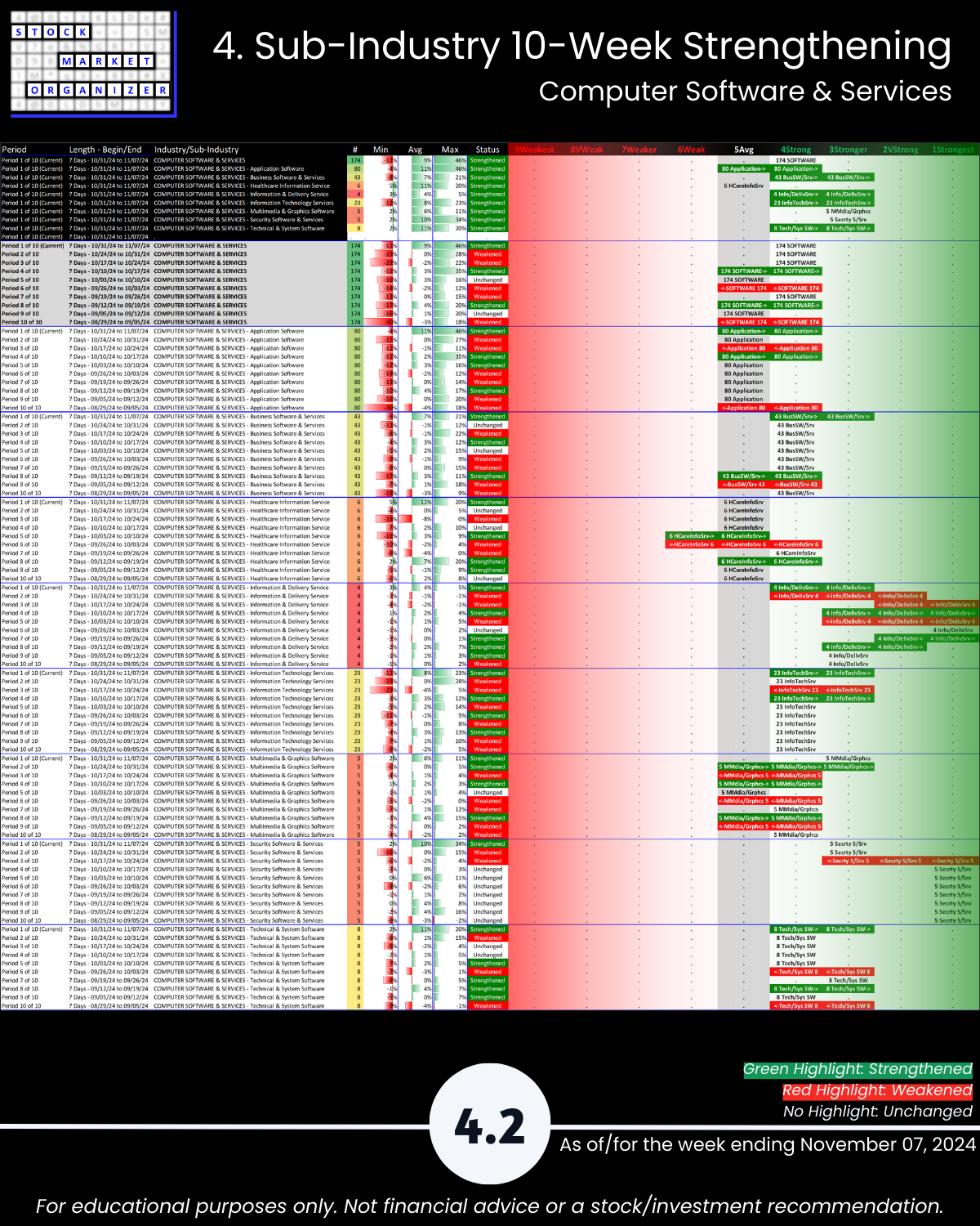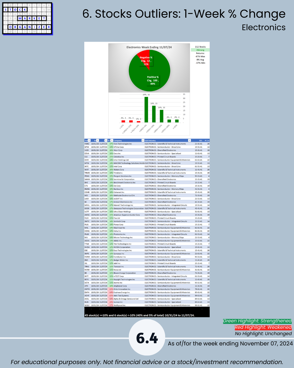 For the week ending Thursday, November 7, 2024, STRENGTHENING in Computer Hardware, Computer Software & Services, Electronics (Chips/Semiconductors), Internet, and Telecommunications.
