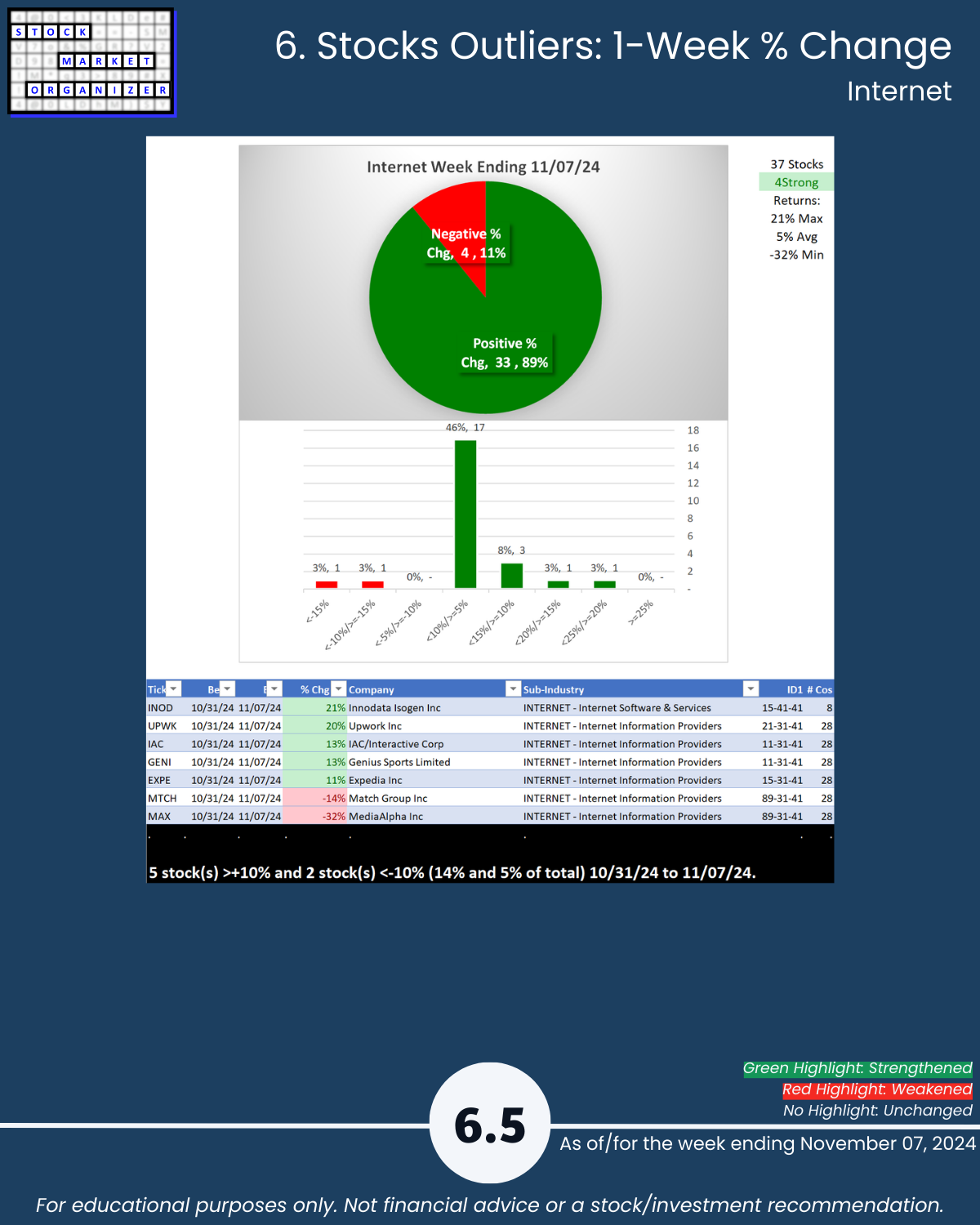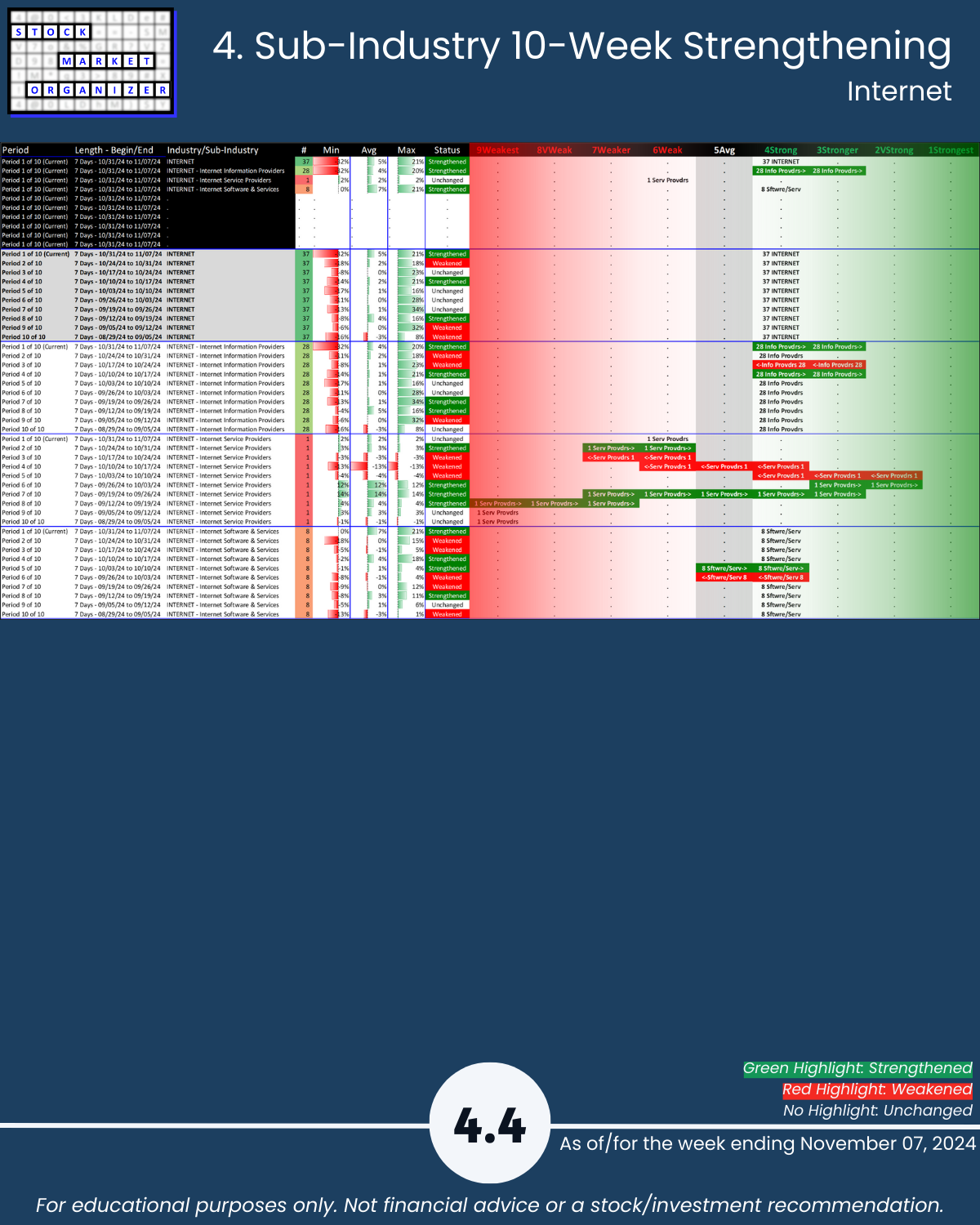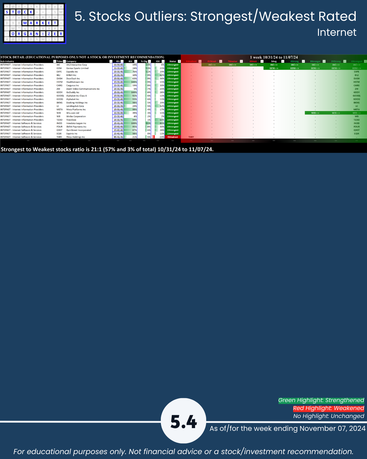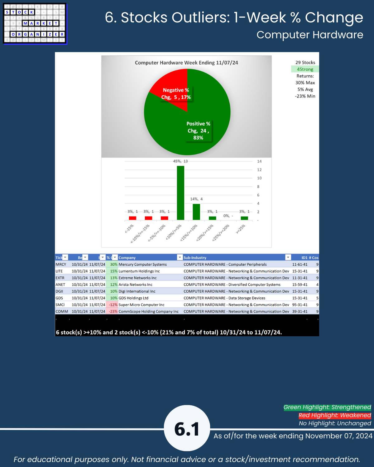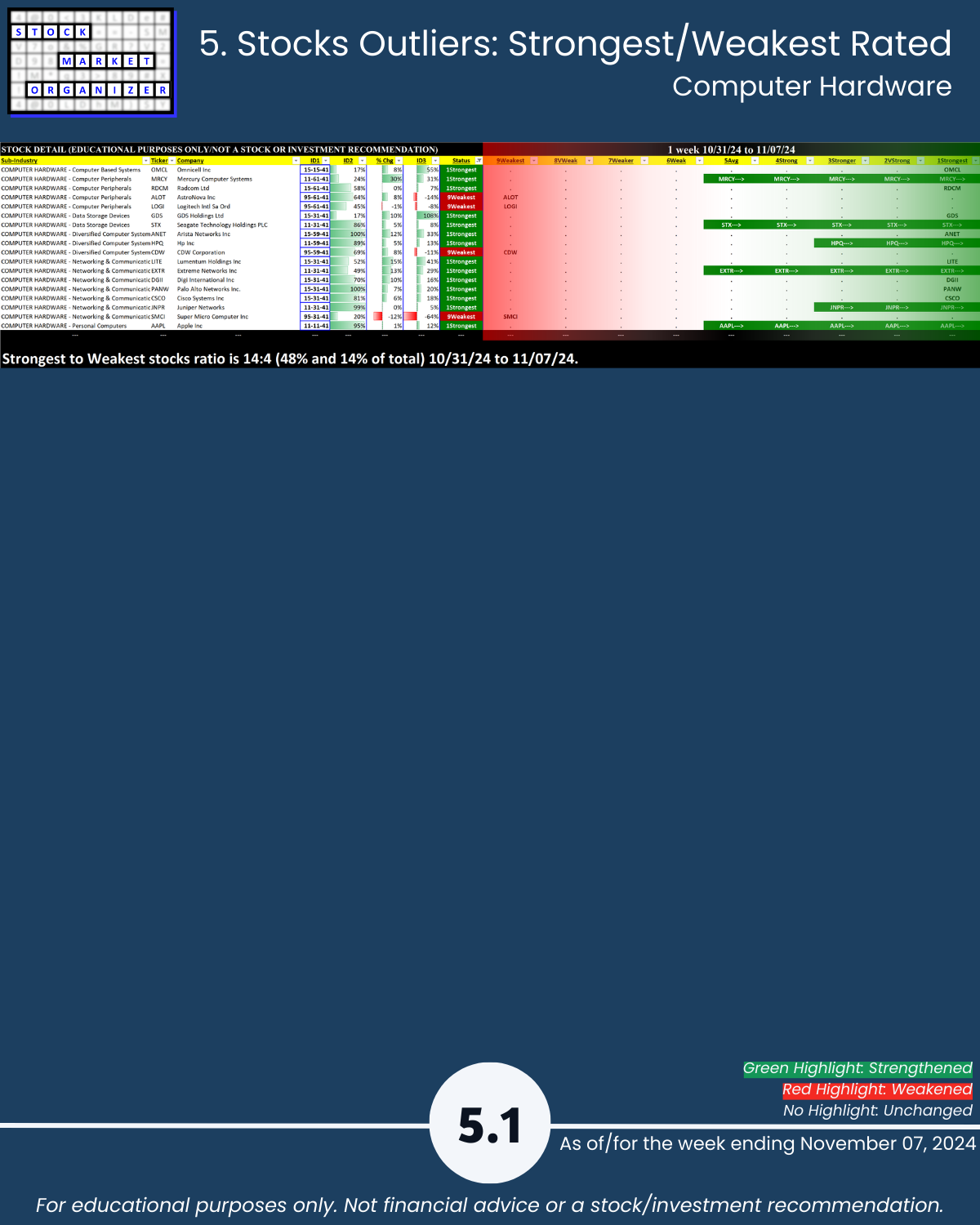 For the week ending Thursday, November 7, 2024, STRENGTHENING in Computer Hardware, Computer Software & Services, Electronics (Chips/Semiconductors), Internet, and Telecommunications.