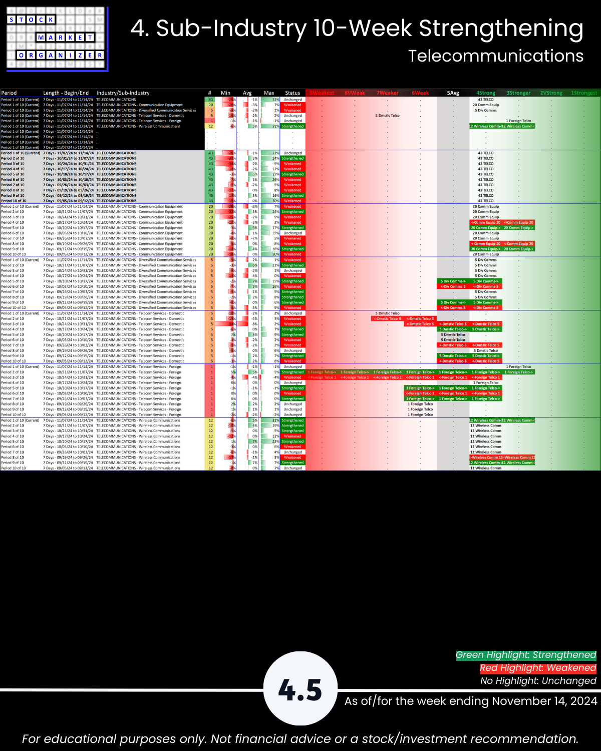 Internet and Telecommunications both have remained 4Strong for the past 10 weeks. The other three industries have swapped back and forth between 4Strong and 5Average during this period.