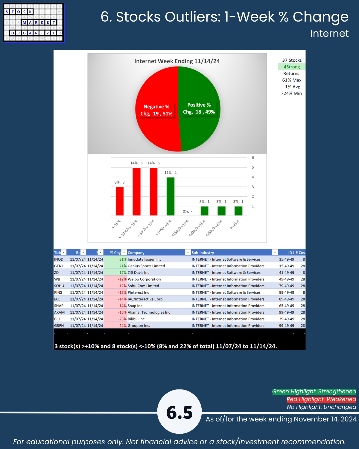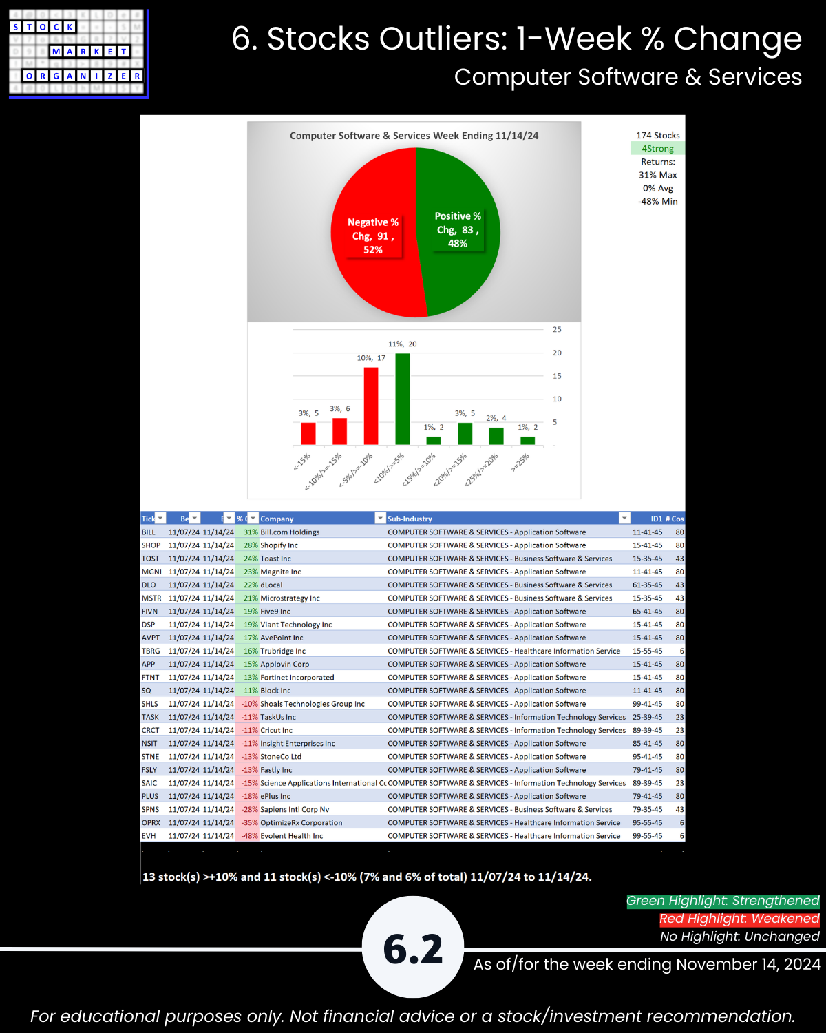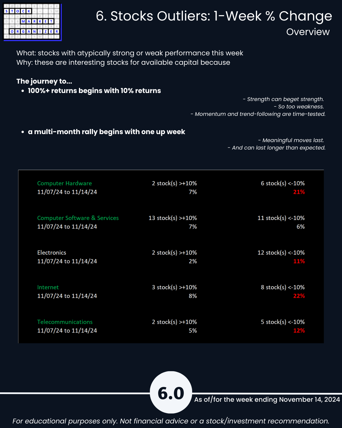 Electronics page 6.4 shows a huge imbalance of positive vs. negative stocks with Computer Hardware page 6.1 also suffering. The other three industries were all slightly more than 50% negative. Note the detail revealing large outliers on each industry page - these can flag newly "in-play" stocks.