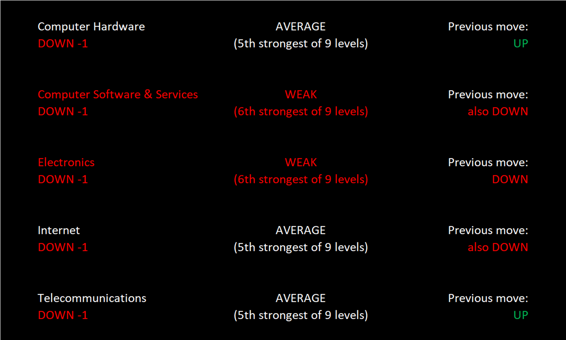 The Technology Sector weakened by -1.0 points to a 5.7 composite score this week. All five industries weakened enough to change rating.