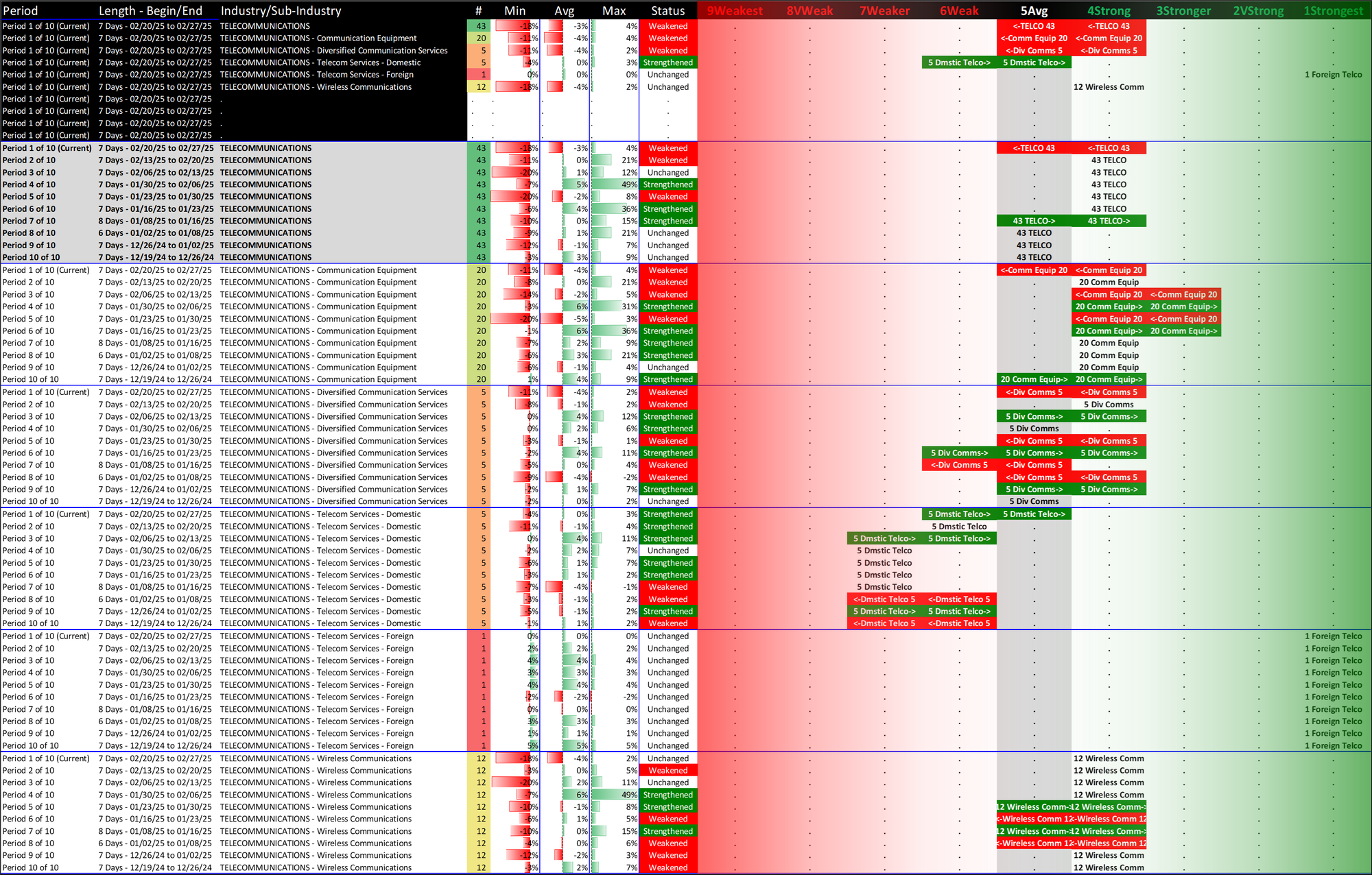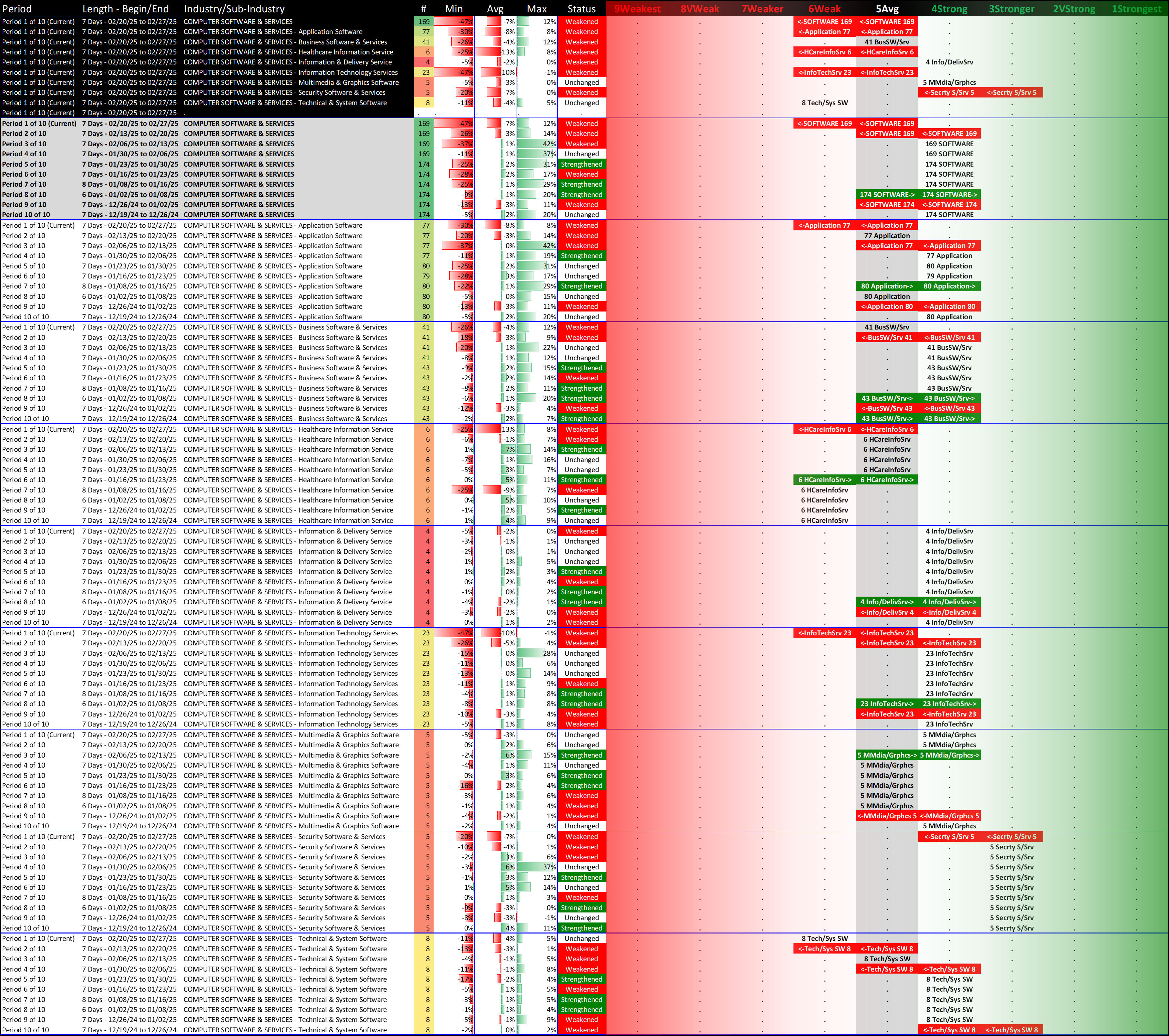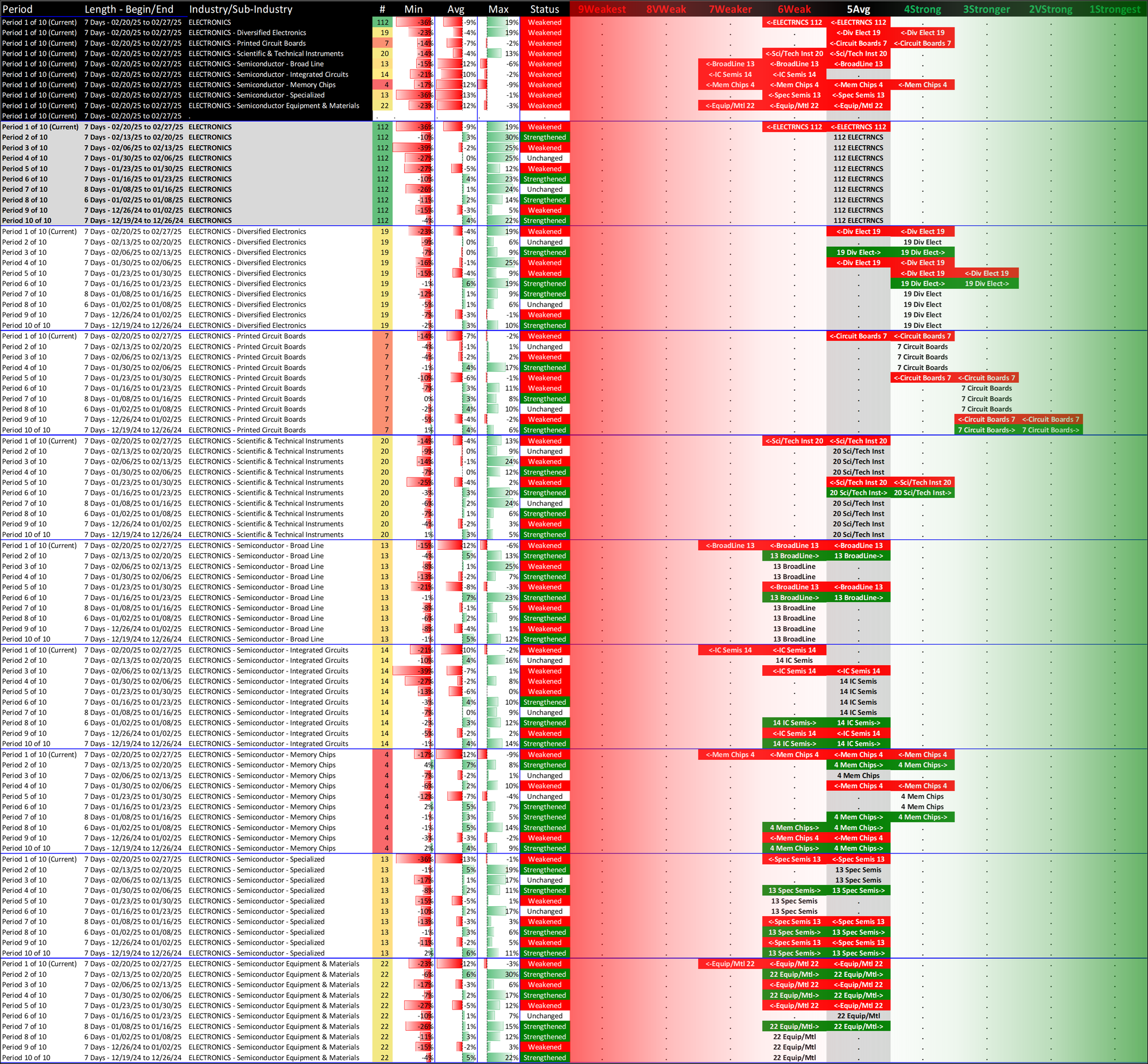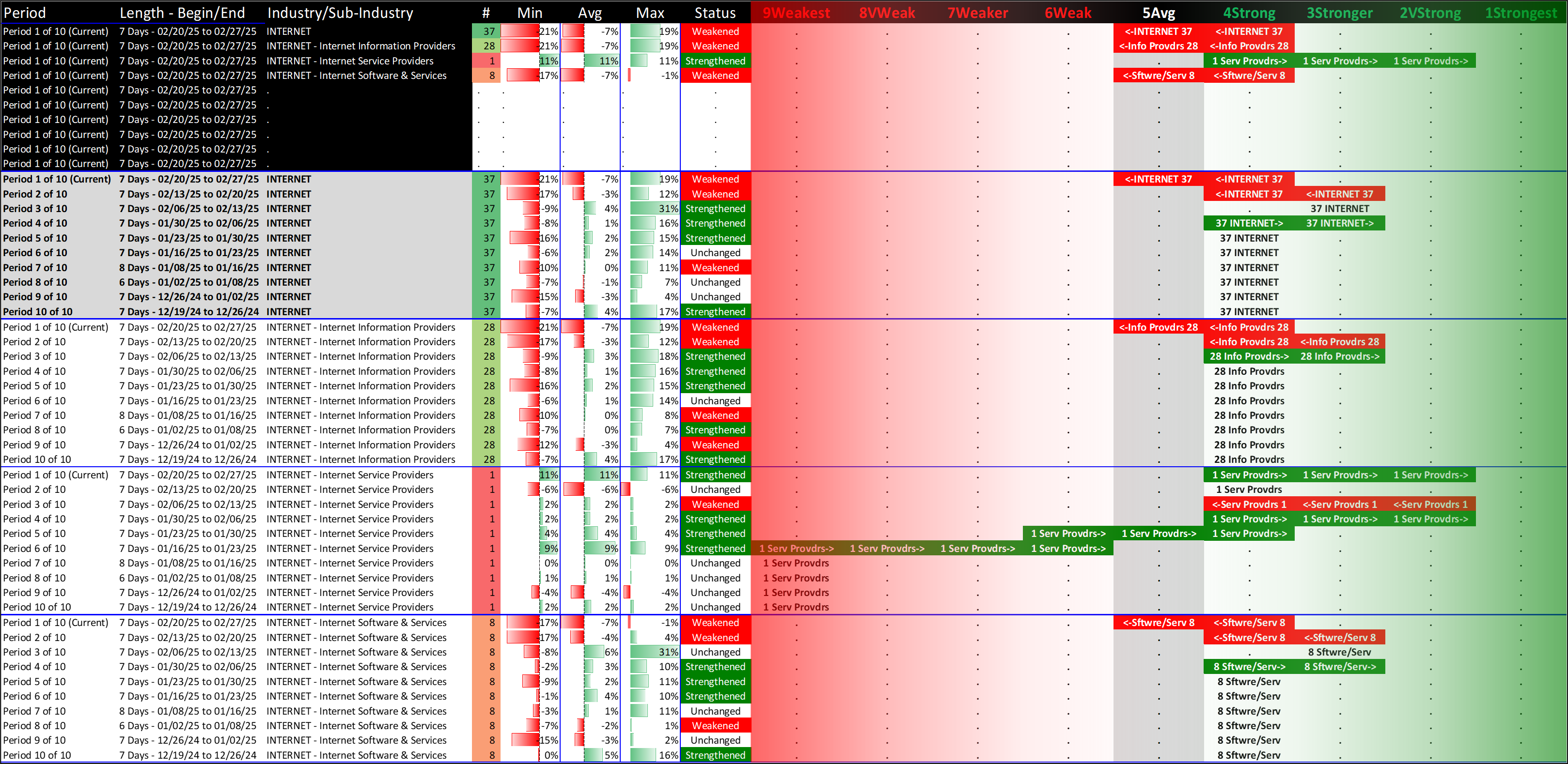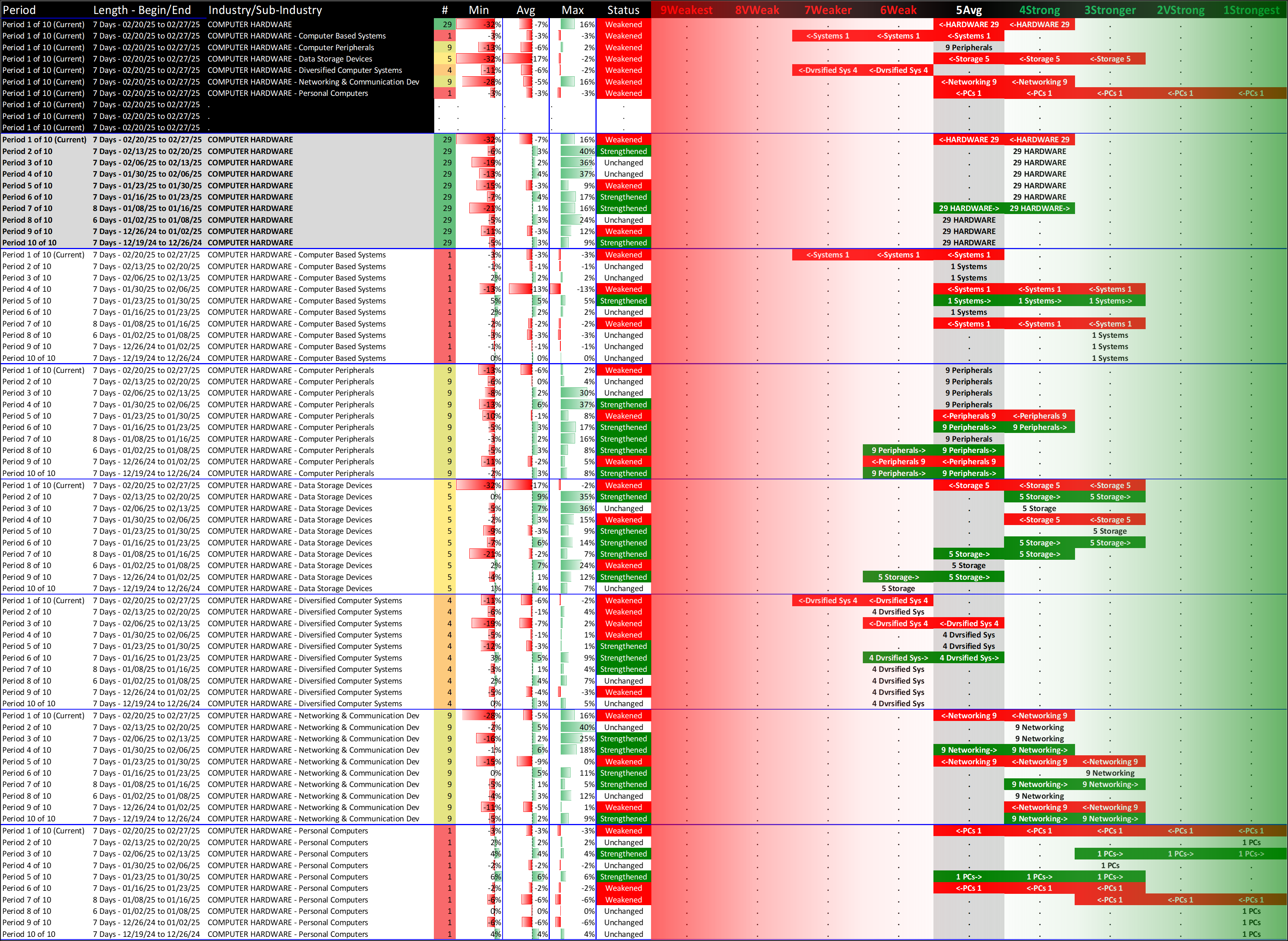 What: recent week-by-week strength changes for the industry and its sub-industries