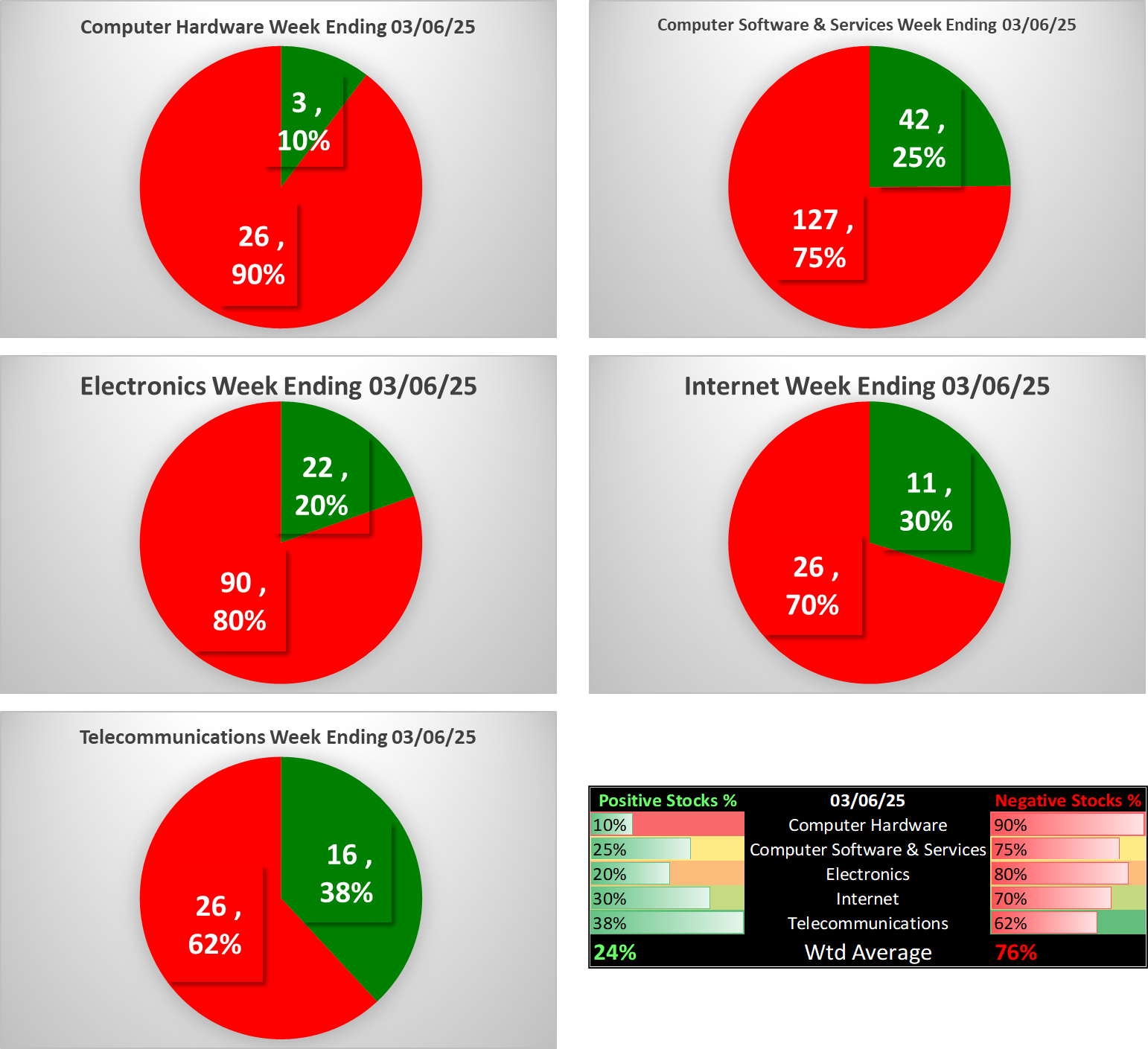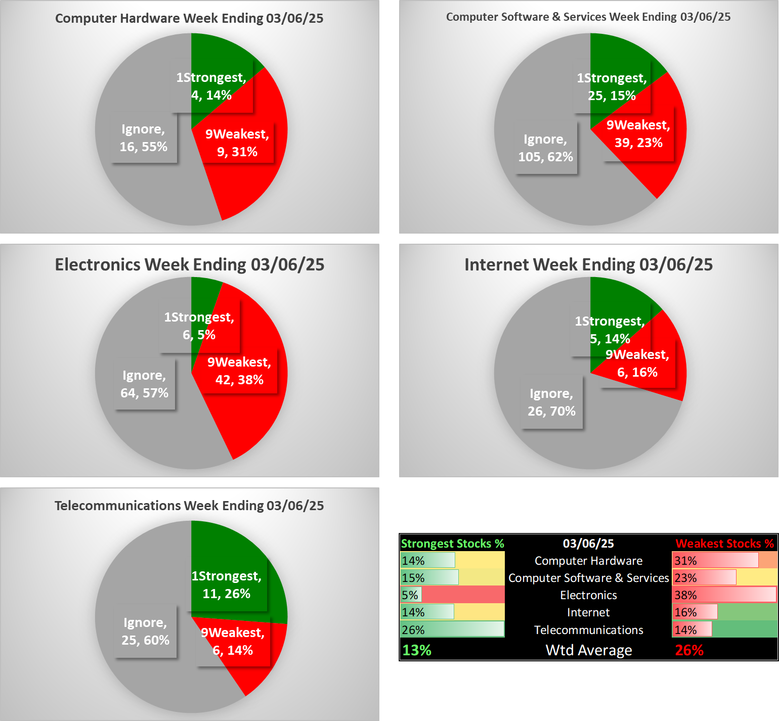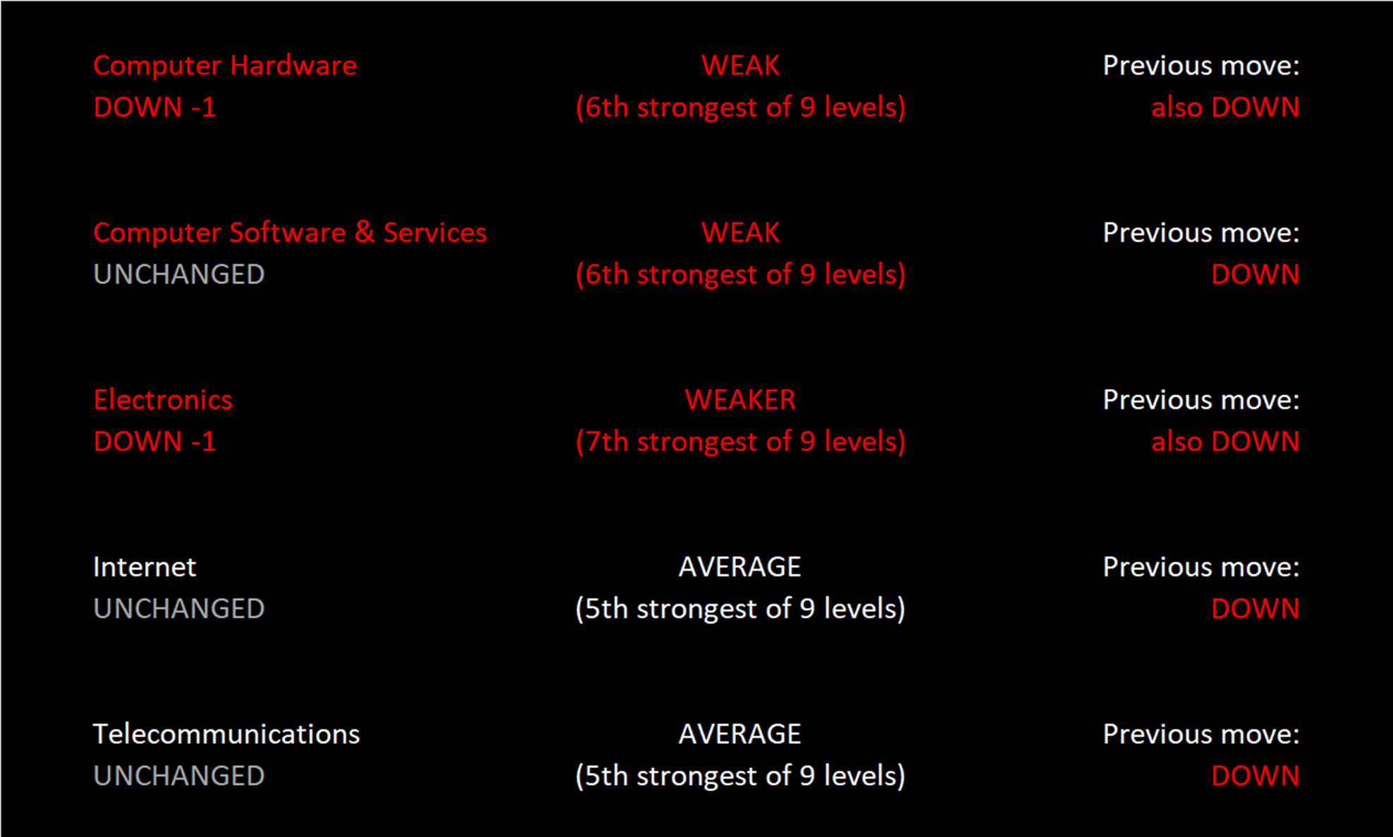 Electronics (Chips/Semis) weakened one rating this week to 7Weaker and is now the sector laggard. Internet and Telecommunications lead the sector, tied at 5Average.