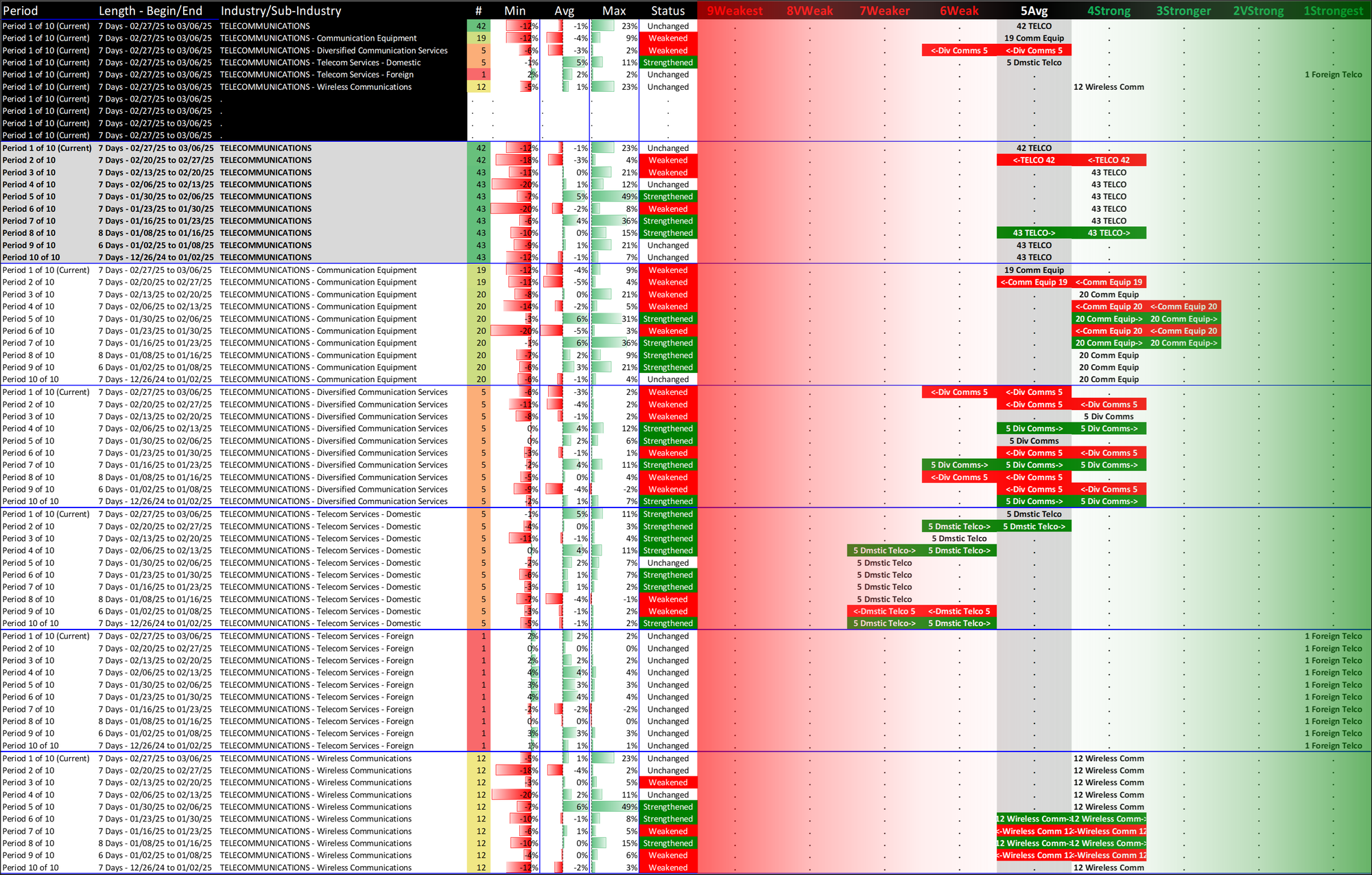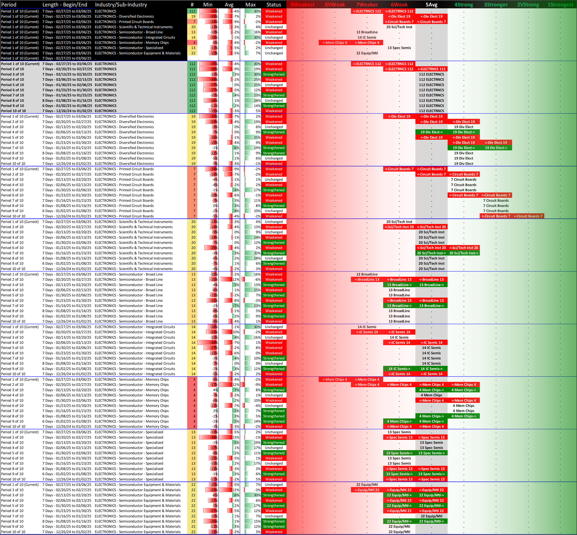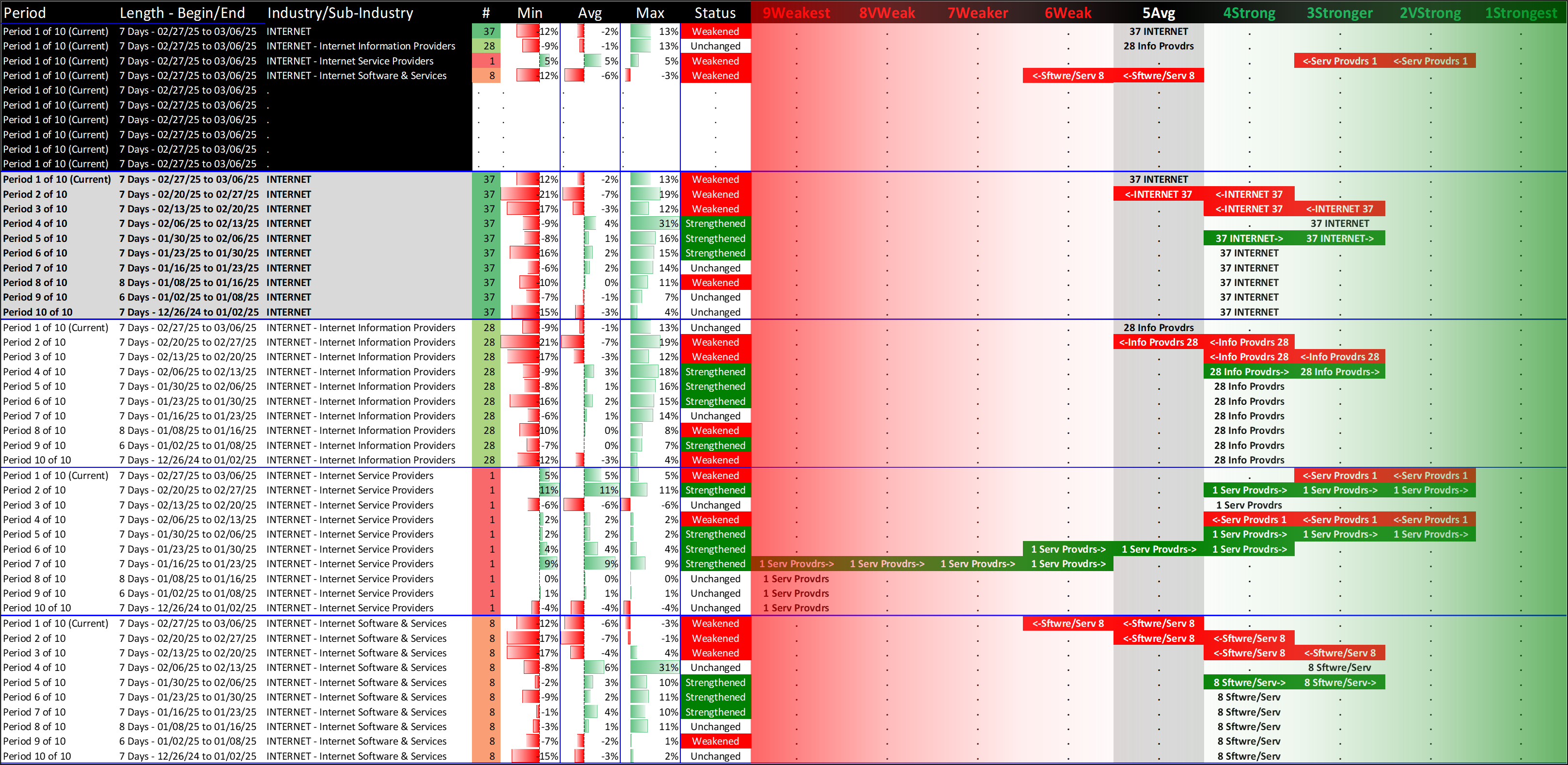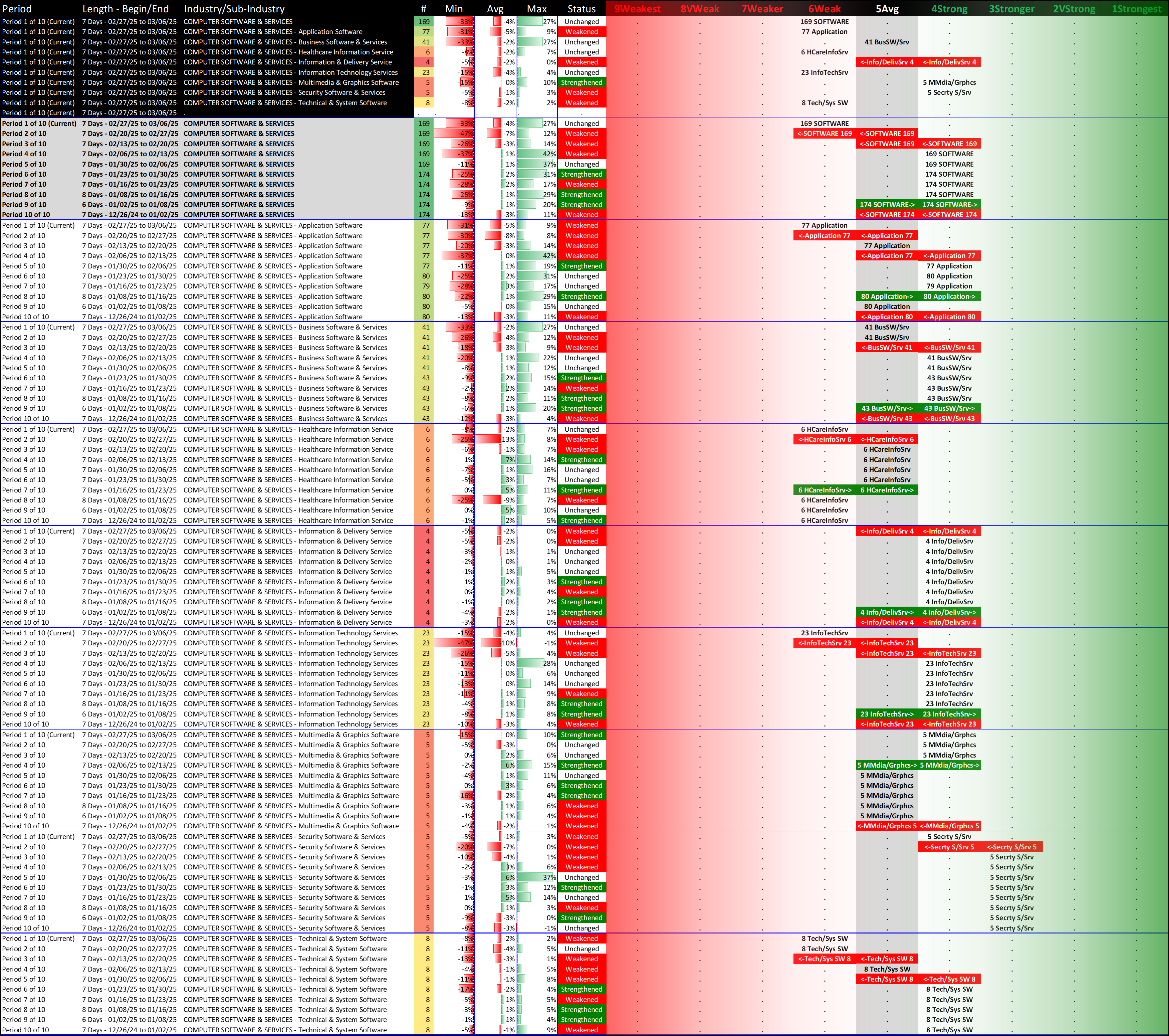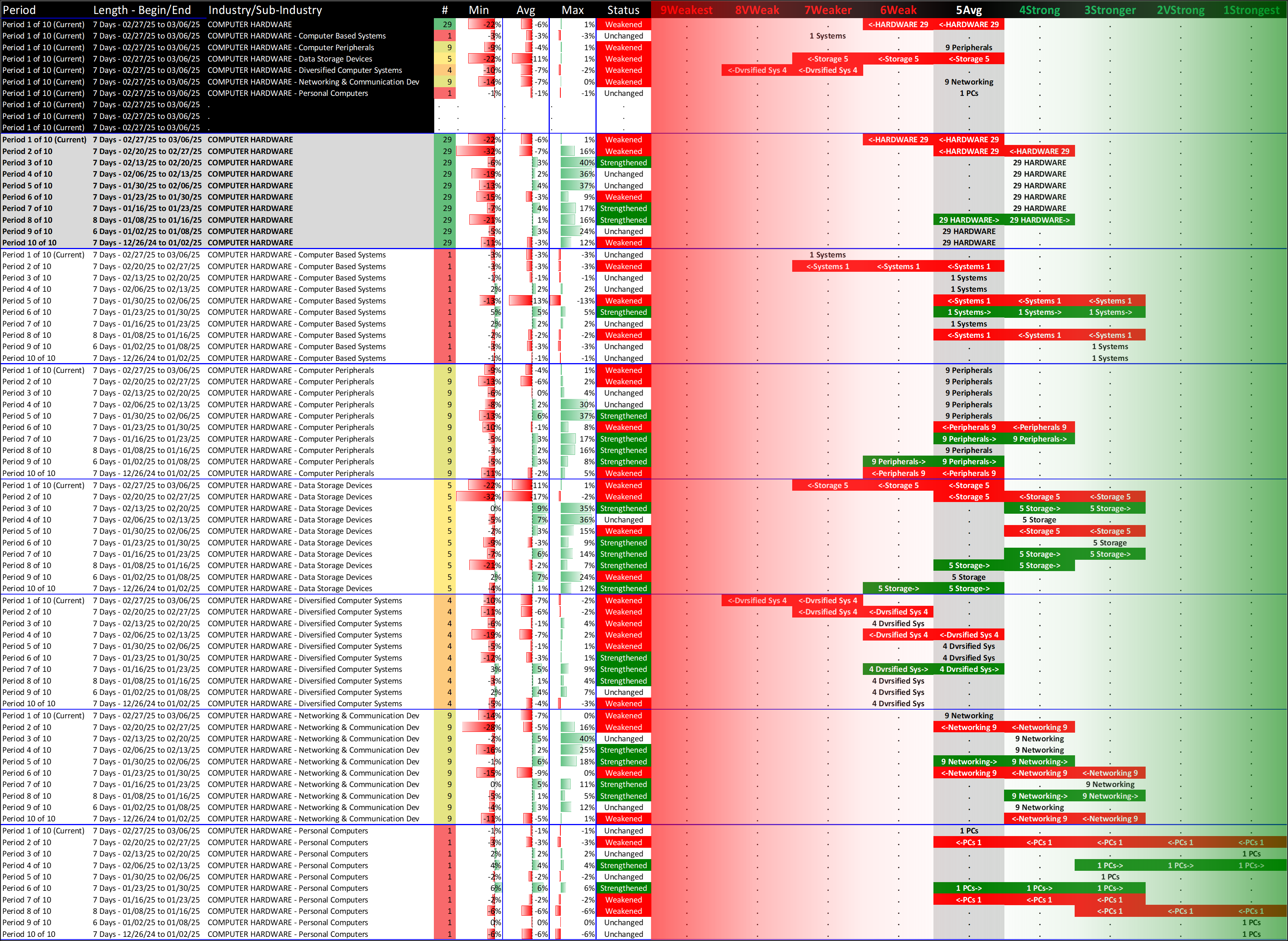 What: recent week-by-week strength changes for the industry and its sub-industries