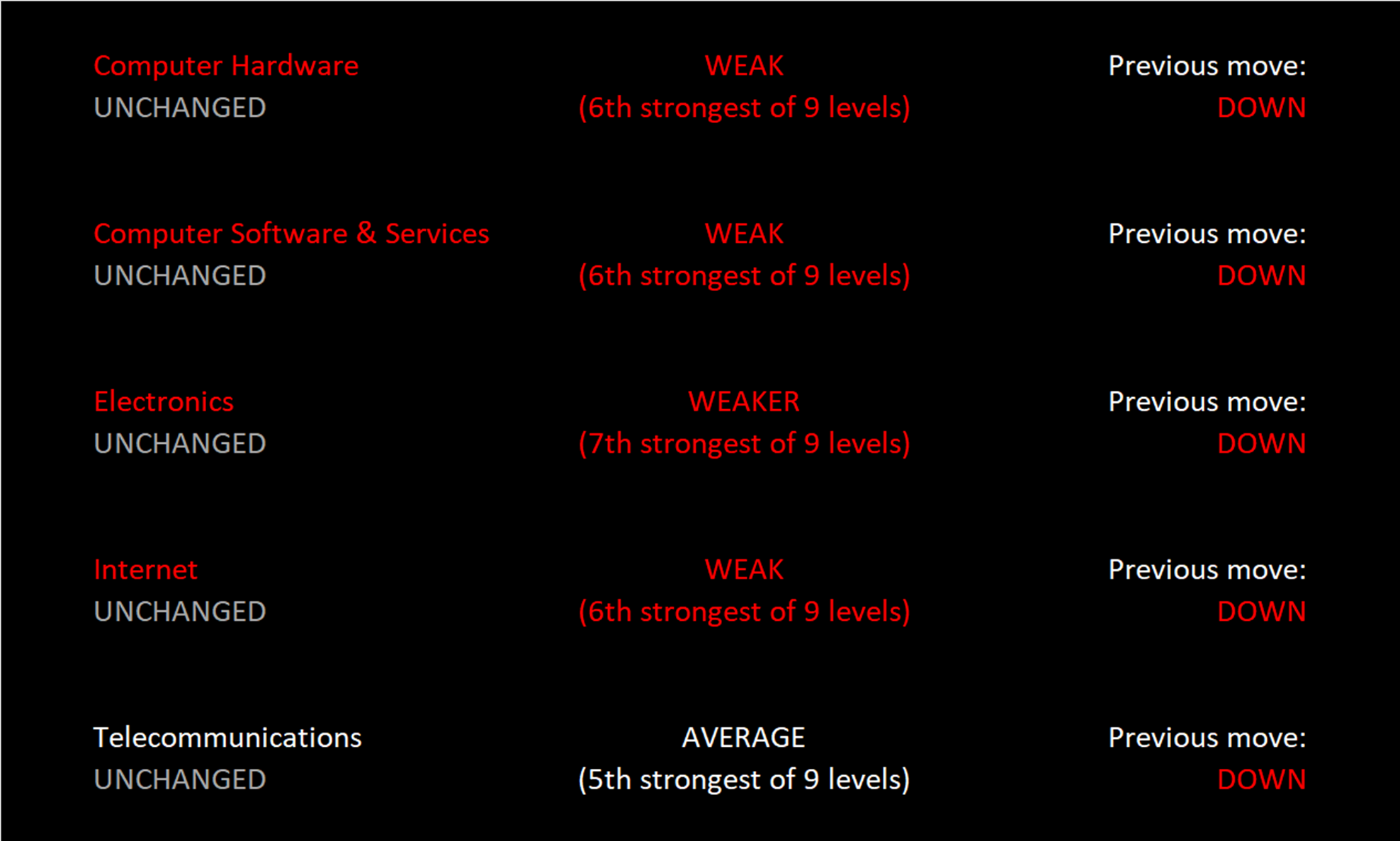 Electronics (Chips/Semis) is the sector laggard at 7Weaker. Telecommunications leads the sector at 5Average.