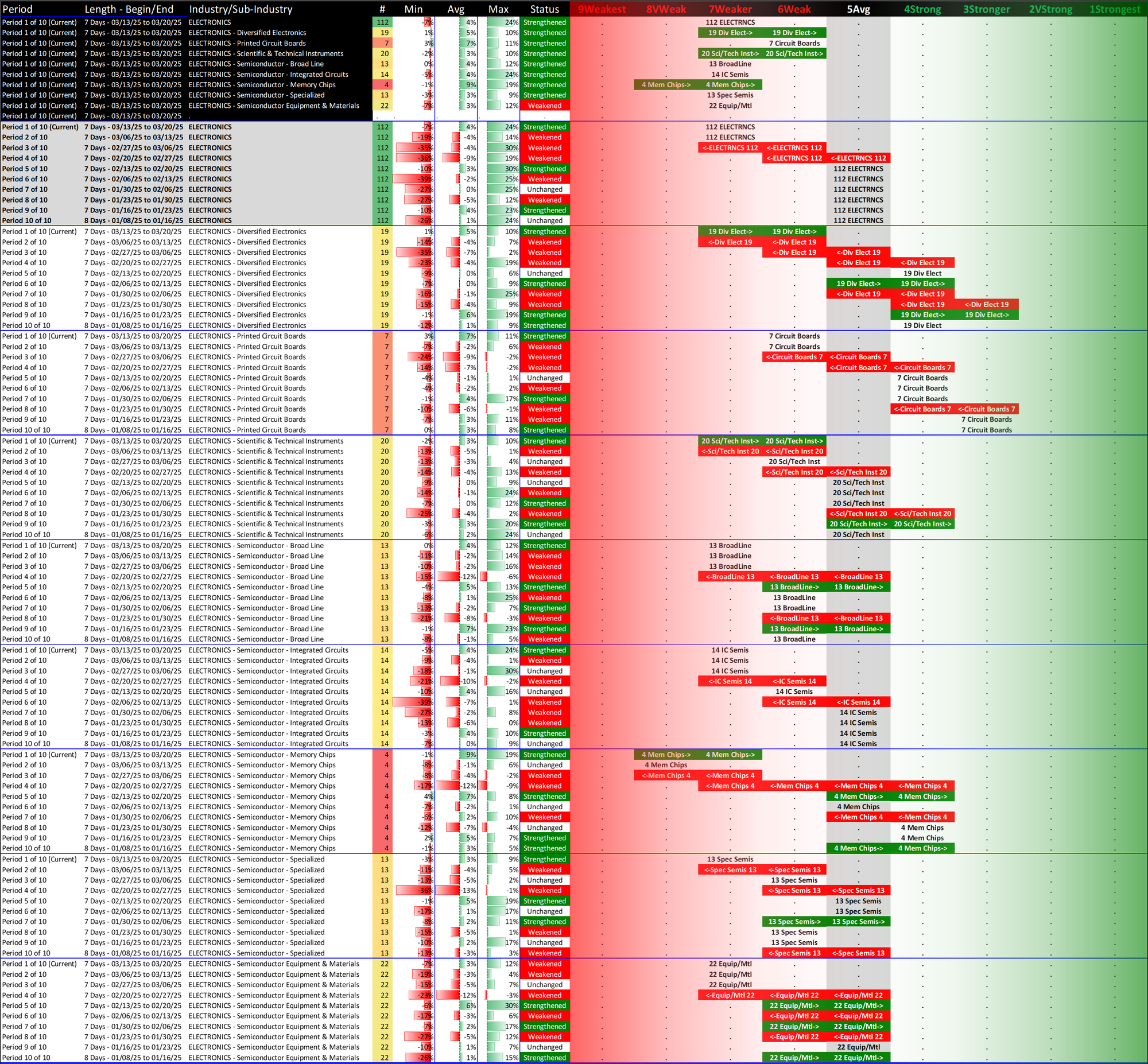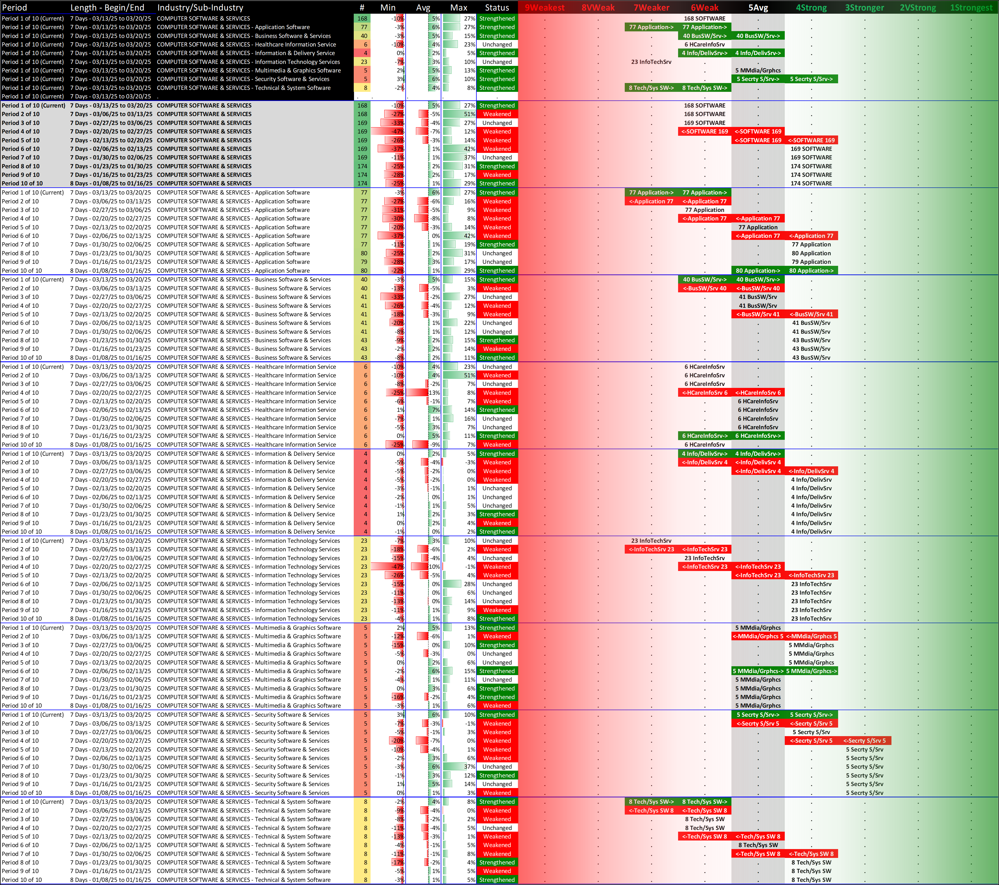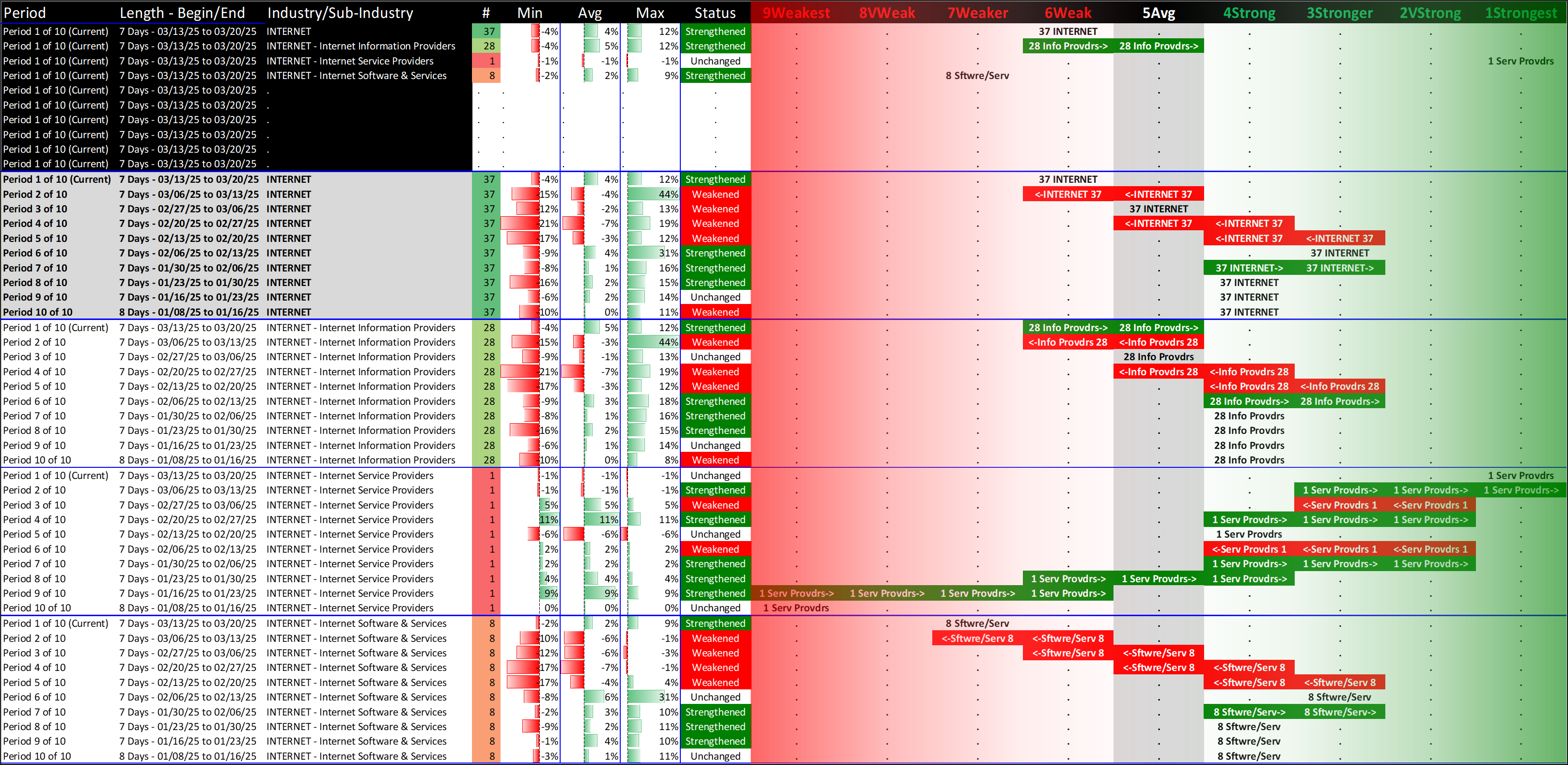 What: recent week-by-week strength changes for the industry and its sub-industries