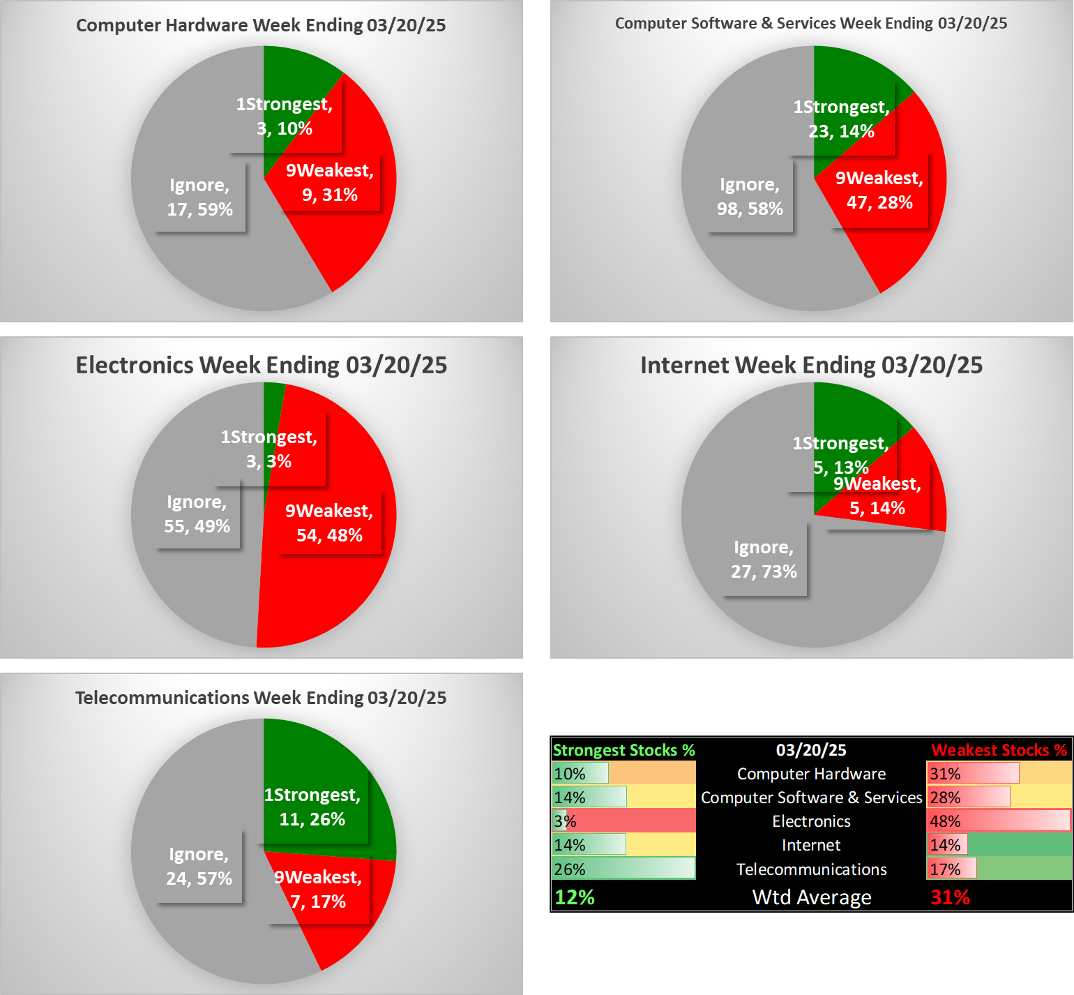 The Technology sector was unchanged this week but is at a below-average 6.2 overall rating. If at all interested in positions in this sector, it is better to go where there is strength/strengthening - as reflected by price. This Stock Market Organizer methodology explicitly reveals this.