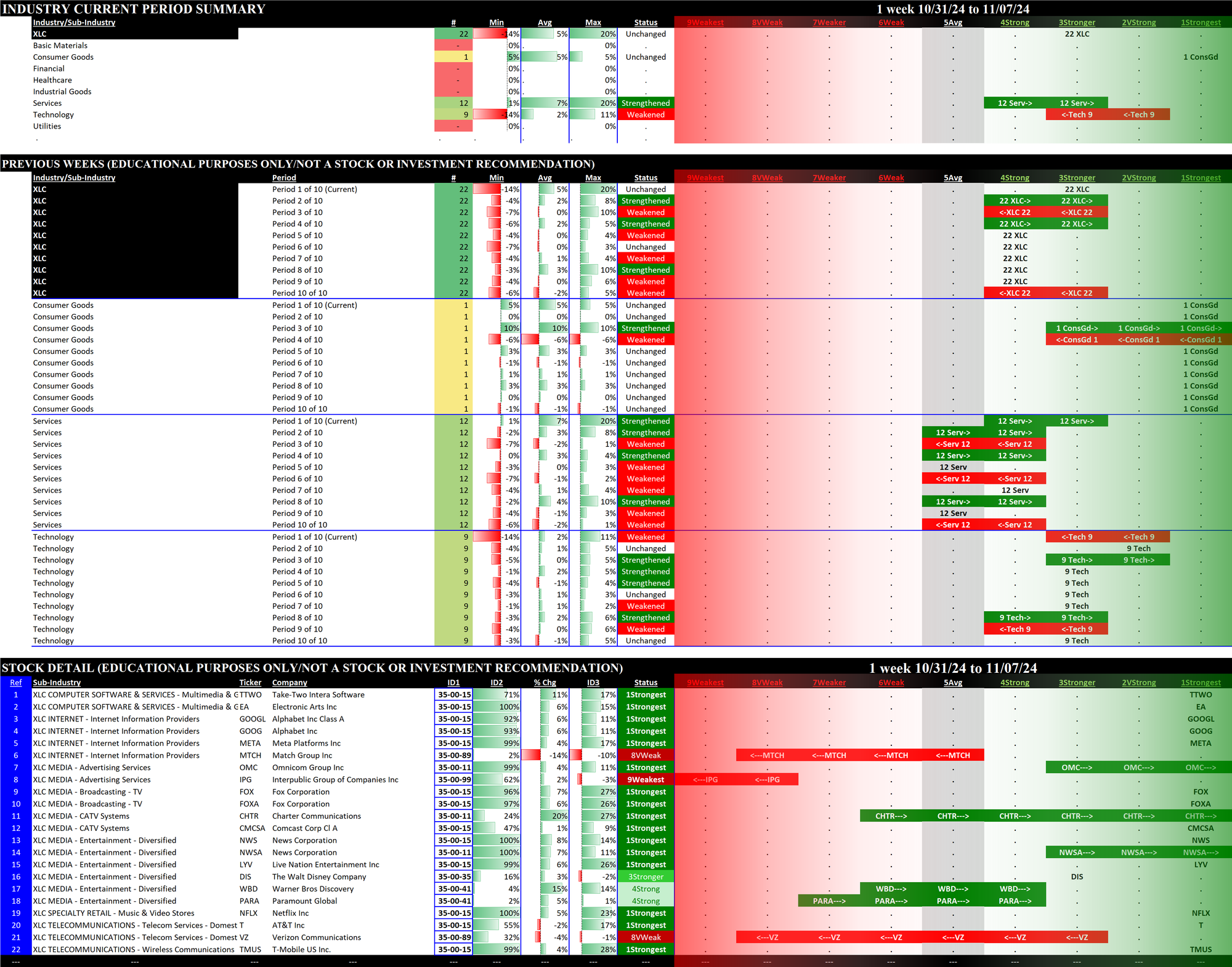 The lowest section shows stock-by-stock strength ratings, with stocks segregated by sub-industry. The green bars indicate stocks that strengthened rating during the week while the red bars indicate stocks that weakened rating during the week. Tickers not highlighted were unchanged for the week.