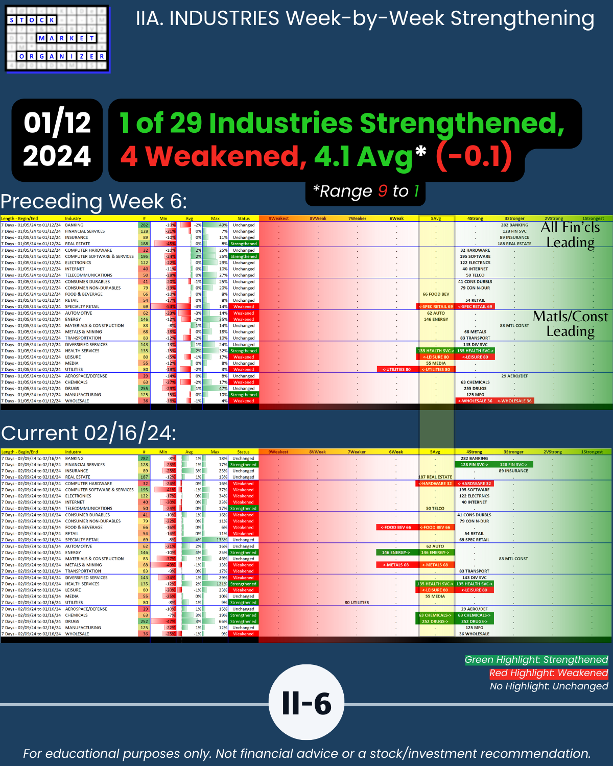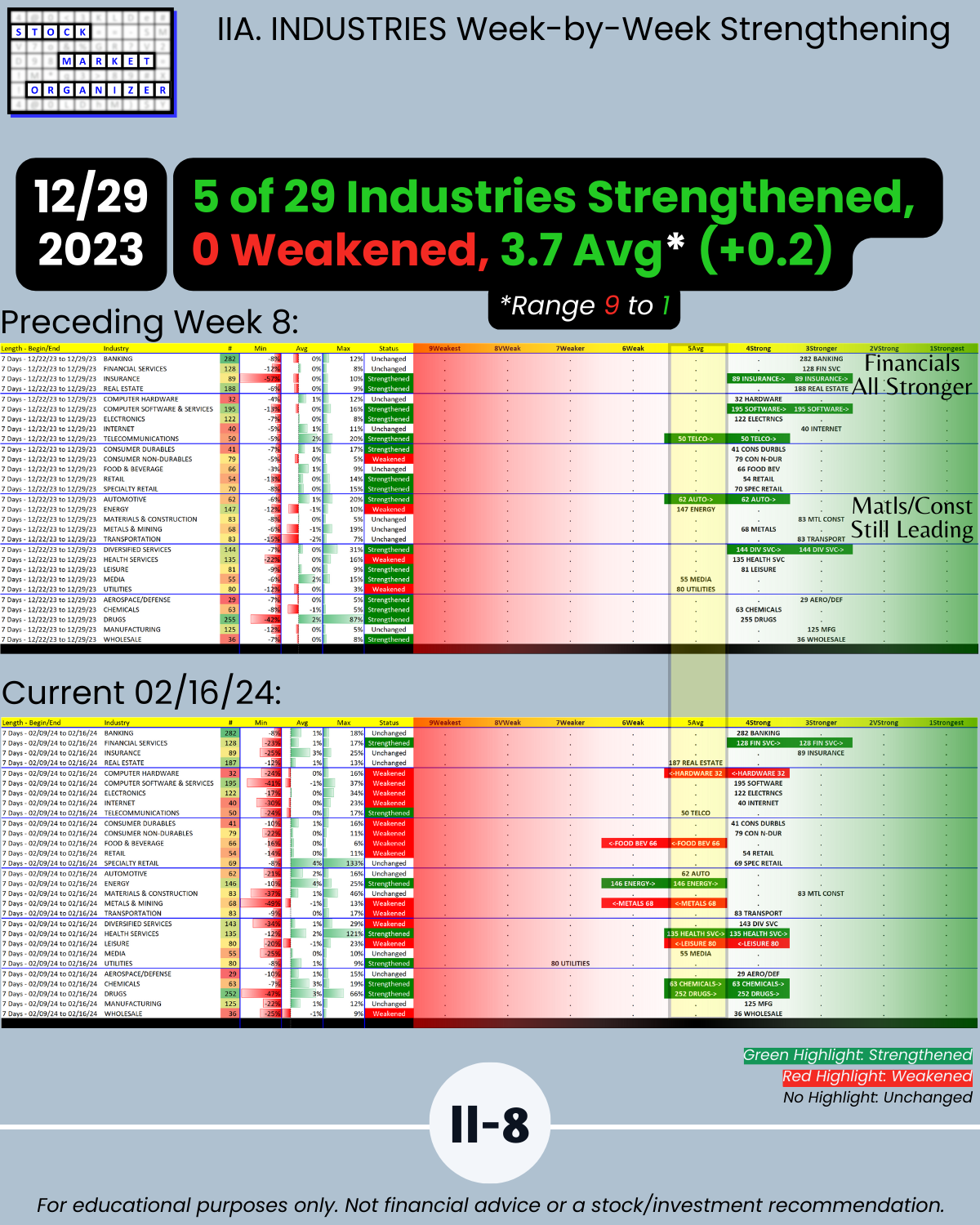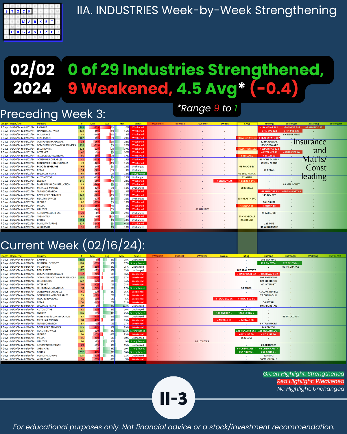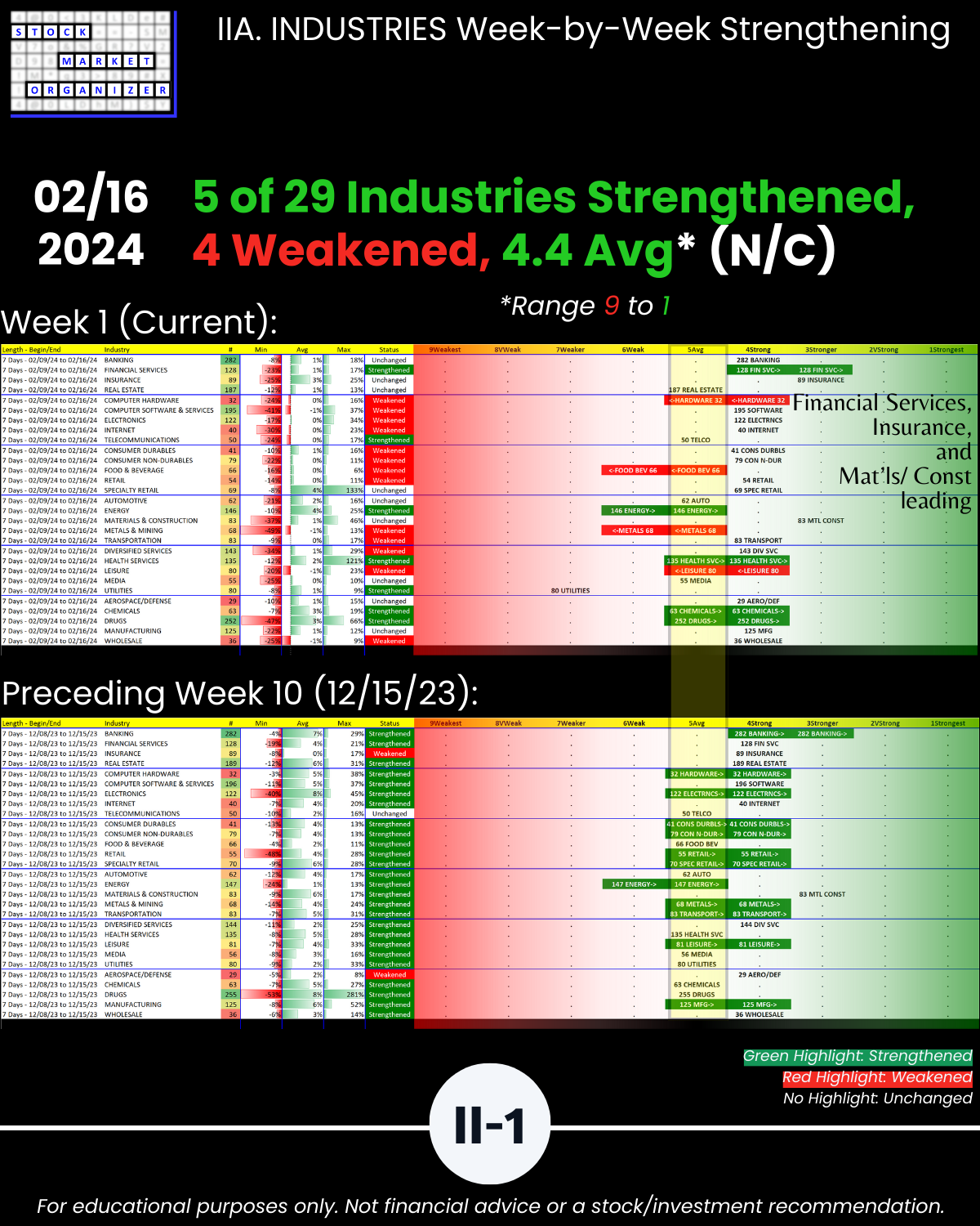 🔹 Financial Services, Insurance, and Materials & Construction = strongest industries at Stronger (3rd strongest of 9 levels)