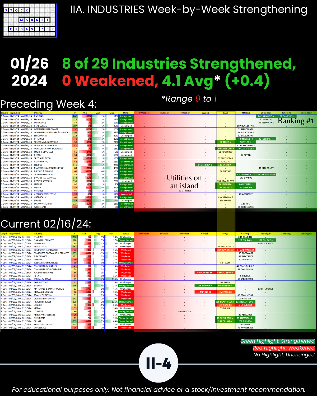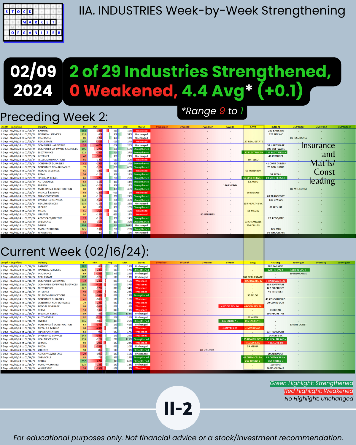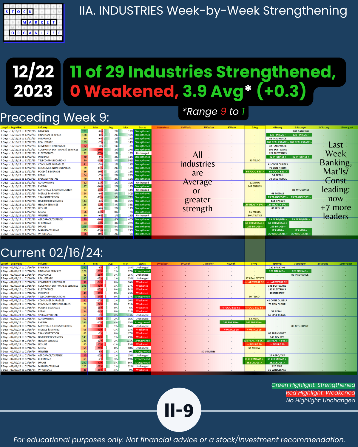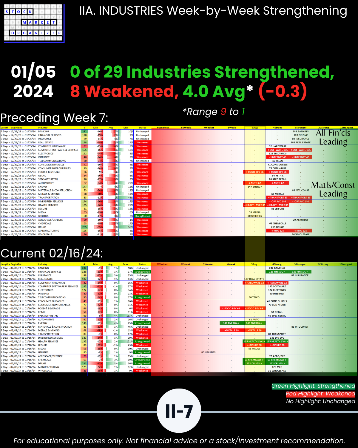🔹 Financial Services, Insurance, and Materials & Construction = strongest industries at Stronger (3rd strongest of 9 levels)