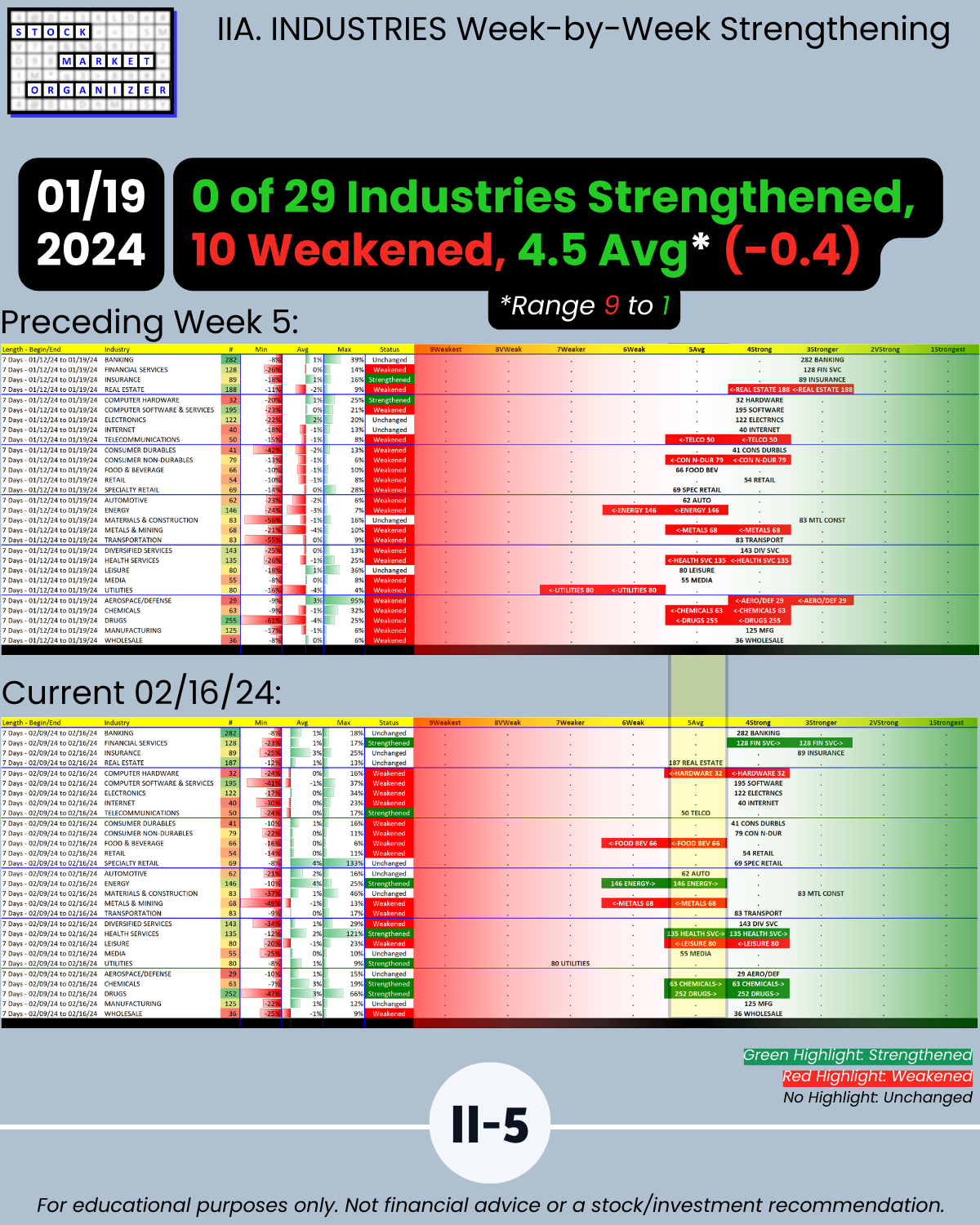🔹 5 of 29 industries strengthened, 4 weakened (2/0 previous week)